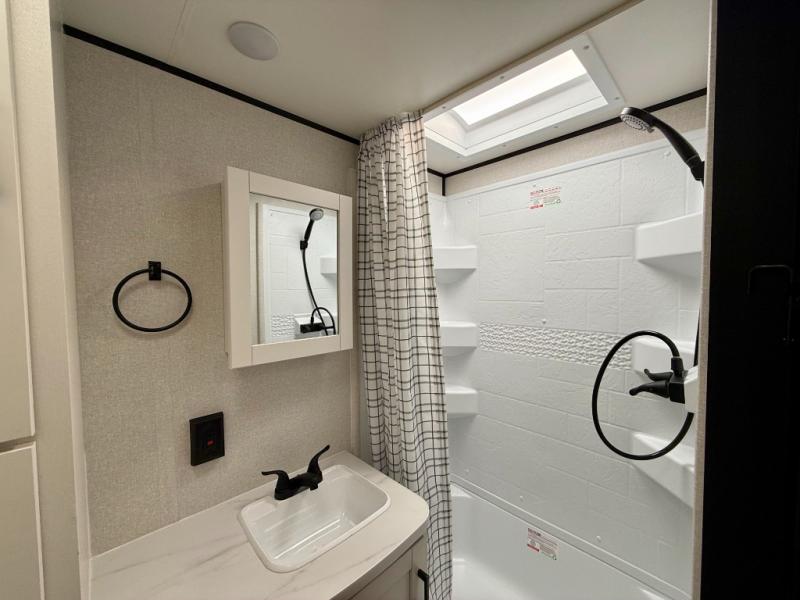 This travel trailer is perfect for weekend trips to the lake! Once you arrive at the campground, you can unload the exterior storage, put out the 18' power awning with LED lights, then relax in your camp chairs. Head inside to make lunch on the three-burner cooktop in the rear corner kitchen, and you'll find the full bath in the other rear corner for quick access. A booth dinette provides a place to dine together, and a theater seat within the large slide out is sure to bring comfort. This unit includes a queen bed in the front semi-private bedroom with a privacy curtain and dual wardrobes for your things!