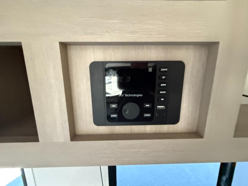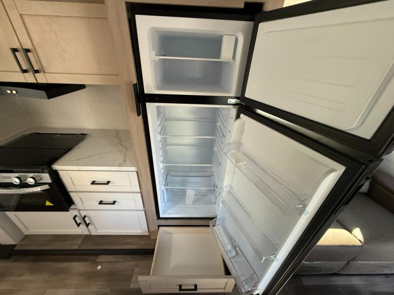 This travel trailer is perfect for weekend trips to the lake! Once you arrive at the campground, you can unload the exterior storage, put out the 18' power awning with LED lights, then relax in your camp chairs. Head inside to make lunch on the three-burner cooktop in the rear corner kitchen, and you'll find the full bath in the other rear corner for quick access. A booth dinette provides a place to dine together, and a theater seat within the large slide out is sure to bring comfort. This unit includes a queen bed in the front semi-private bedroom with a privacy curtain and dual wardrobes for your things!
