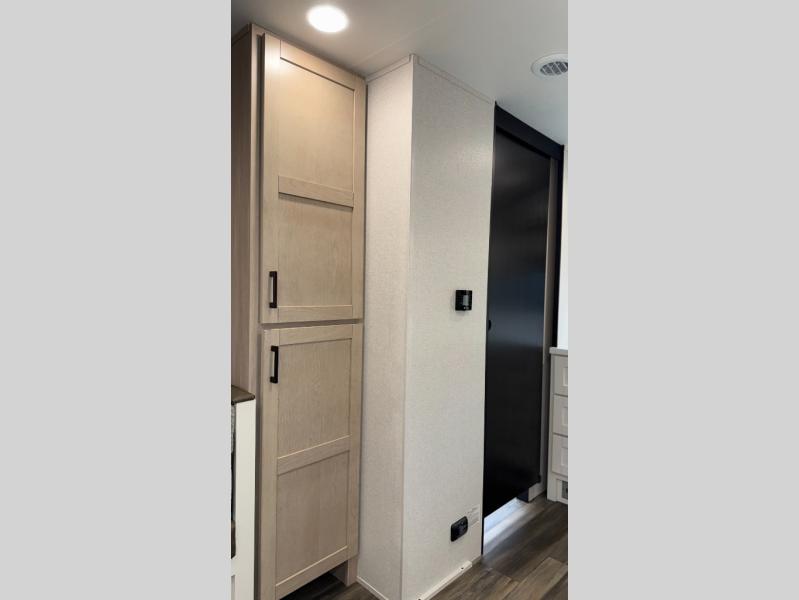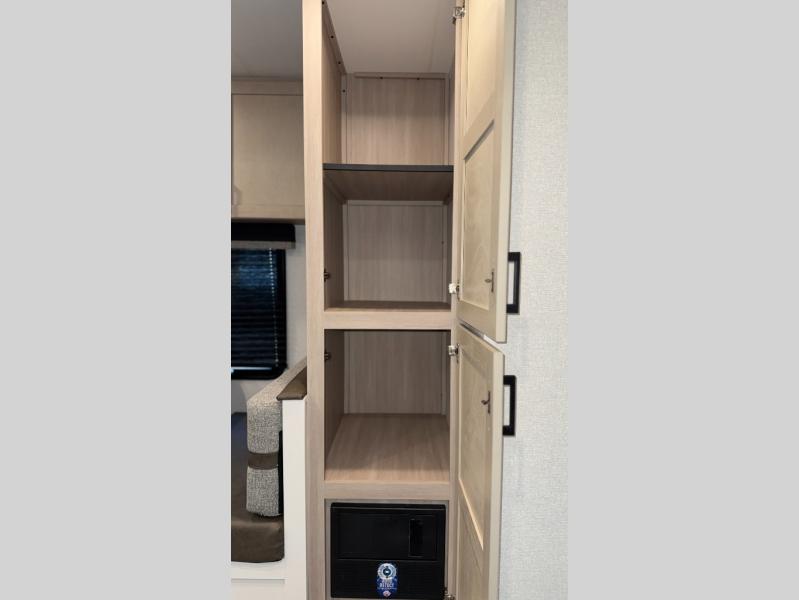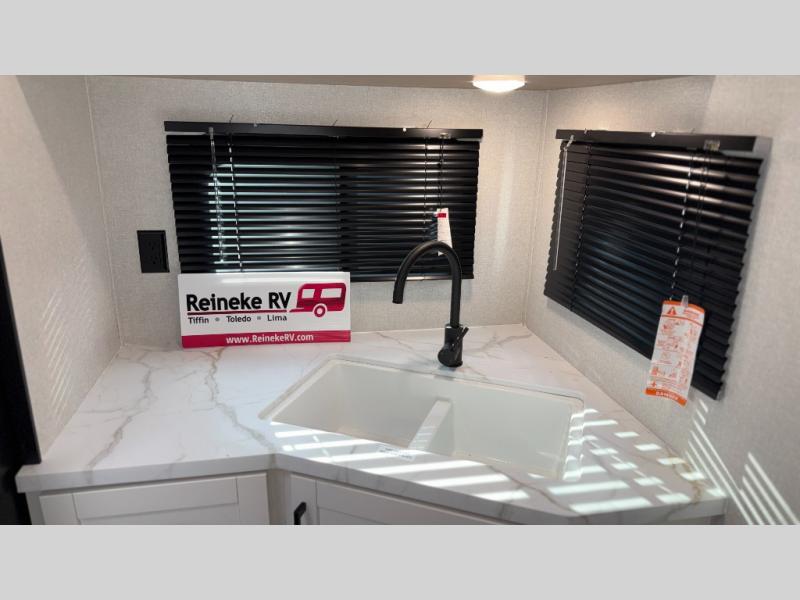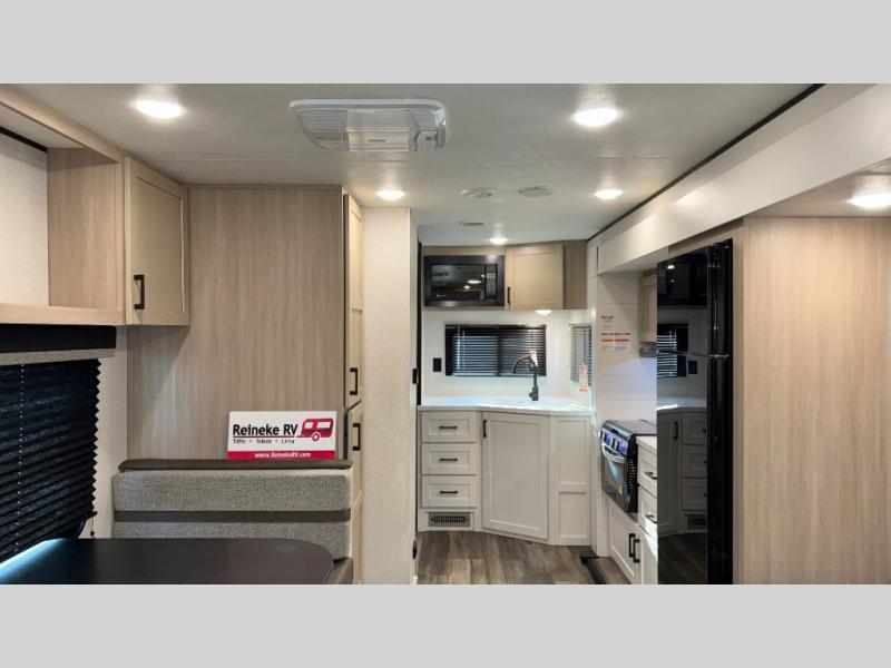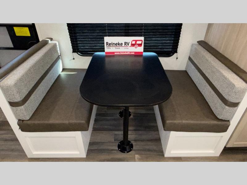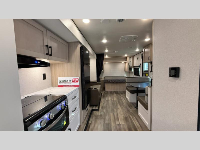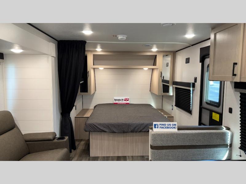 This travel trailer is perfect for weekend trips to the lake! Once you arrive at the campground, you can unload the exterior storage, put out the 18' power awning with LED lights, then relax in your camp chairs. Head inside to make lunch on the three-burner cooktop in the rear corner kitchen, and you'll find the full bath in the other rear corner for quick access. A booth dinette provides a place to dine together, and a theater seat within the large slide out is sure to bring comfort. This unit includes a queen bed in the front semi-private bedroom with a privacy curtain and dual wardrobes for your things!