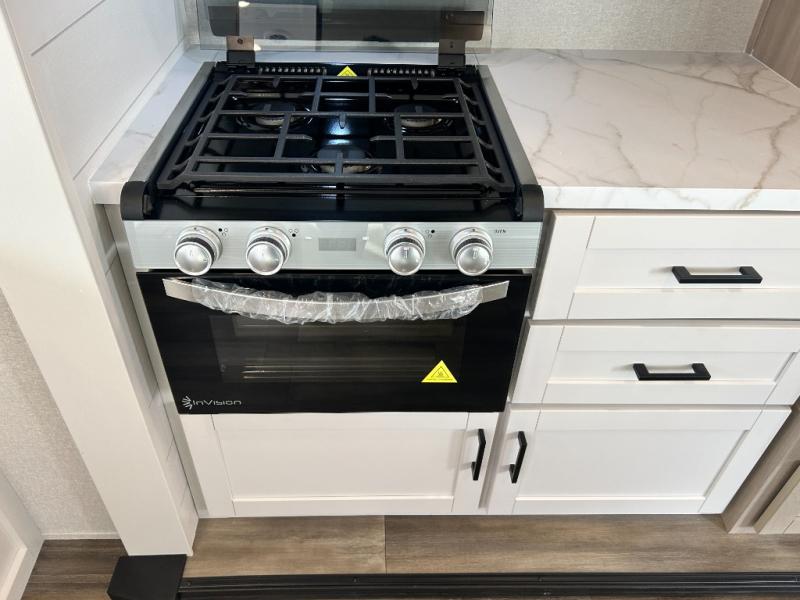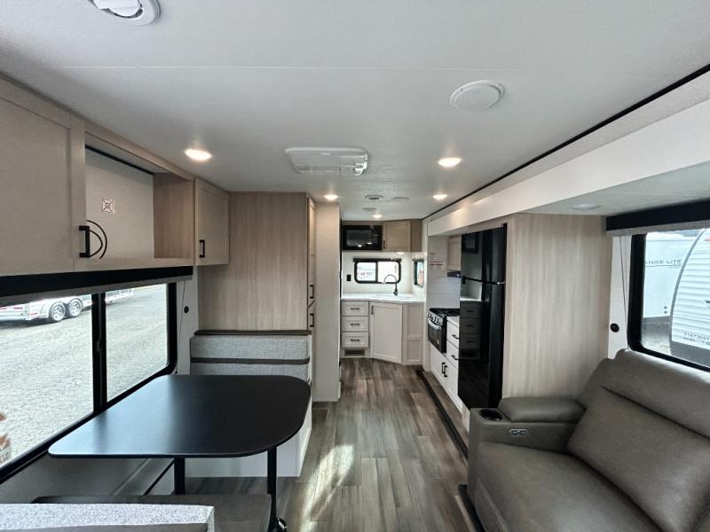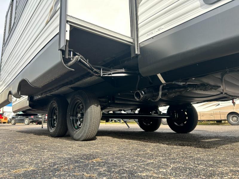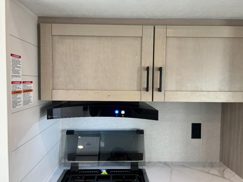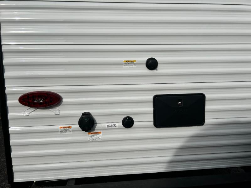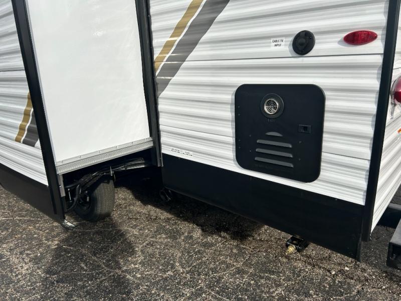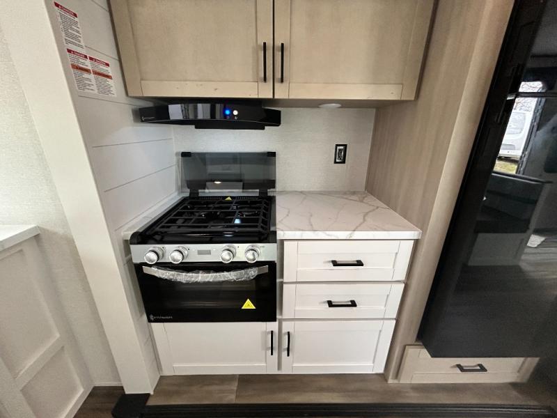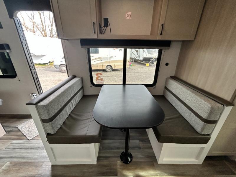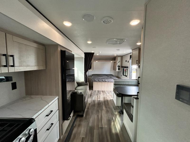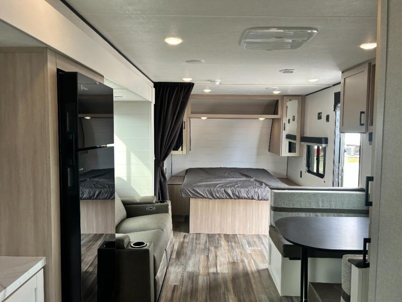 This travel trailer is perfect for weekend trips to the lake! Once you arrive at the campground, you can unload the exterior storage, put out the 18' power awning with LED lights, then relax in your camp chairs. Head inside to make lunch on the three-burner cooktop in the rear corner kitchen, and you'll find the full bath in the other rear corner for quick access. A booth dinette provides a place to dine together, and a theater seat within the large slide out is sure to bring comfort. This unit includes a queen bed in the front semi-private bedroom with a privacy curtain and dual wardrobes for your things!