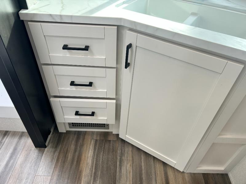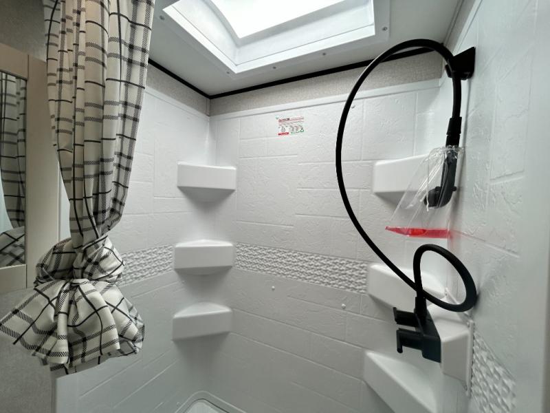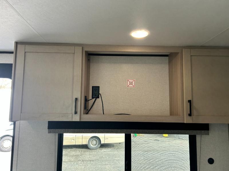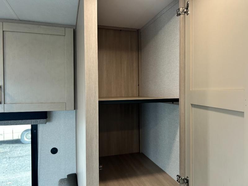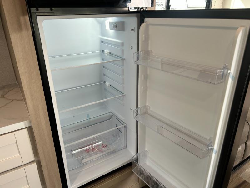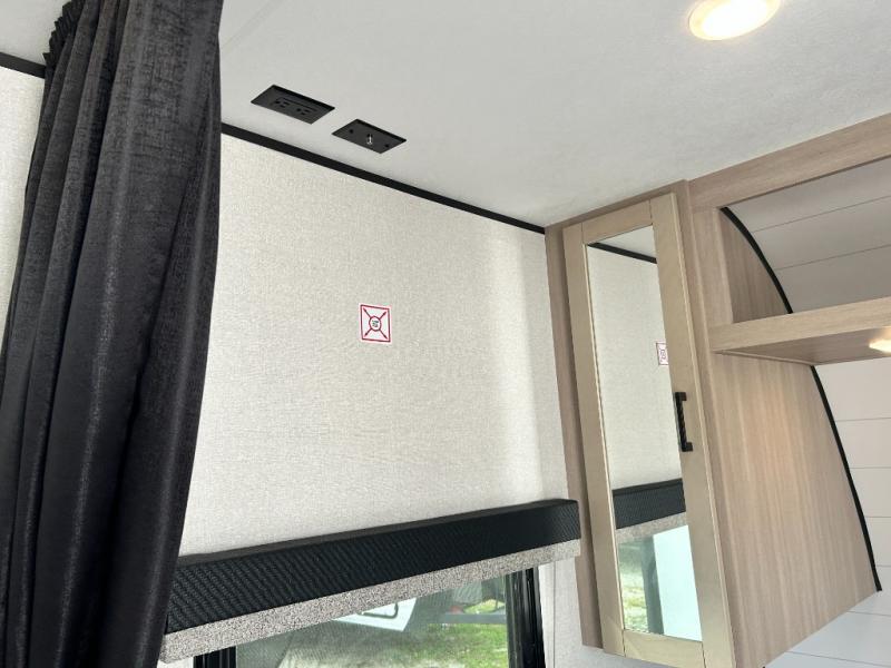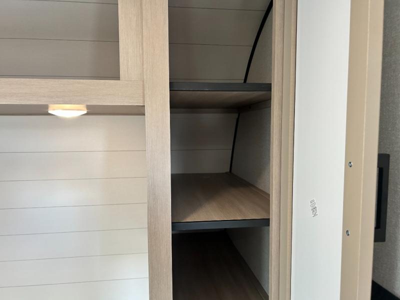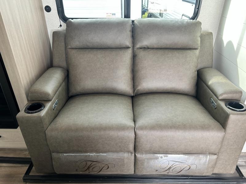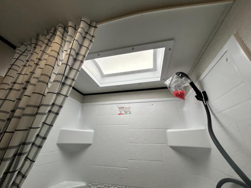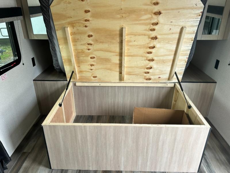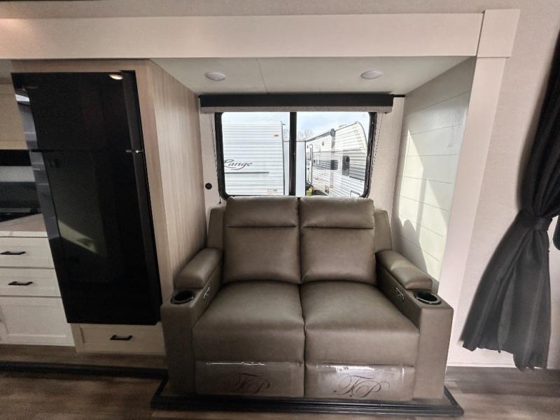 This travel trailer is perfect for weekend trips to the lake! Once you arrive at the campground, you can unload the exterior storage, put out the 18' power awning with LED lights, then relax in your camp chairs. Head inside to make lunch on the three-burner cooktop in the rear corner kitchen, and you'll find the full bath in the other rear corner for quick access. A booth dinette provides a place to dine together, and a theater seat within the large slide out is sure to bring comfort. This unit includes a queen bed in the front semi-private bedroom with a privacy curtain and dual wardrobes for your things!