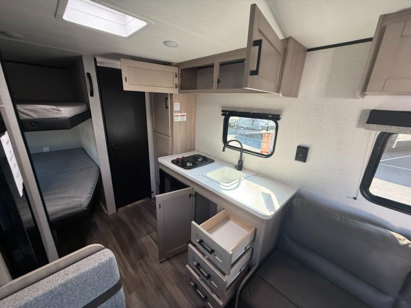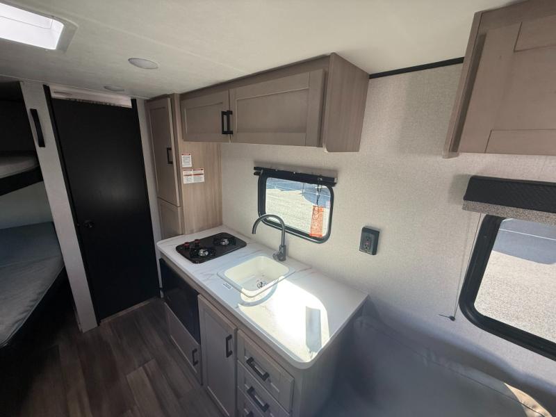 If you enjoy camping with a larger group, this travel trailer is perfect for you! There are double-size bunks in the back, which are right next to the private bath with a toilet and 40" shower. You can take the front queen bed with dual wardrobes, and any other guests can convert the sofa and booth dinette to sleeping space. A two-burner cooktop will let you make breakfast for everyone in the morning, and a 12V refrigerator will keep your perishables fresh!