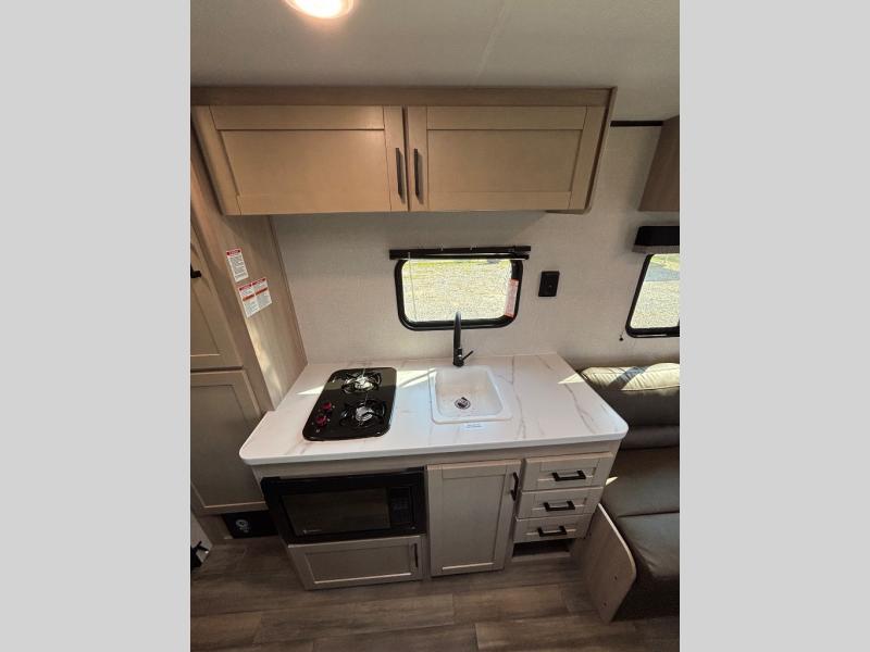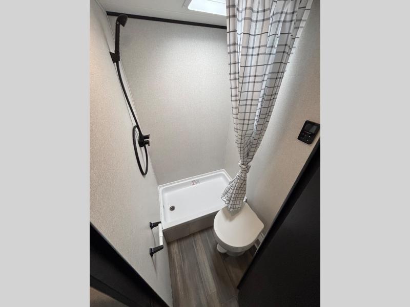 If you enjoy camping with a larger group, this travel trailer is perfect for you! There are double-size bunks in the back, which are right next to the private bath with a toilet and 40" shower. You can take the front queen bed with dual wardrobes, and any other guests can convert the sofa and booth dinette to sleeping space. A two-burner cooktop will let you make breakfast for everyone in the morning, and a 12V refrigerator will keep your perishables fresh!