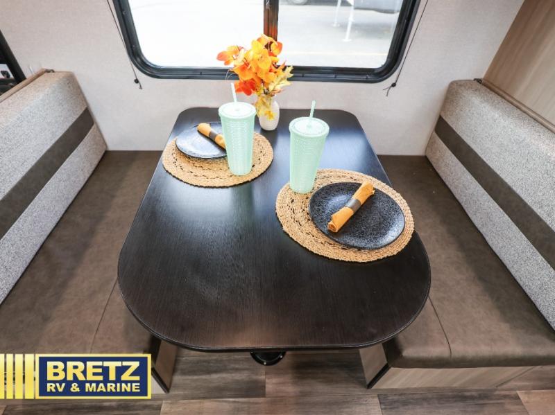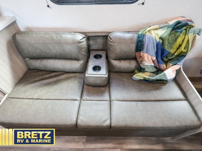 If you enjoy camping with a larger group, this travel trailer is perfect for you! There are double-size bunks in the back, which are right next to the private bath with a toilet and 40" shower. You can take the front queen bed with dual wardrobes, and any other guests can convert the sofa and booth dinette to sleeping space. A two-burner cooktop will let you make breakfast for everyone in the morning, and a 12V refrigerator will keep your perishables fresh!
