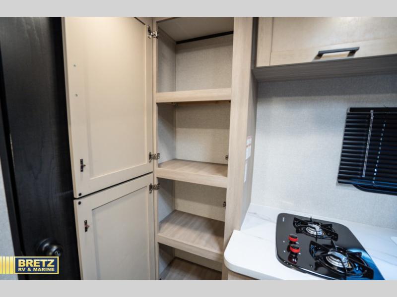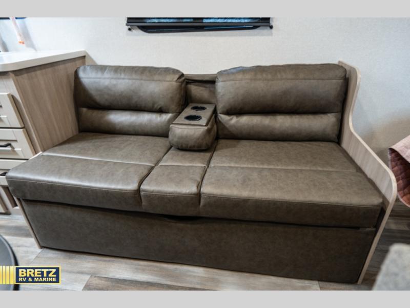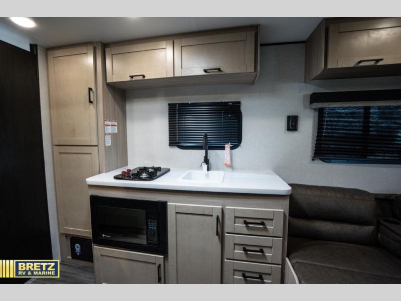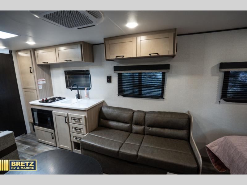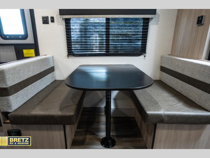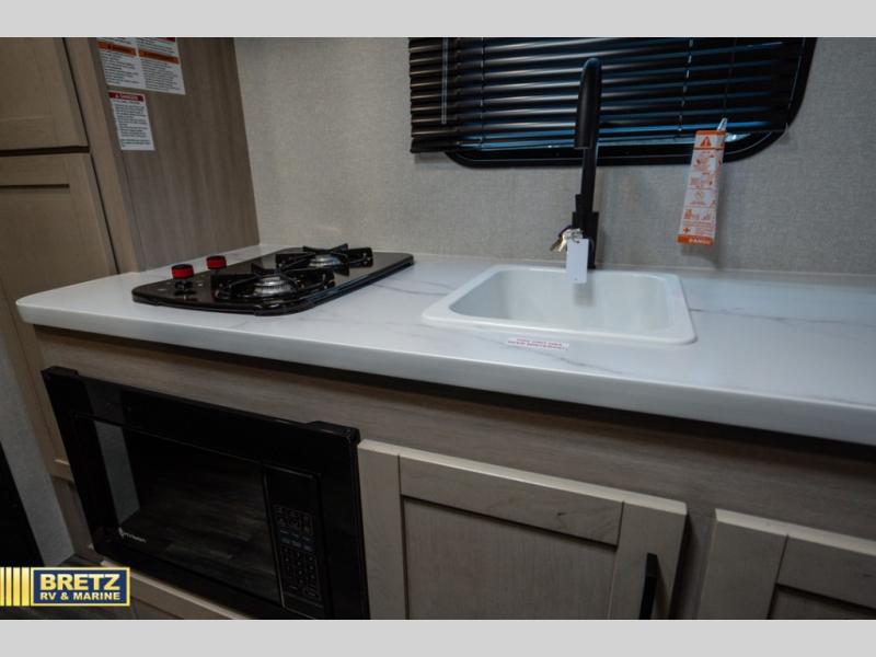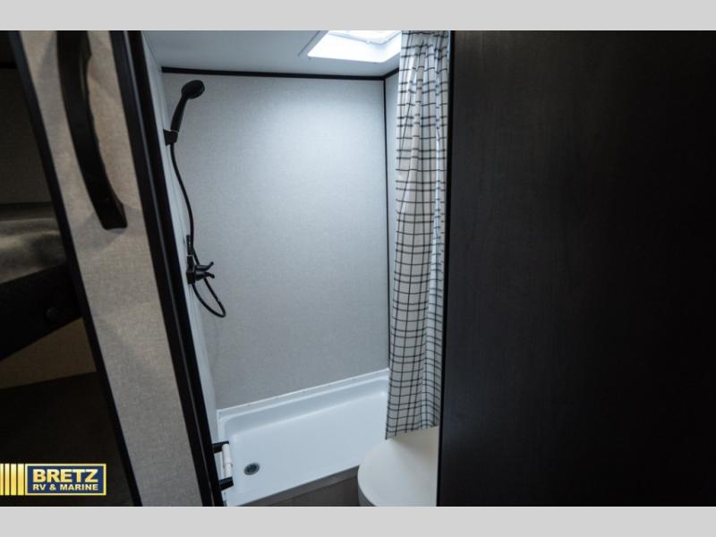 If you enjoy camping with a larger group, this travel trailer is perfect for you! There are double-size bunks in the back, which are right next to the private bath with a toilet and 40" shower. You can take the front queen bed with dual wardrobes, and any other guests can convert the sofa and booth dinette to sleeping space. A two-burner cooktop will let you make breakfast for everyone in the morning, and a 12V refrigerator will keep your perishables fresh!