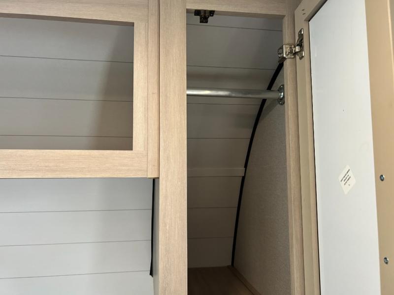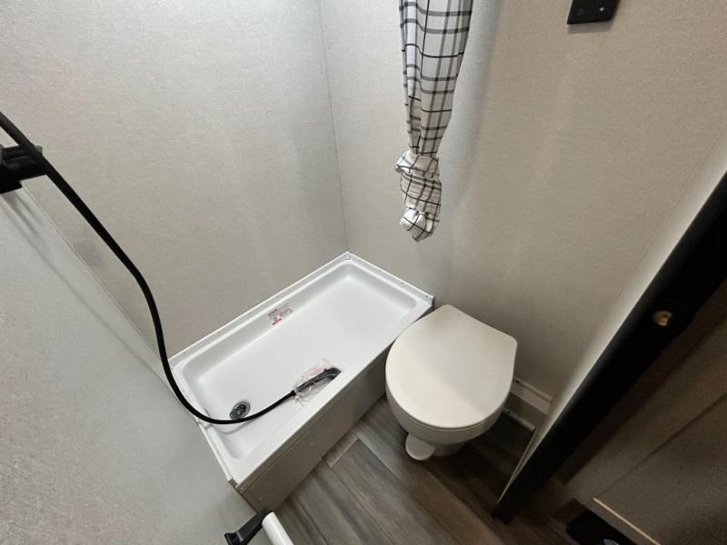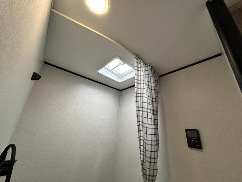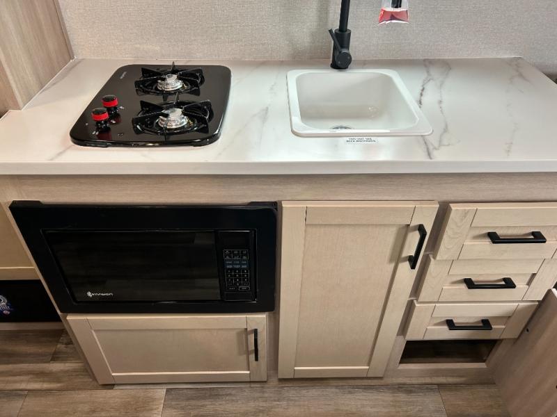 If you enjoy camping with a larger group, this travel trailer is perfect for you! There are double-size bunks in the back, which are right next to the private bath with a toilet and 40" shower. You can take the front queen bed with dual wardrobes, and any other guests can convert the sofa and booth dinette to sleeping space. A two-burner cooktop will let you make breakfast for everyone in the morning, and a 12V refrigerator will keep your perishables fresh!