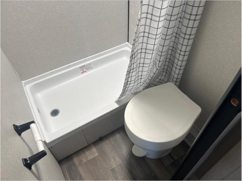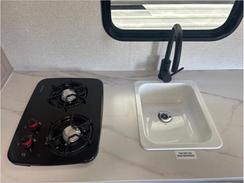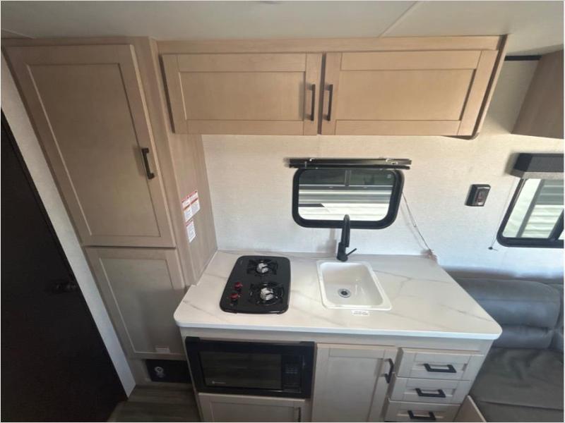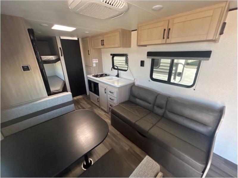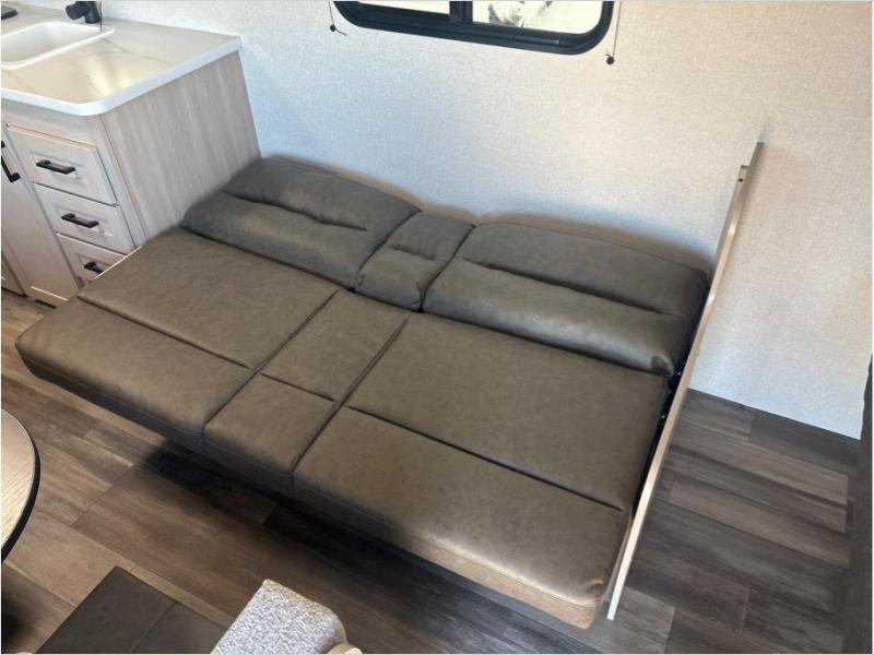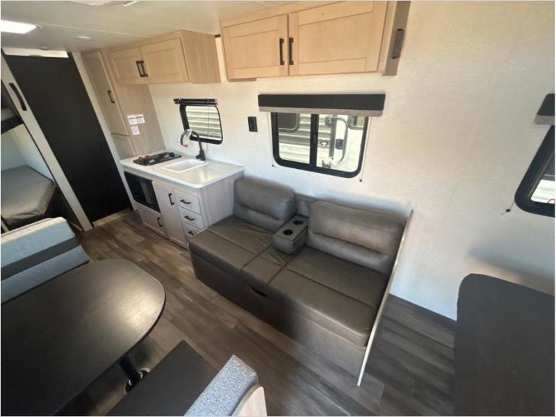 If you enjoy camping with a larger group, this travel trailer is perfect for you! There are double-size bunks in the back, which are right next to the private bath with a toilet and 40" shower. You can take the front queen bed with dual wardrobes, and any other guests can convert the sofa and booth dinette to sleeping space. A two-burner cooktop will let you make breakfast for everyone in the morning, and a 12V refrigerator will keep your perishables fresh!