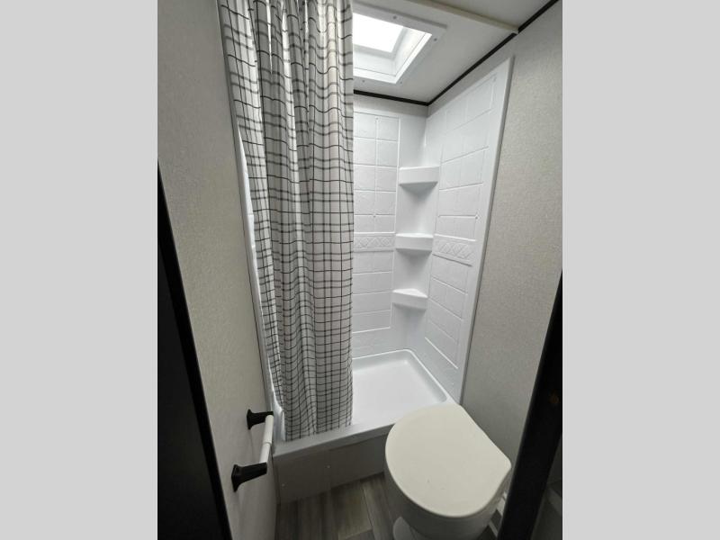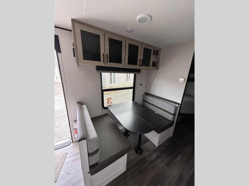 If you enjoy camping with a larger group, this travel trailer is perfect for you! There are double-size bunks in the back, which are right next to the private bath with a toilet and 40" tub/shower. You can take the front RV queen bed with dual wardrobes and a privacy curtain, and any other guests can convert the sofa and booth dinette to sleeping space. A three-burner cooktop will let you make breakfast for everyone in the morning, and a 12V refrigerator will keep your perishables fresh!