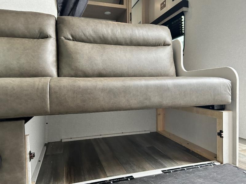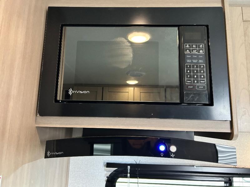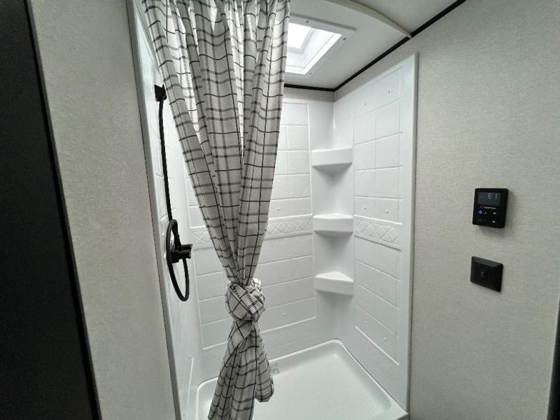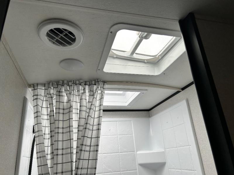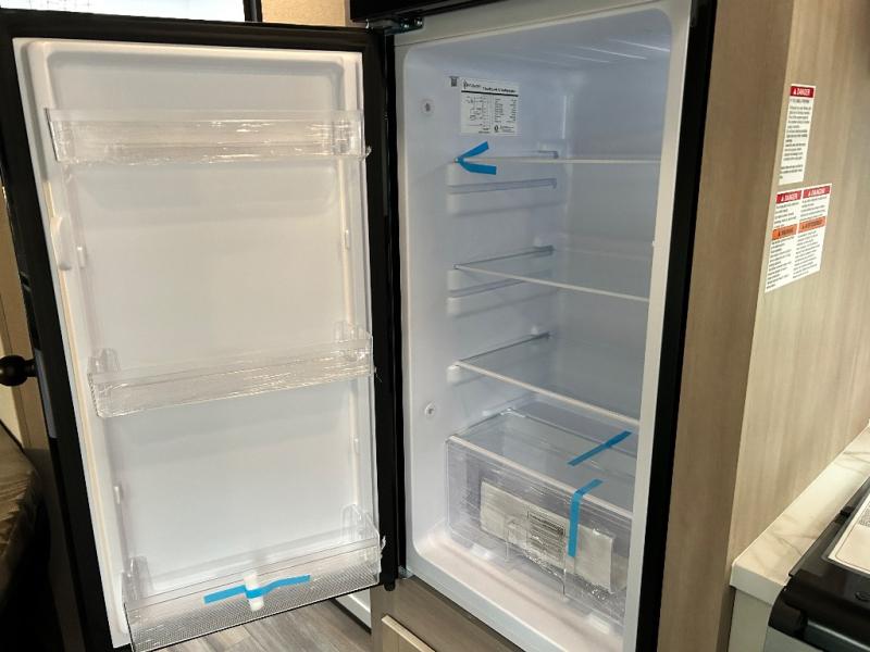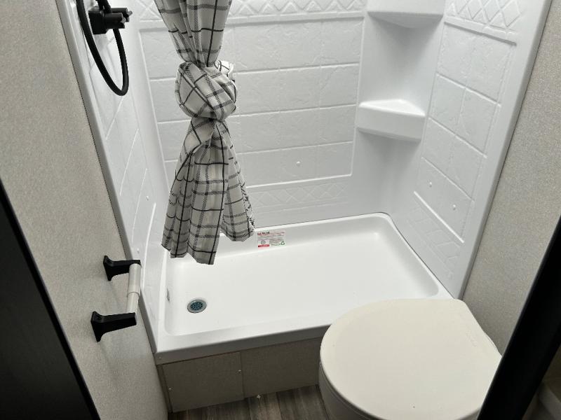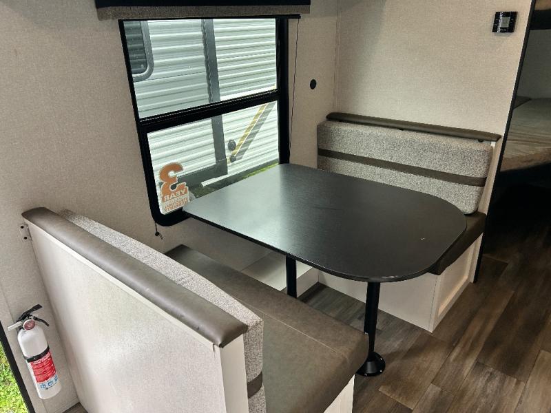 If you enjoy camping with a larger group, this travel trailer is perfect for you! There are double-size bunks in the back, which are right next to the private bath with a toilet and 40" tub/shower. You can take the front RV queen bed with dual wardrobes and a privacy curtain, and any other guests can convert the sofa and booth dinette to sleeping space. A three-burner cooktop will let you make breakfast for everyone in the morning, and a 12V refrigerator will keep your perishables fresh!