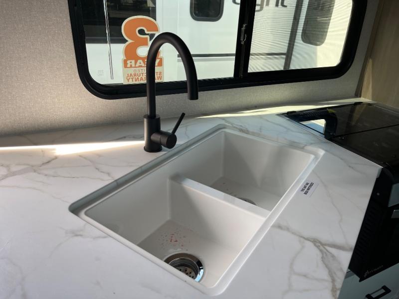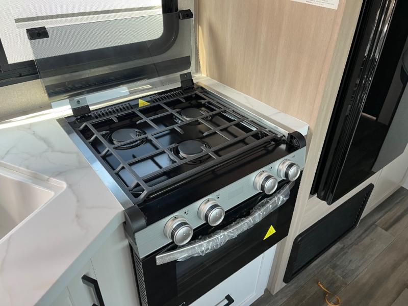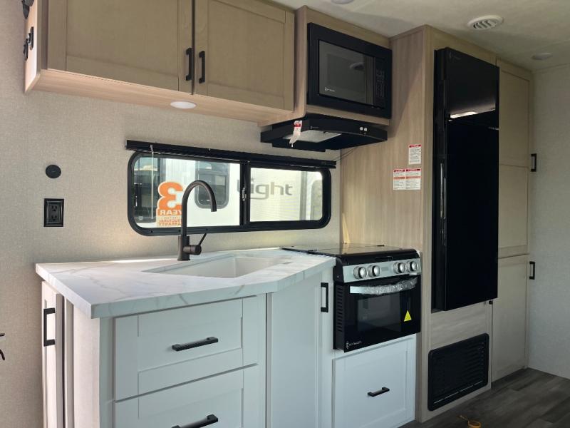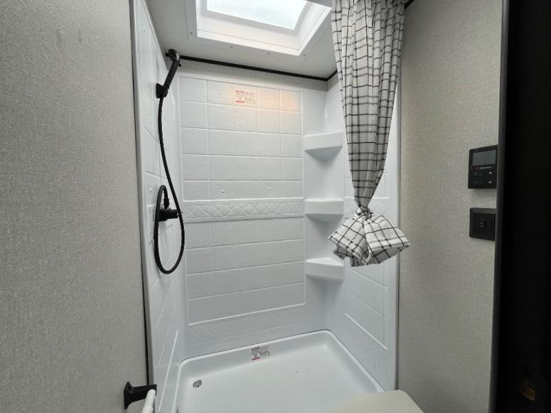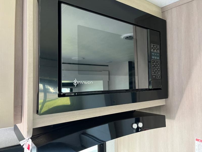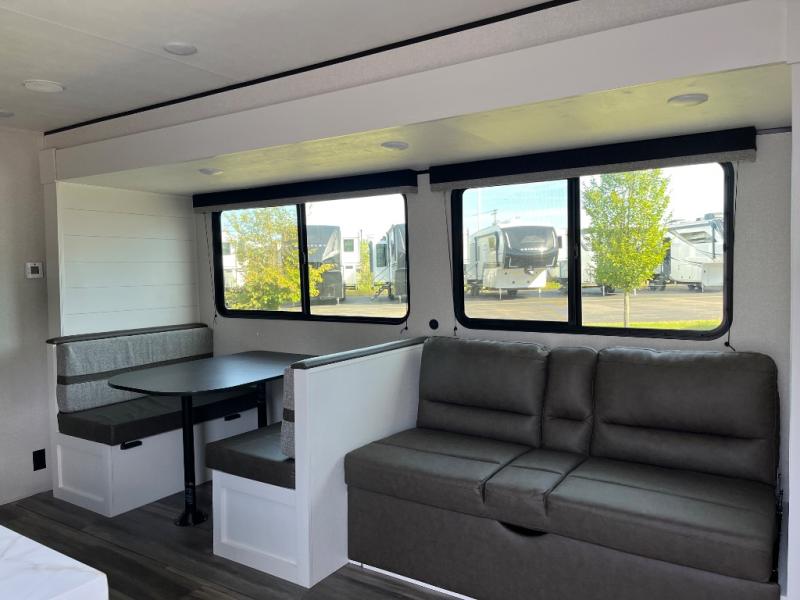 This travel trailer with double-size bunks is spacious and cozy! Once you've unloaded the exterior storage, your crew can put out the 16' power awning with LED lights, then start lunch on the outside kitchen. If the weather isn't cooperating, there is a three-burner cooktop and microwave oven inside, plus comfortable seating on the jack-knife sofa and booth dinette. You're sure to appreciate the front private bedroom with an RV queen bed, dual wardrobes, plus an overhead shelf for books, and the rear corner full bath will let everyone freshen up each day!