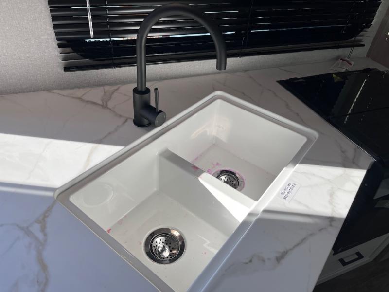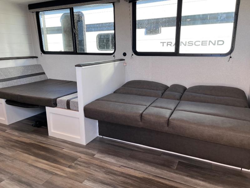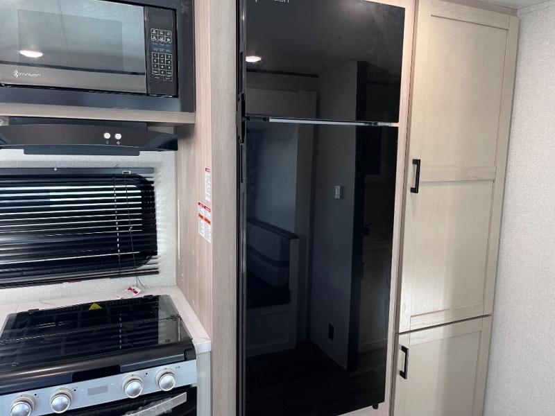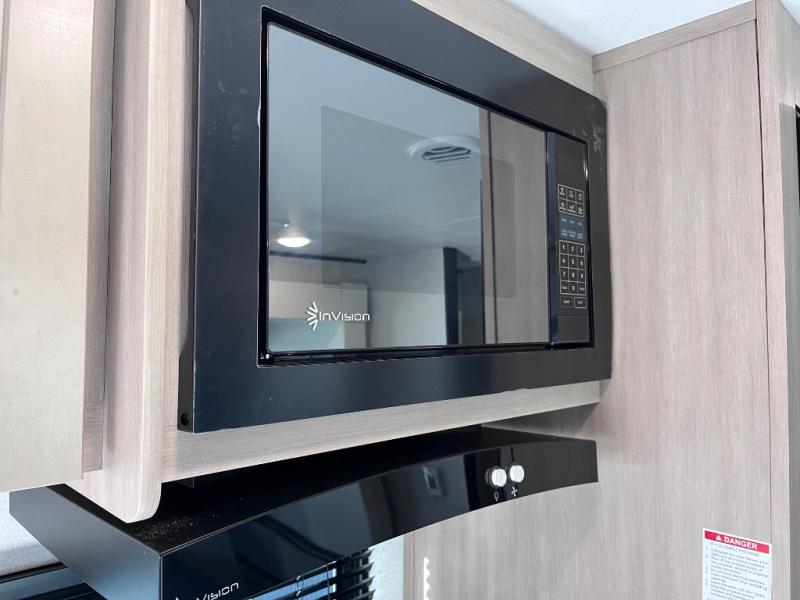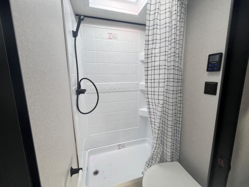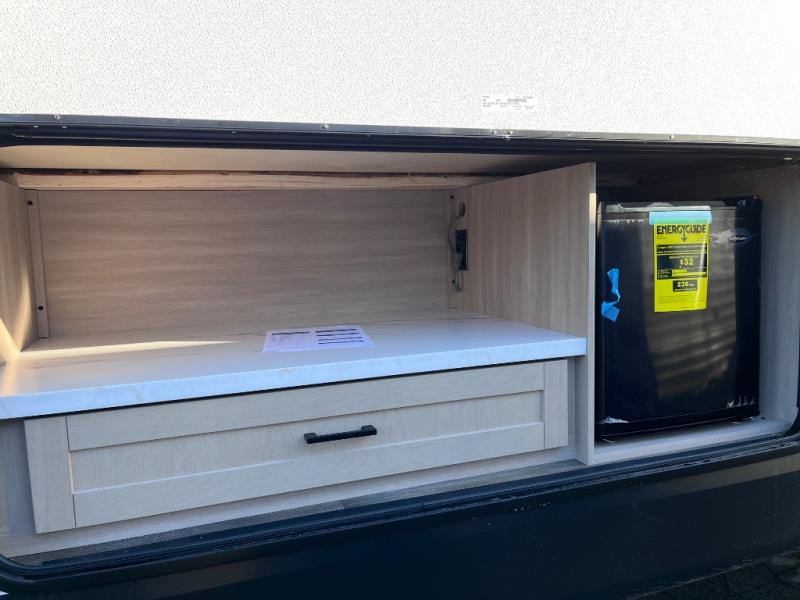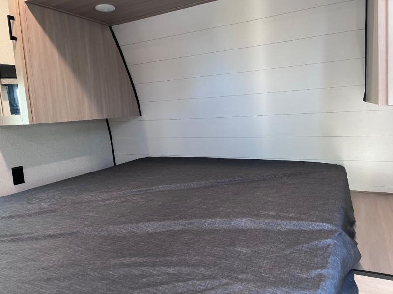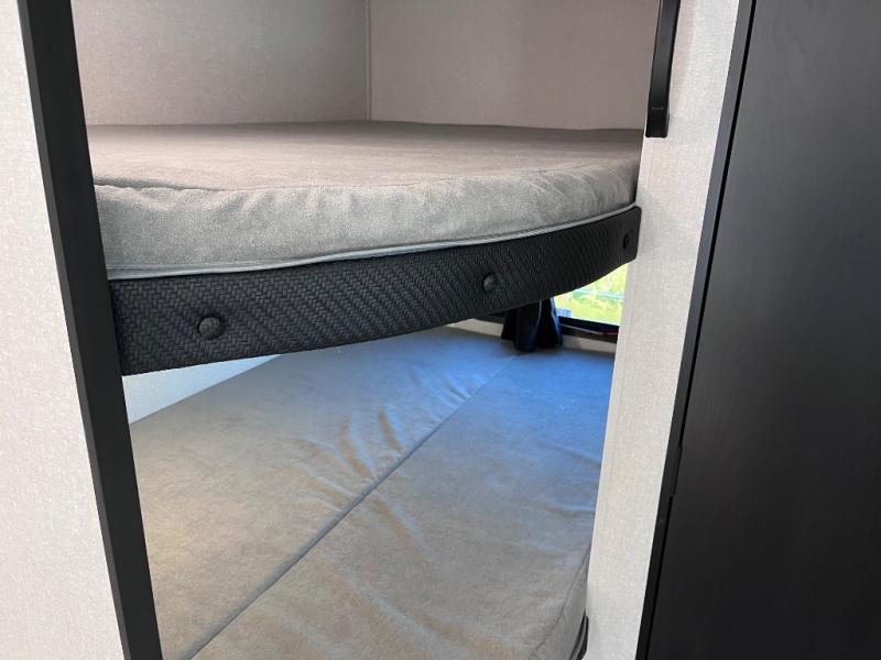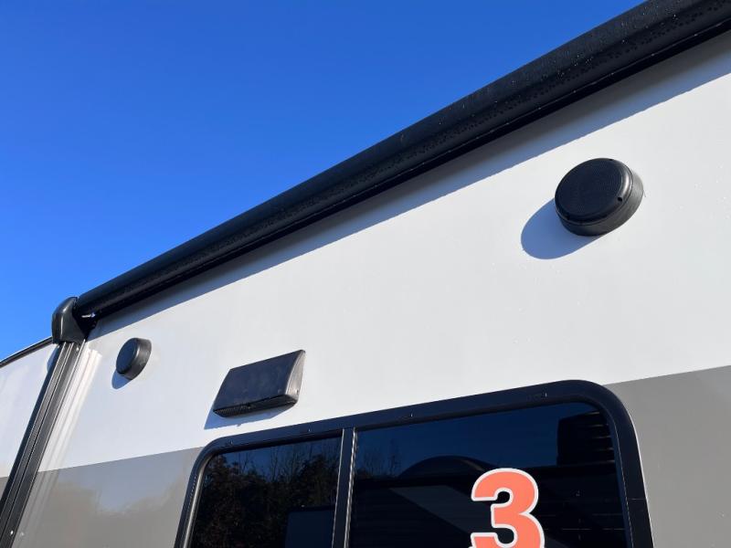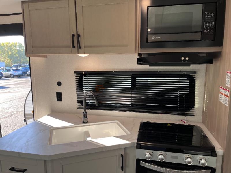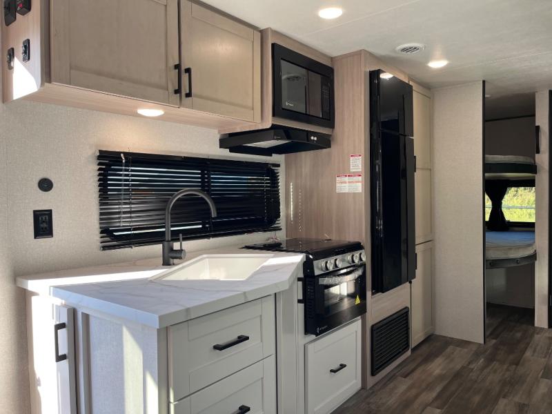 This travel trailer with double-size bunks is spacious and cozy! Once you've unloaded the exterior storage, your crew can put out the 16' power awning with LED lights, then start lunch on the outside kitchen. If the weather isn't cooperating, there is a three-burner cooktop and microwave oven inside, plus comfortable seating on the jack-knife sofa and booth dinette. You're sure to appreciate the front private bedroom with an RV queen bed, dual wardrobes, plus an overhead shelf for books, and the rear corner full bath will let everyone freshen up each day!