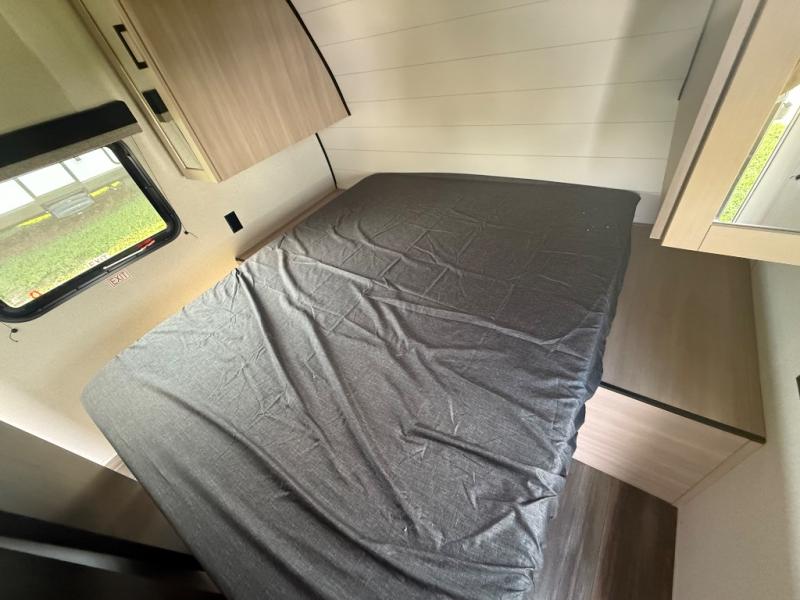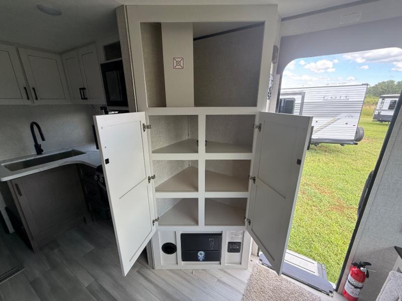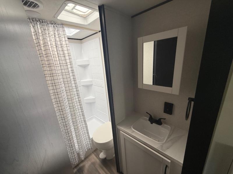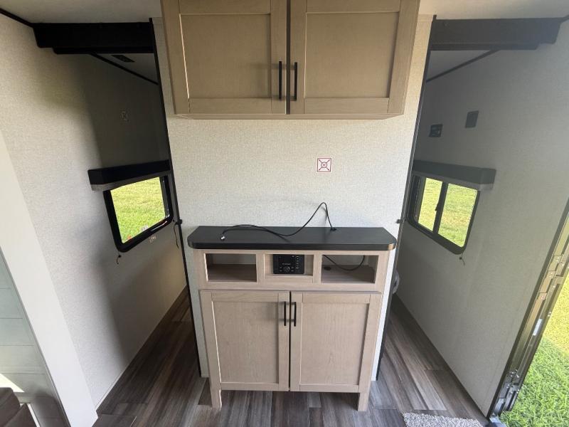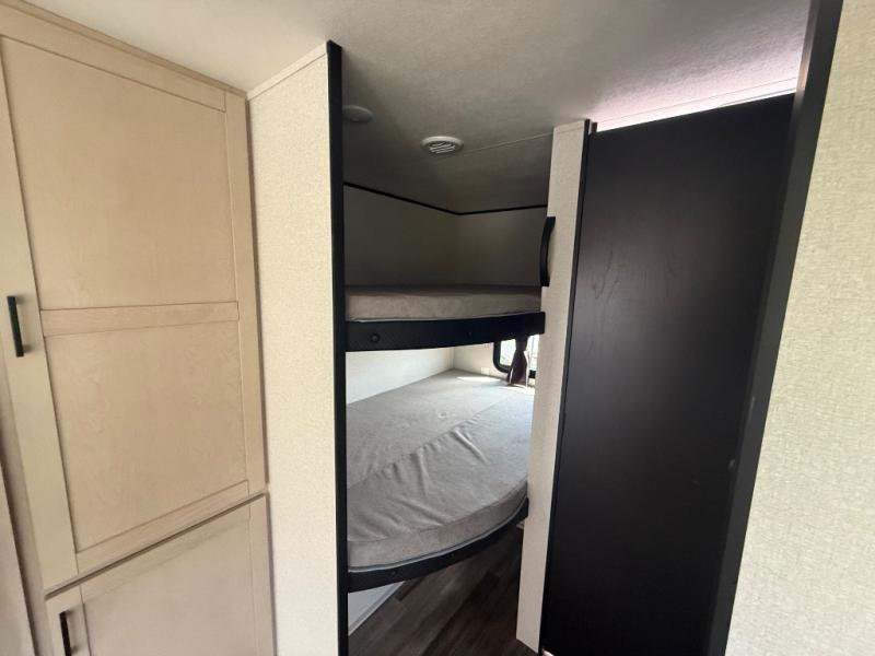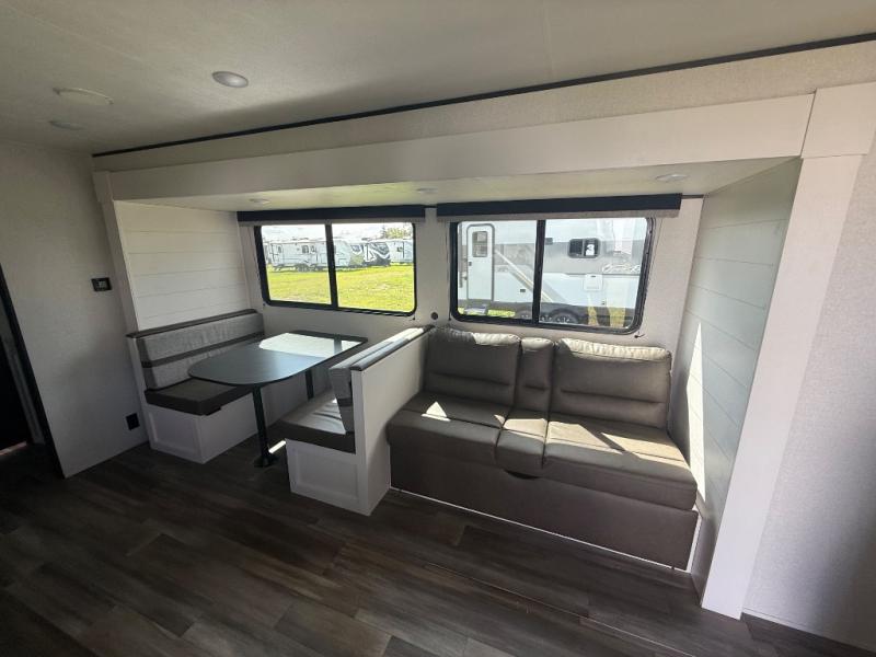 This travel trailer with double-size bunks is spacious and cozy! Once you've unloaded the exterior storage, your crew can put out the 16' power awning with LED lights, then start lunch on the outside kitchen. If the weather isn't cooperating, there is a three-burner cooktop and microwave oven inside, plus comfortable seating on the jack-knife sofa and booth dinette. You're sure to appreciate the front private bedroom with an RV queen bed, dual wardrobes, plus an overhead shelf for books, and the rear corner full bath will let everyone freshen up each day!