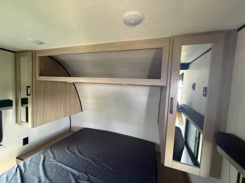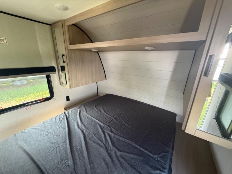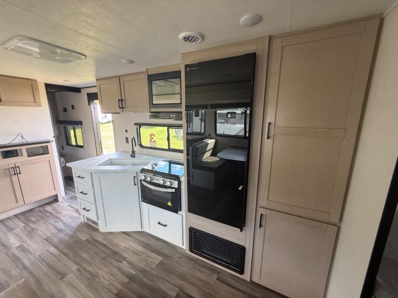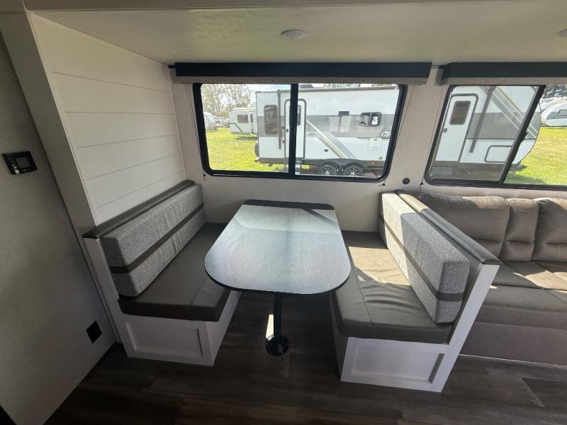 This travel trailer with double-size bunks is spacious and cozy! Once you've unloaded the exterior storage, your crew can put out the 16' power awning with LED lights, then start lunch on the outside kitchen. If the weather isn't cooperating, there is a three-burner cooktop and microwave oven inside, plus comfortable seating on the jack-knife sofa and booth dinette. You're sure to appreciate the front private bedroom with an RV queen bed, dual wardrobes, plus an overhead shelf for books, and the rear corner full bath will let everyone freshen up each day!