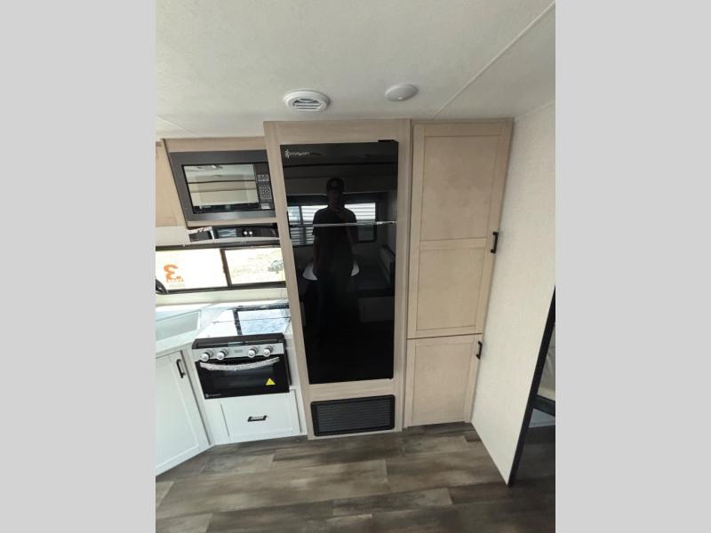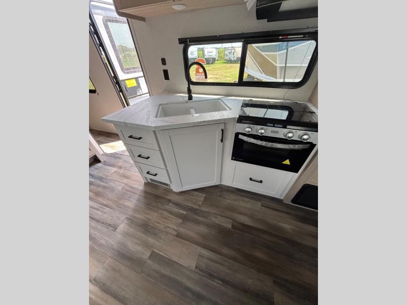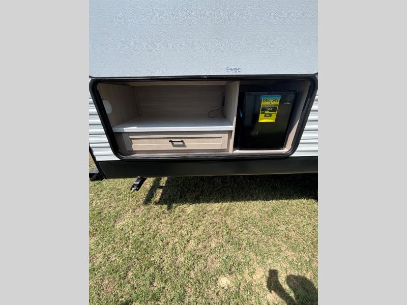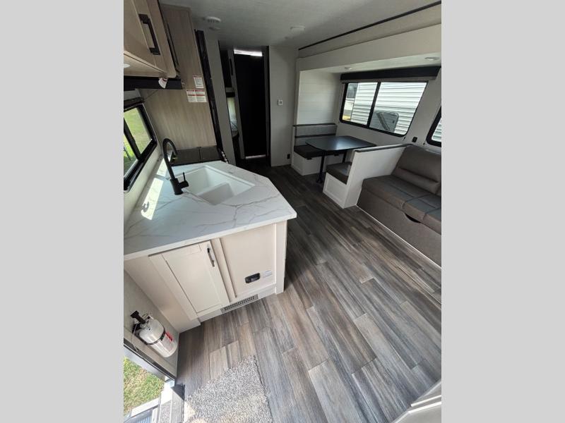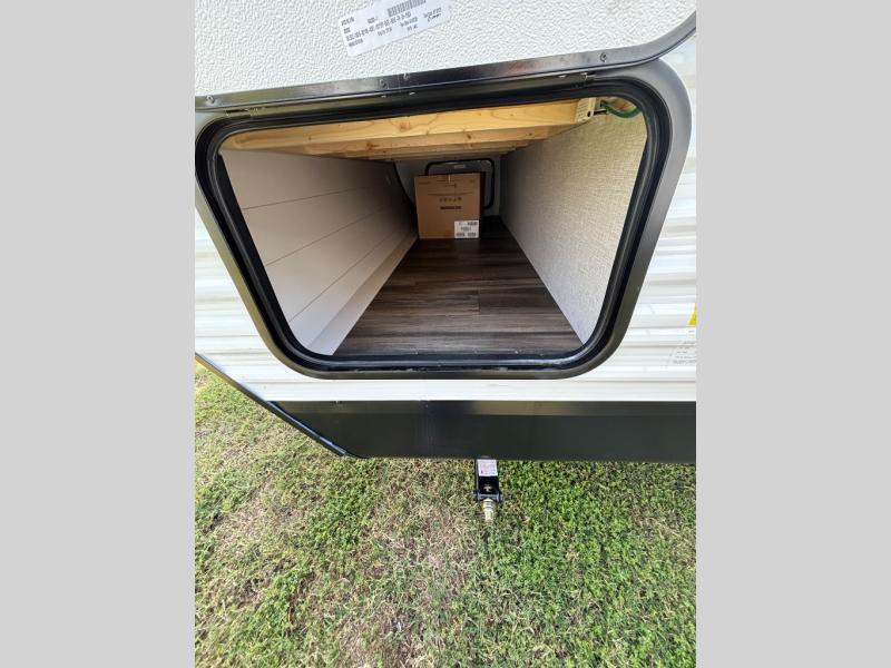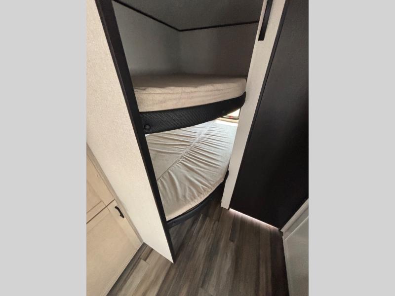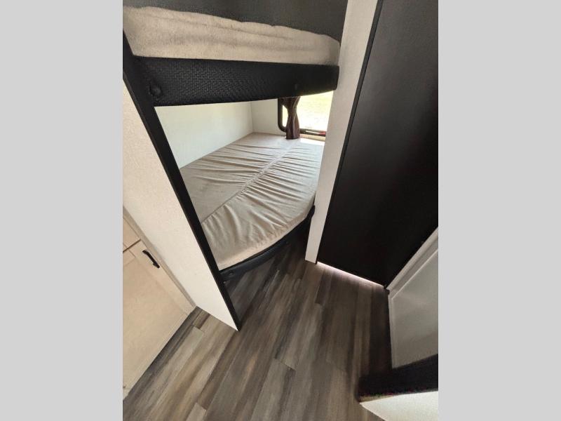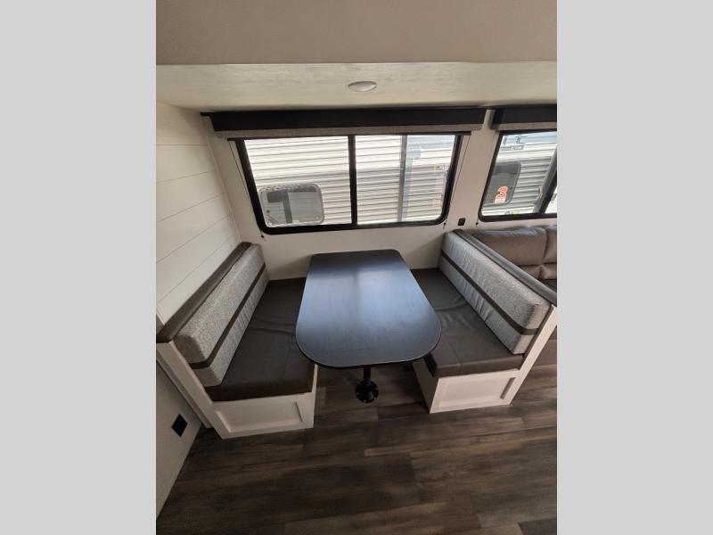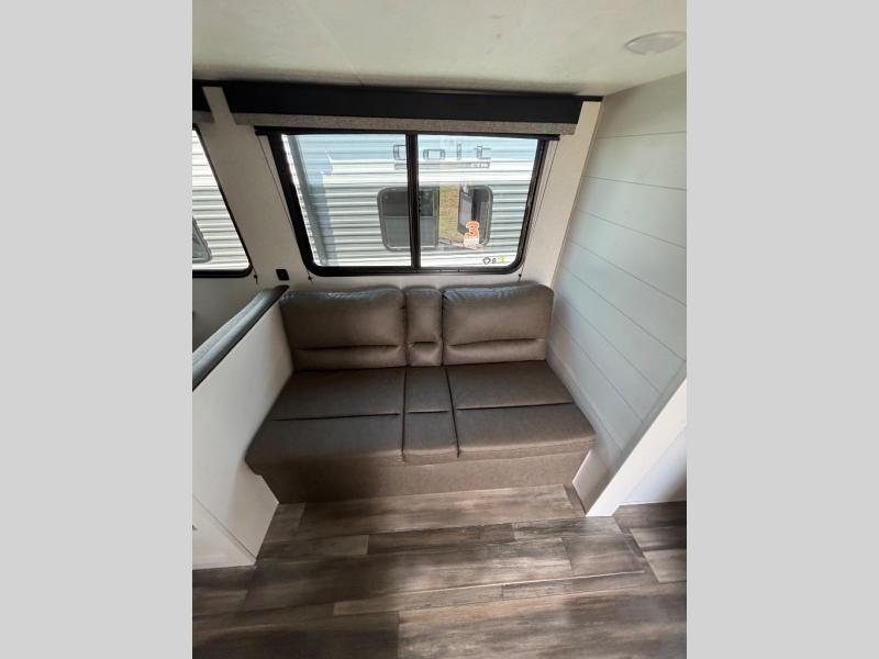 This travel trailer with double-size bunks is spacious and cozy! Once you've unloaded the exterior storage, your crew can put out the 16' power awning with LED lights, then start lunch on the outside kitchen. If the weather isn't cooperating, there is a three-burner cooktop and microwave oven inside, plus comfortable seating on the jack-knife sofa and booth dinette. You're sure to appreciate the front private bedroom with an RV queen bed, dual wardrobes, plus an overhead shelf for books, and the rear corner full bath will let everyone freshen up each day!