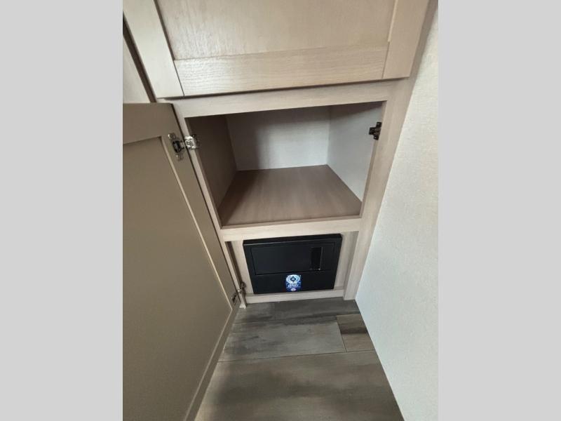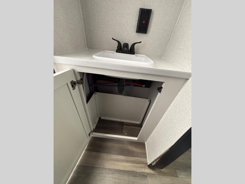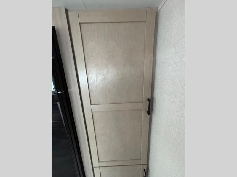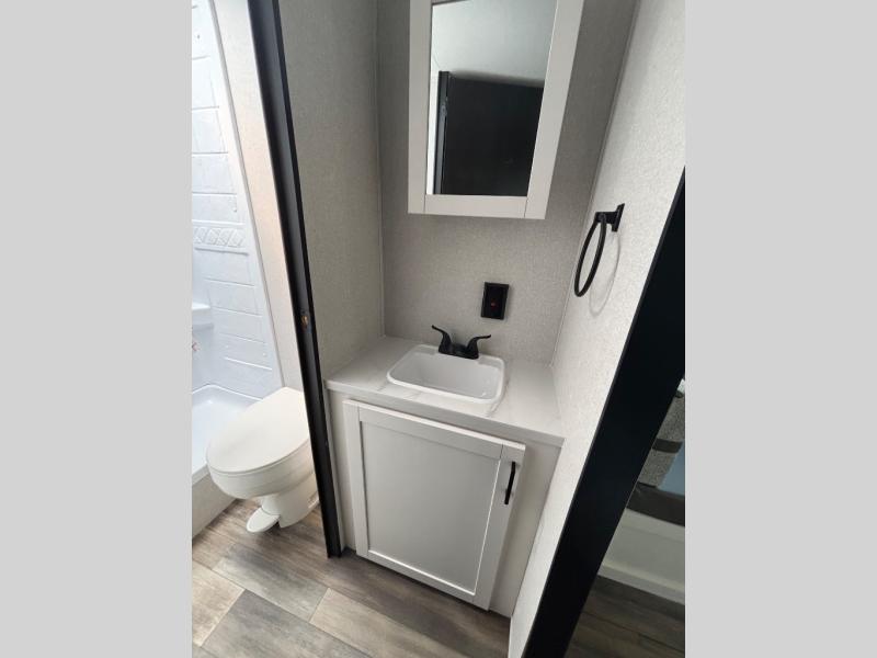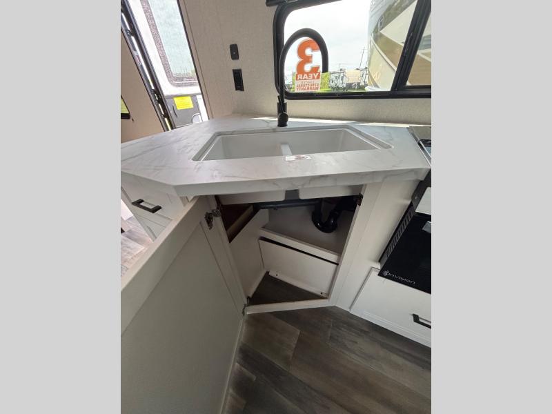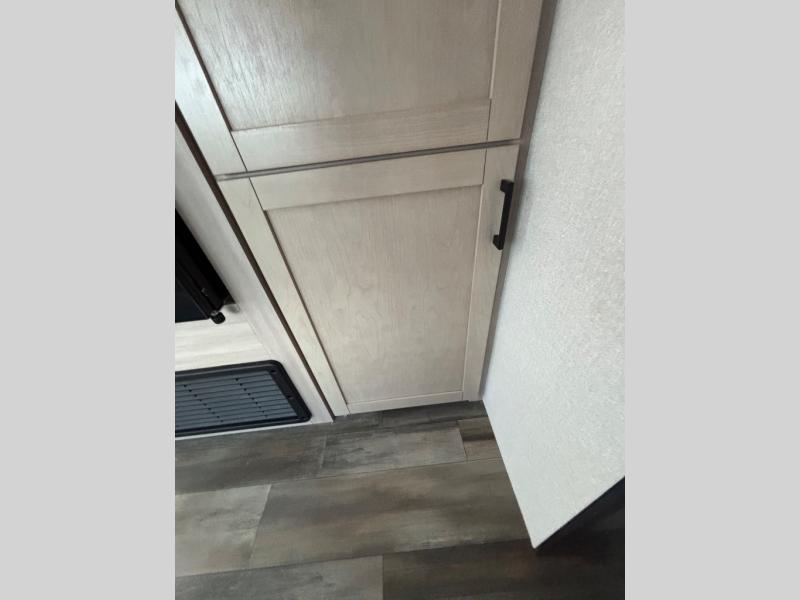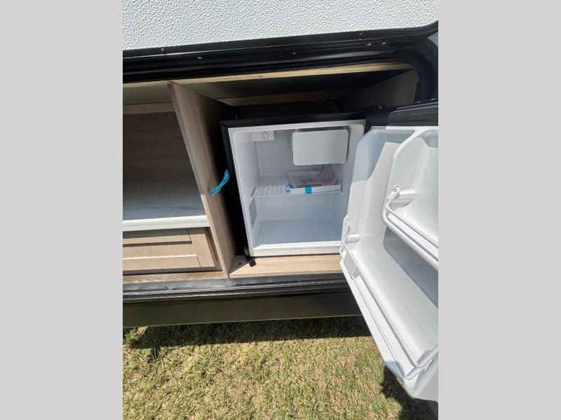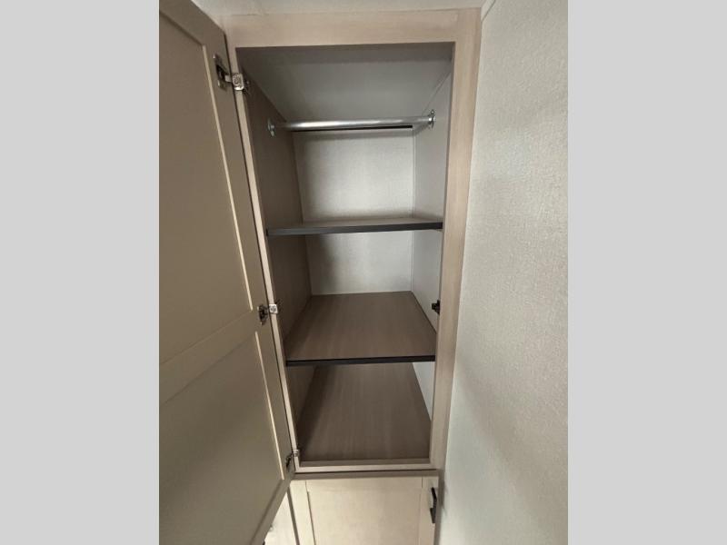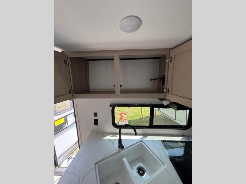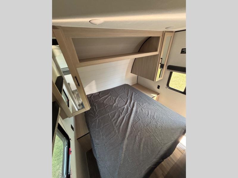 This travel trailer with double-size bunks is spacious and cozy! Once you've unloaded the exterior storage, your crew can put out the 16' power awning with LED lights, then start lunch on the outside kitchen. If the weather isn't cooperating, there is a three-burner cooktop and microwave oven inside, plus comfortable seating on the jack-knife sofa and booth dinette. You're sure to appreciate the front private bedroom with an RV queen bed, dual wardrobes, plus an overhead shelf for books, and the rear corner full bath will let everyone freshen up each day!