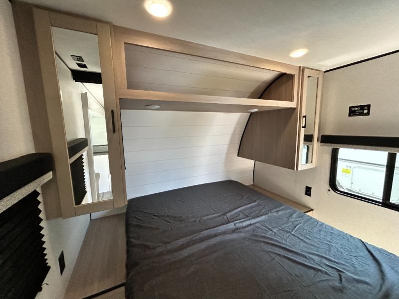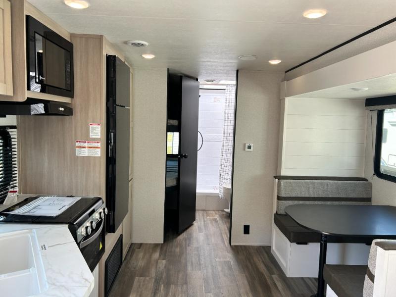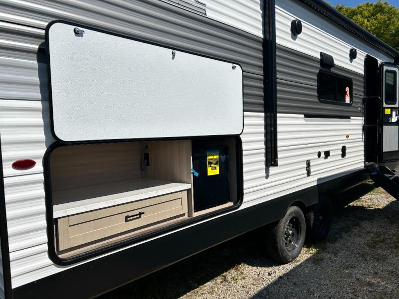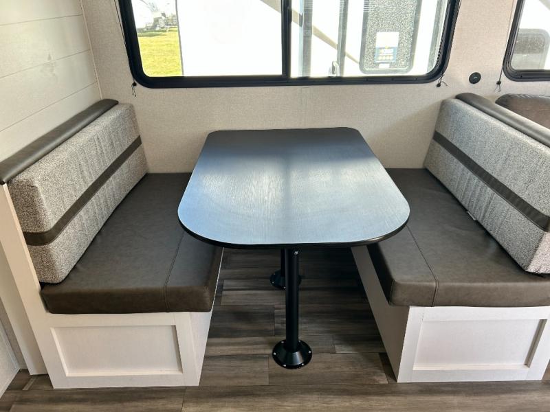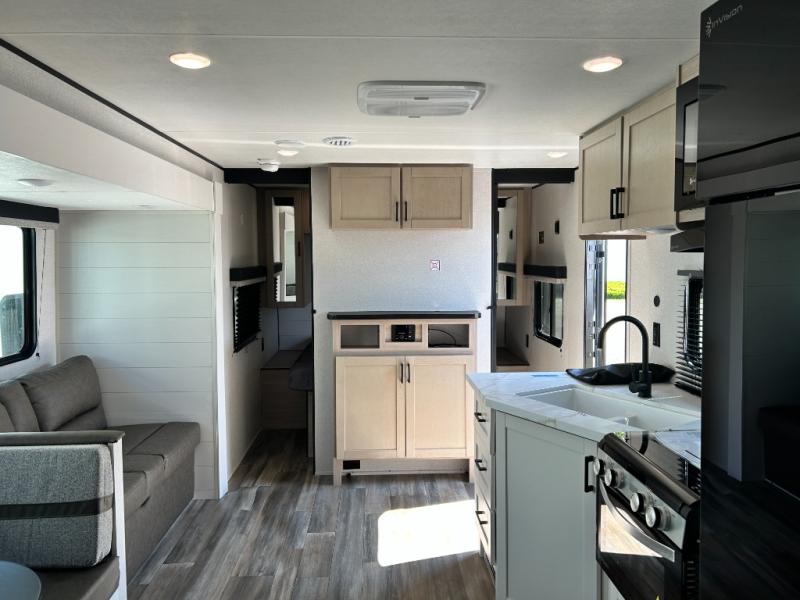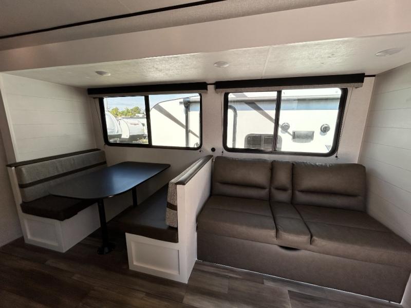 This travel trailer with double-size bunks is spacious and cozy! Once you've unloaded the exterior storage, your crew can put out the 16' power awning with LED lights, then start lunch on the outside kitchen. If the weather isn't cooperating, there is a three-burner cooktop and microwave oven inside, plus comfortable seating on the jack-knife sofa and booth dinette. You're sure to appreciate the front private bedroom with an RV queen bed, dual wardrobes, plus an overhead shelf for books, and the rear corner full bath will let everyone freshen up each day!