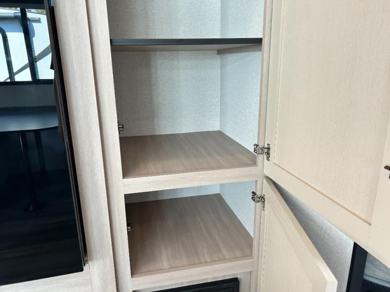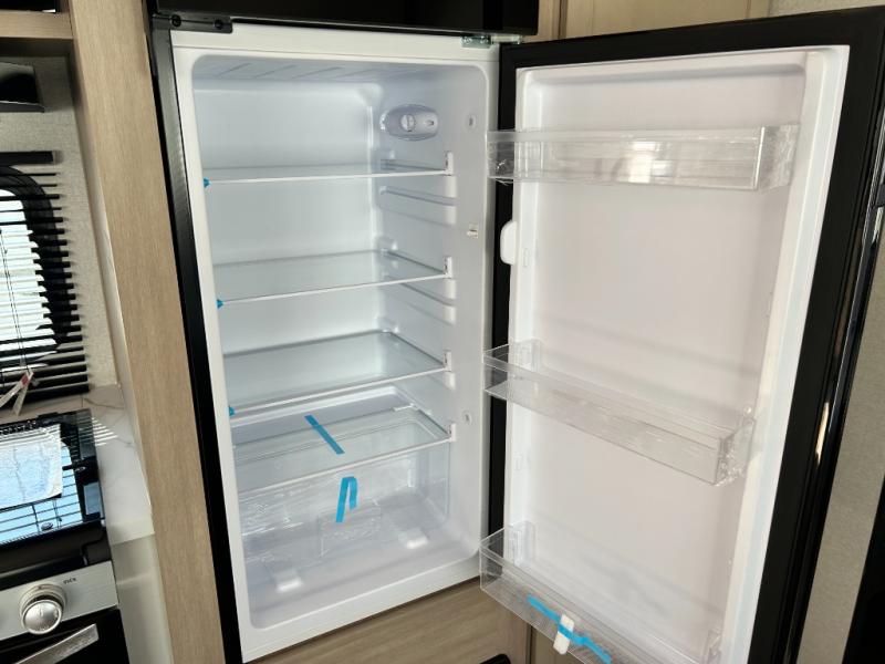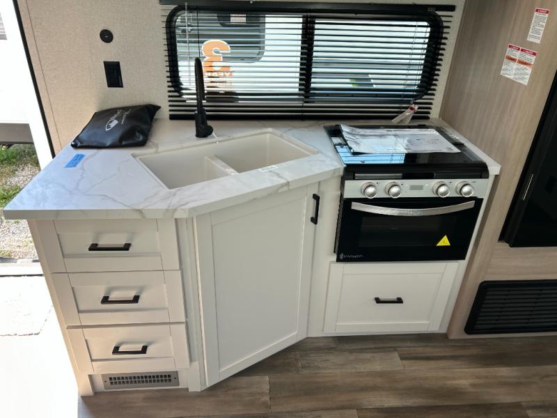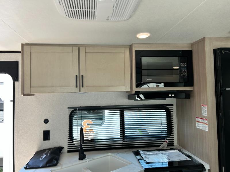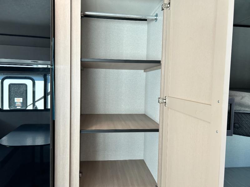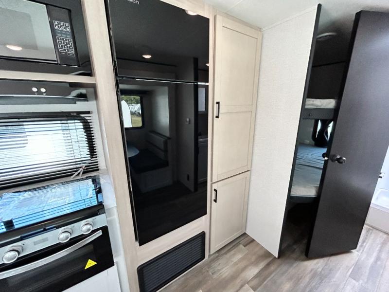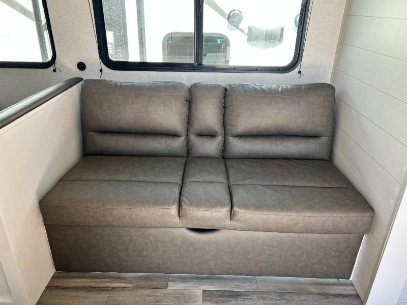 This travel trailer with double-size bunks is spacious and cozy! Once you've unloaded the exterior storage, your crew can put out the 16' power awning with LED lights, then start lunch on the outside kitchen. If the weather isn't cooperating, there is a three-burner cooktop and microwave oven inside, plus comfortable seating on the jack-knife sofa and booth dinette. You're sure to appreciate the front private bedroom with an RV queen bed, dual wardrobes, plus an overhead shelf for books, and the rear corner full bath will let everyone freshen up each day!