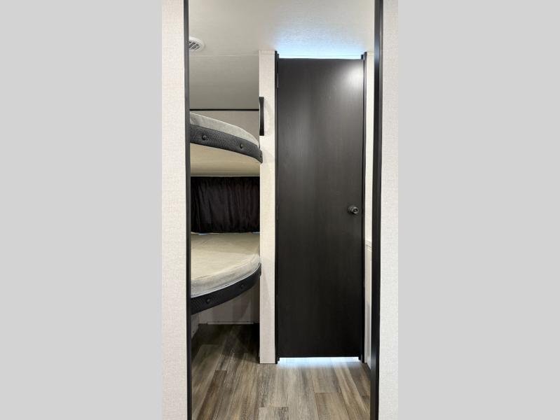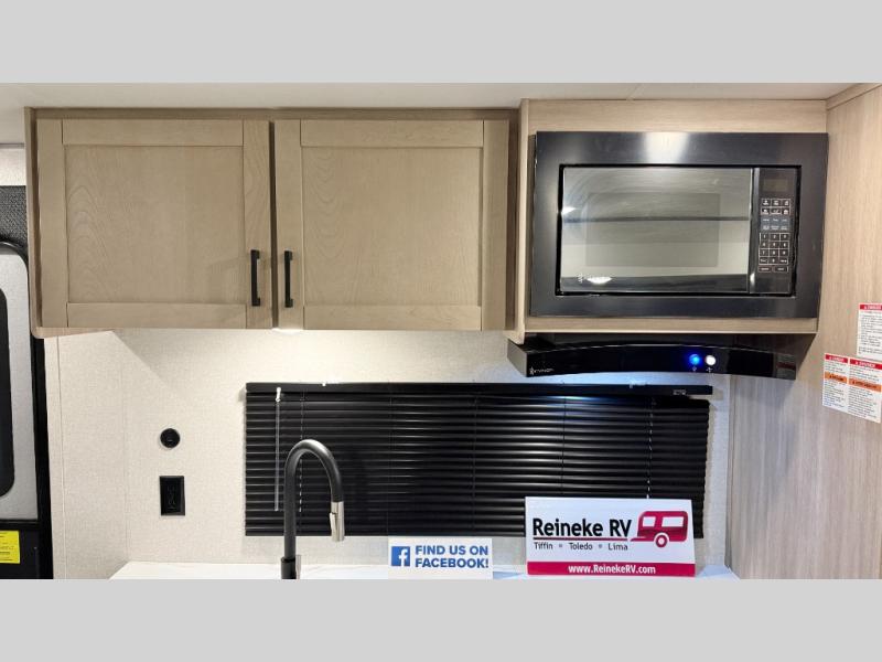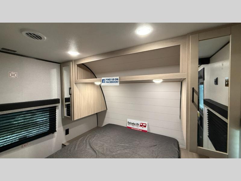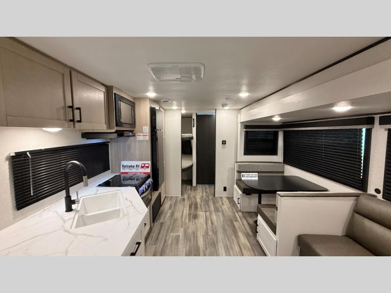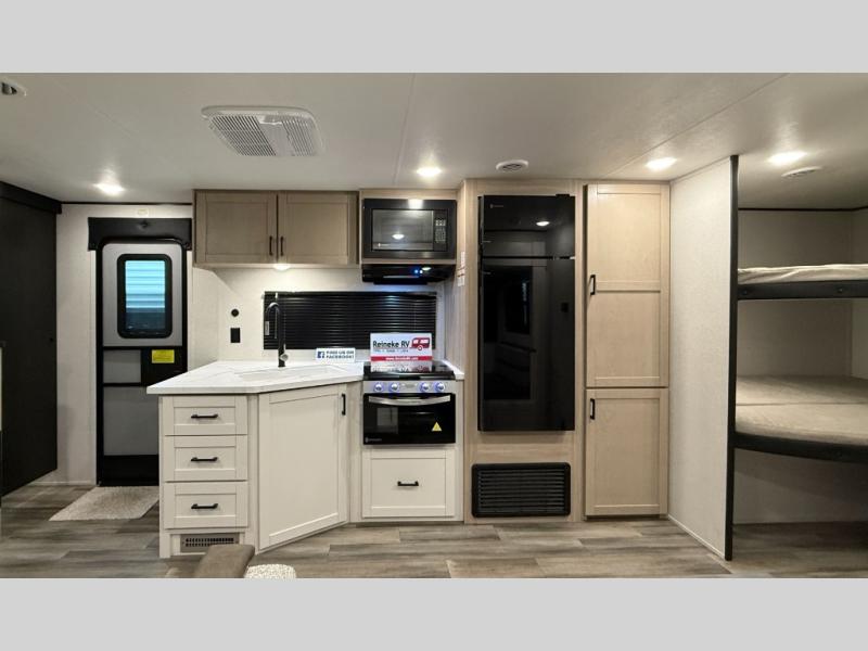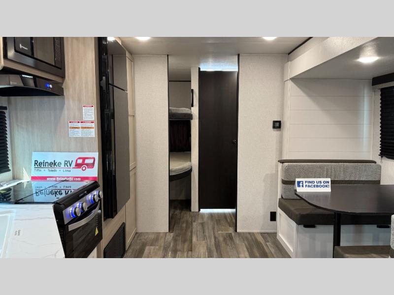 This travel trailer with double-size bunks is spacious and cozy! Once you've unloaded the exterior storage, your crew can put out the 16' power awning with LED lights, then start lunch on the outside kitchen. If the weather isn't cooperating, there is a three-burner cooktop and microwave oven inside, plus comfortable seating on the jack-knife sofa and booth dinette. You're sure to appreciate the front private bedroom with an RV queen bed, dual wardrobes, plus an overhead shelf for books, and the rear corner full bath will let everyone freshen up each day!