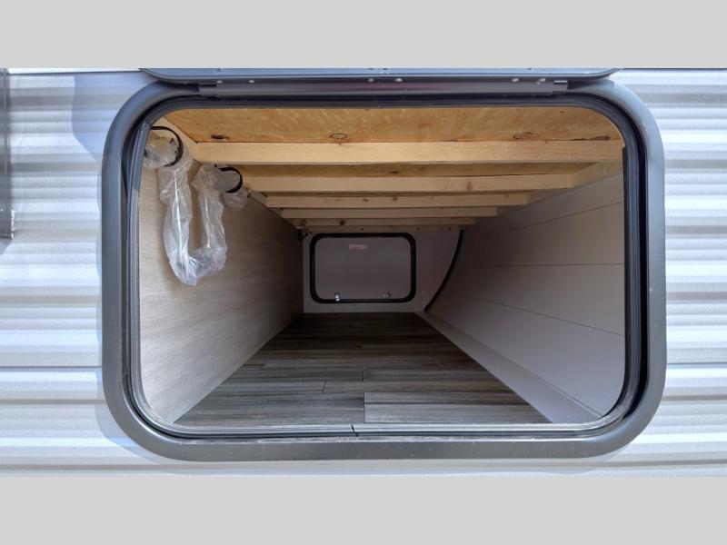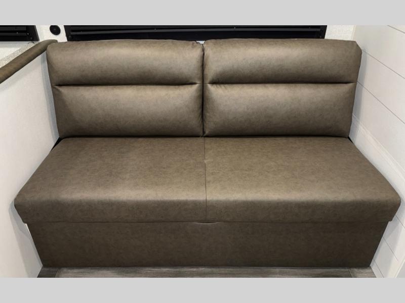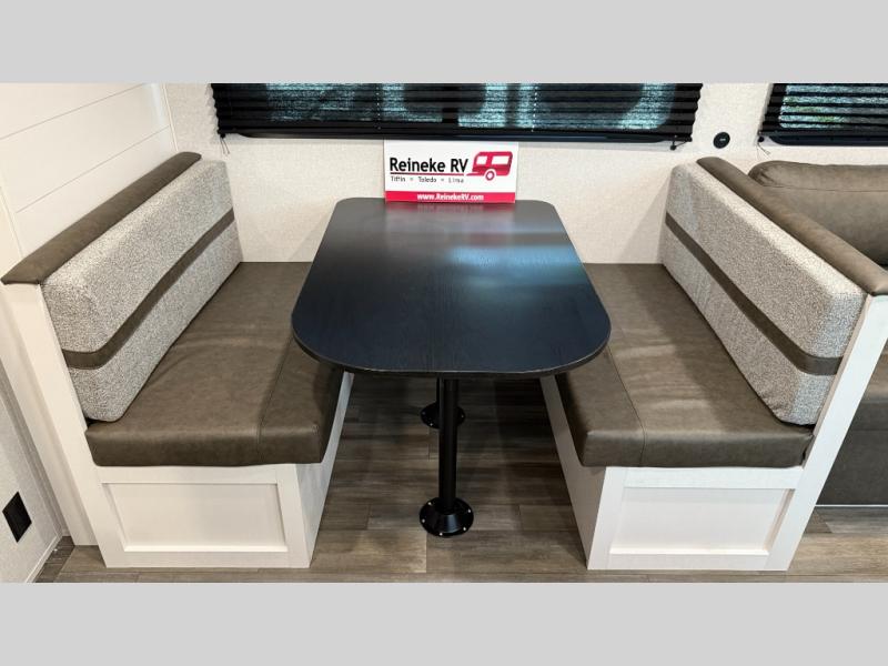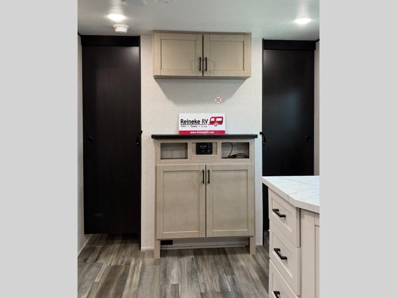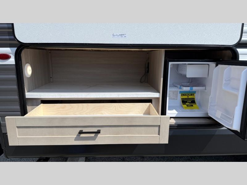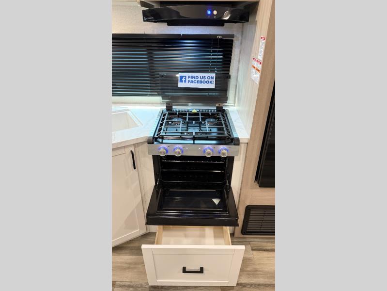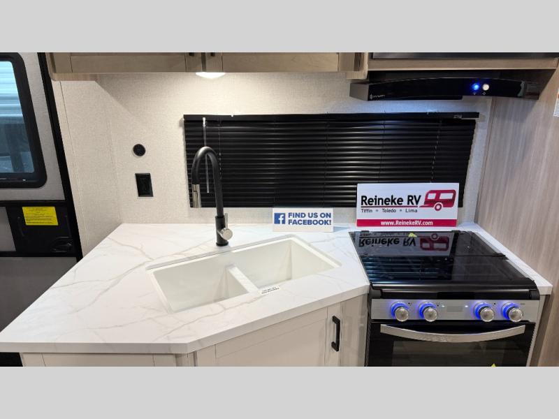 This travel trailer with double-size bunks is spacious and cozy! Once you've unloaded the exterior storage, your crew can put out the 16' power awning with LED lights, then start lunch on the outside kitchen. If the weather isn't cooperating, there is a three-burner cooktop and microwave oven inside, plus comfortable seating on the jack-knife sofa and booth dinette. You're sure to appreciate the front private bedroom with an RV queen bed, dual wardrobes, plus an overhead shelf for books, and the rear corner full bath will let everyone freshen up each day!