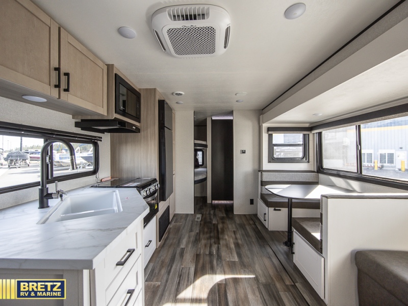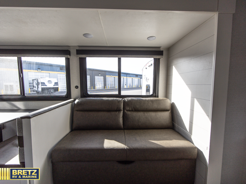 This travel trailer with double-size bunks is spacious and cozy! Once you've unloaded the exterior storage, your crew can put out the 16' power awning with LED lights, then start lunch on the outside kitchen. If the weather isn't cooperating, there is a three-burner cooktop and microwave oven inside, plus comfortable seating on the jack-knife sofa and booth dinette. You're sure to appreciate the front private bedroom with an RV queen bed, dual wardrobes, plus an overhead shelf for books, and the rear corner full bath will let everyone freshen up each day!