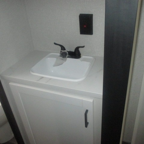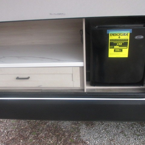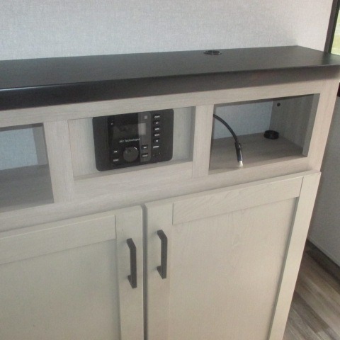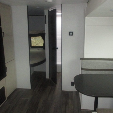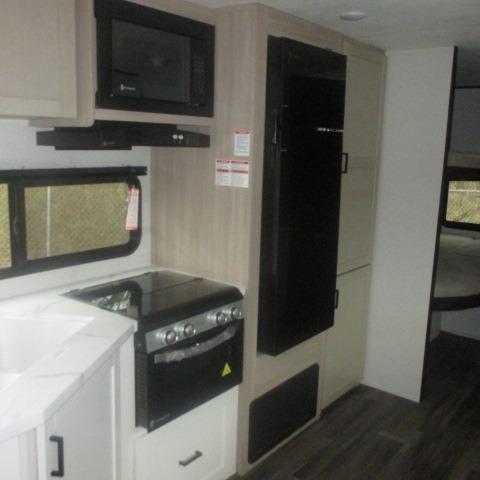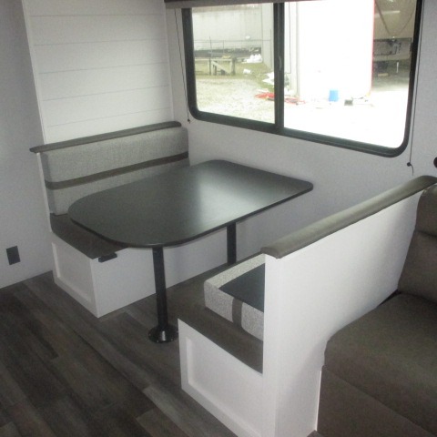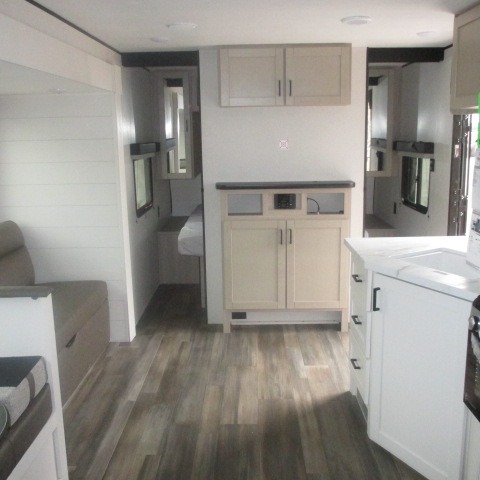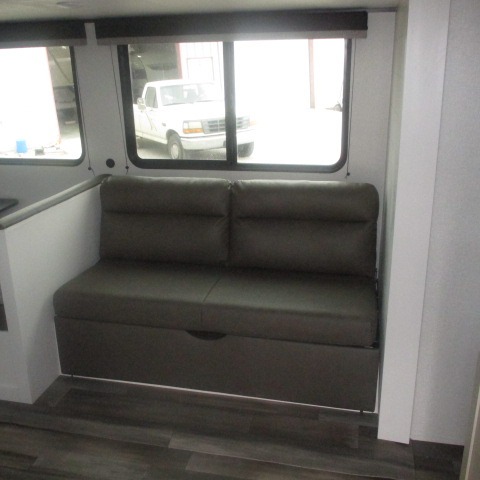 This travel trailer with double-size bunks is spacious and cozy! Once you've unloaded the exterior storage, your crew can put out the 16' power awning with LED lights, then start lunch on the outside kitchen. If the weather isn't cooperating, there is a three-burner cooktop and microwave oven inside, plus comfortable seating on the jack-knife sofa and booth dinette. You're sure to appreciate the front private bedroom with an RV queen bed, dual wardrobes, plus an overhead shelf for books, and the rear corner full bath will let everyone freshen up each day!