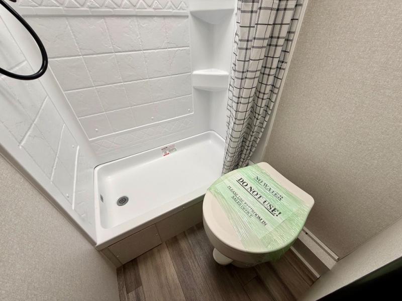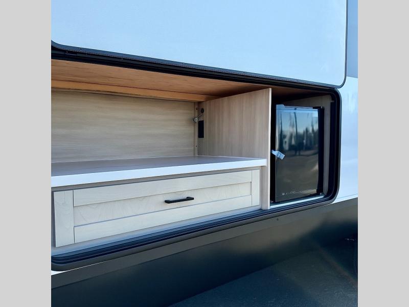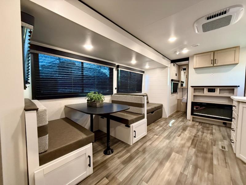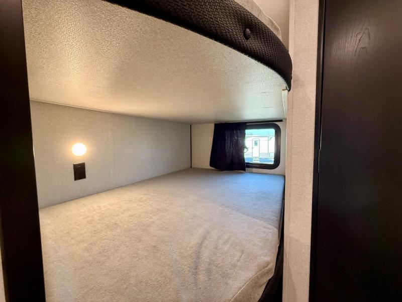 This travel trailer with double-size bunks is spacious and cozy! Once you've unloaded the exterior storage, your crew can put out the 16' power awning with LED lights, then start lunch on the outside kitchen. If the weather isn't cooperating, there is a three-burner cooktop and microwave oven inside, plus comfortable seating on the jack-knife sofa and booth dinette. You're sure to appreciate the front private bedroom with an RV queen bed, dual wardrobes, plus an overhead shelf for books, and the rear corner full bath will let everyone freshen up each day!
