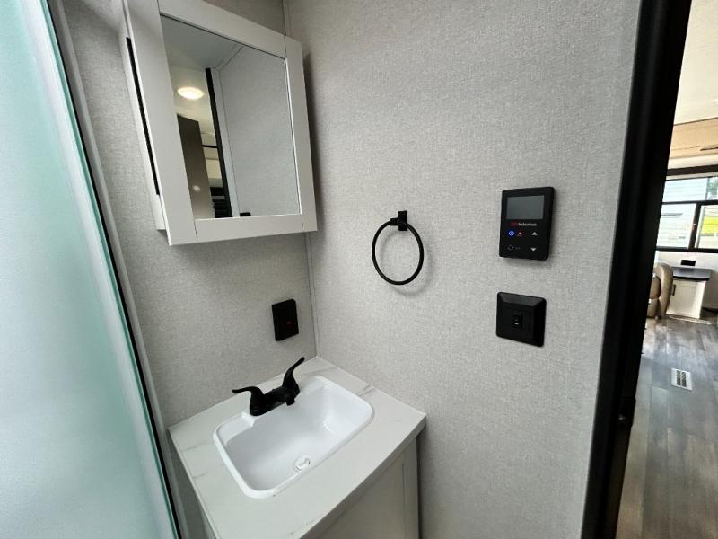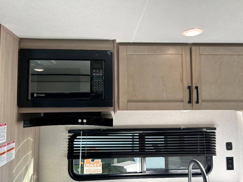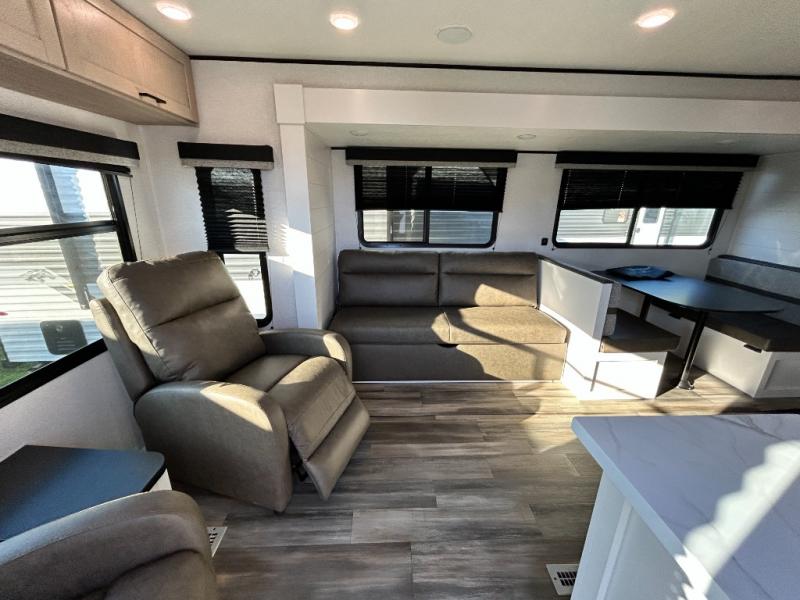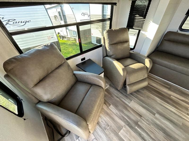 With dual entry doors in this unit, you can enter in through the front master bedroom or the rear living room! The dual lounge chairs in the back will let you relax with a book and your coffee, and there is a large slide out with a jack-knife sofa and booth dinette for additional seating spaces. The chef of your group can make meals on the three-burner cooktop or in the microwave oven, and there is a pantry for dry goods or snacks. The walk-thru bath is easily accessible for everyone to use, and the front master bedroom with a 60" x 74" RV queen bed will make you feel right at home!