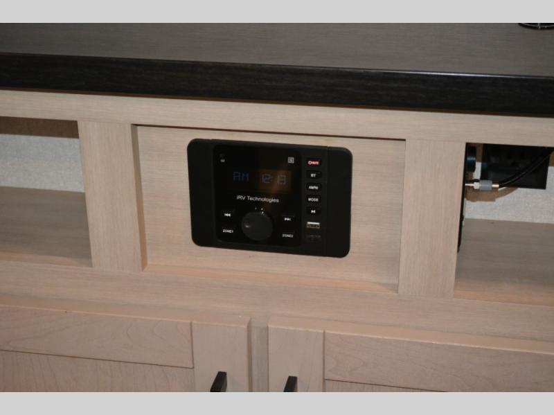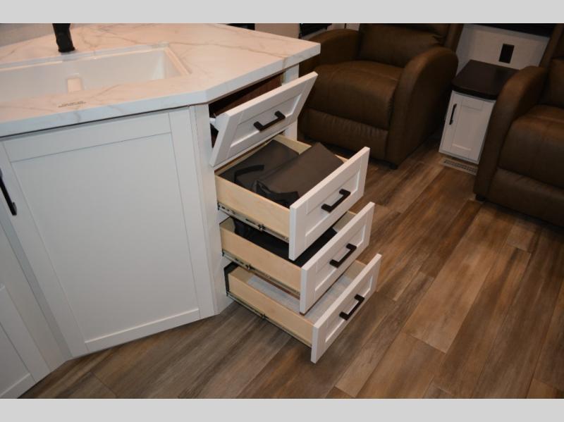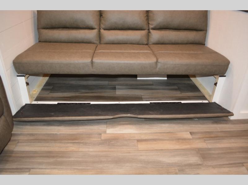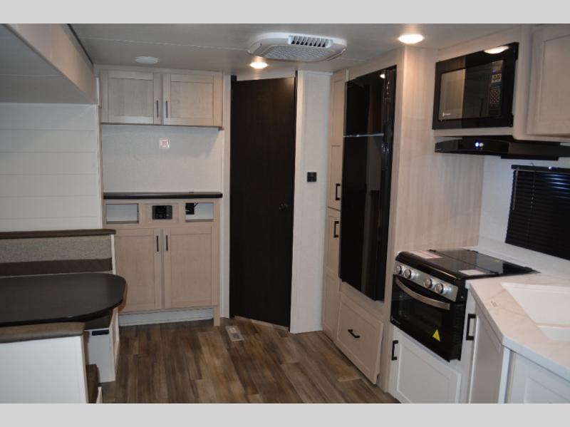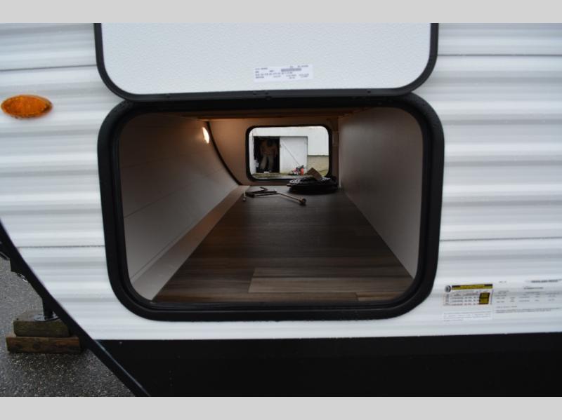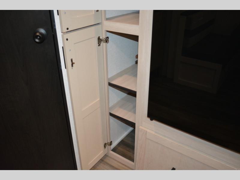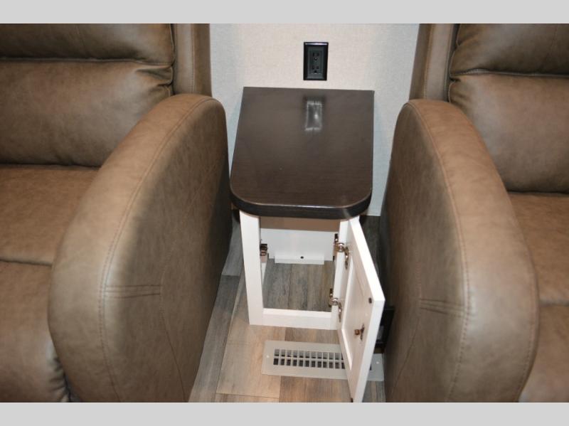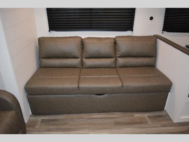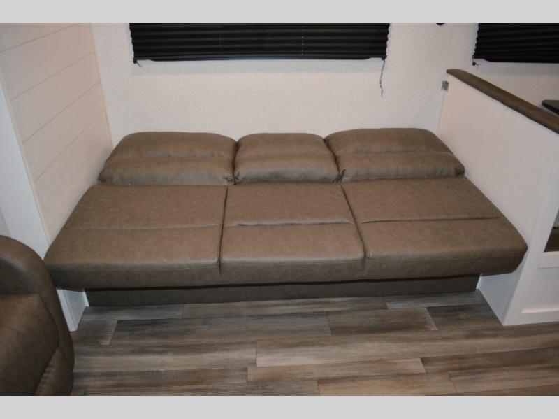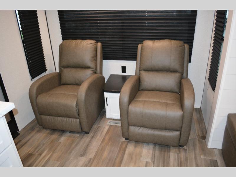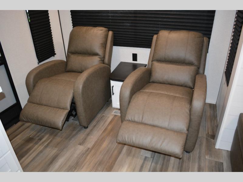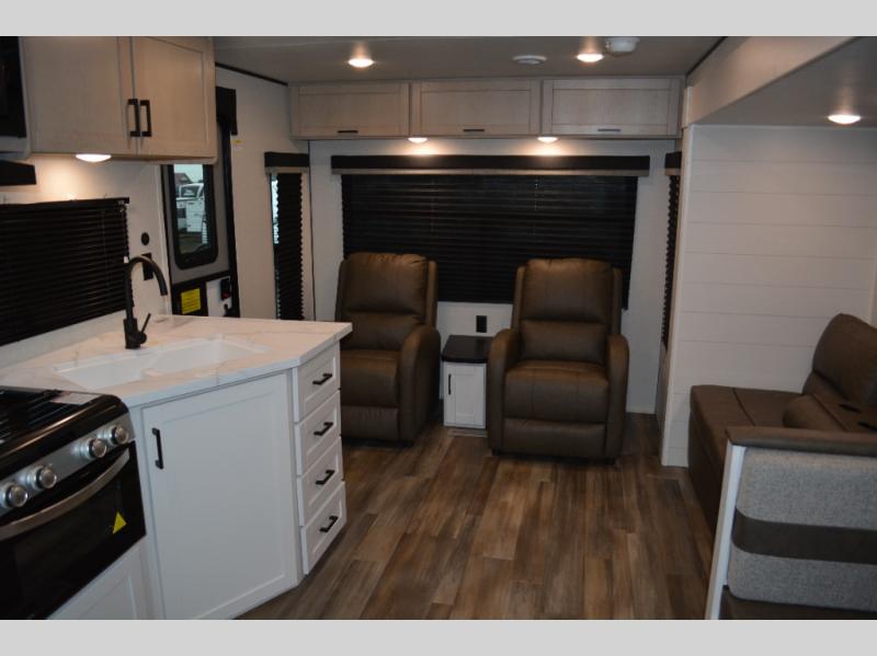 With dual entry doors in this unit, you can enter in through the front master bedroom or the rear living room! The dual lounge chairs in the back will let you relax with a book and your coffee, and there is a large slide out with a jack-knife sofa and booth dinette for additional seating spaces. The chef of your group can make meals on the three-burner cooktop or in the microwave oven, and there is a pantry for dry goods or snacks. The walk-thru bath is easily accessible for everyone to use, and the front master bedroom with a 60" x 74" RV queen bed will make you feel right at home!