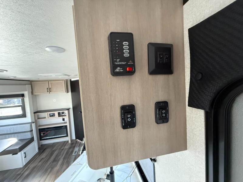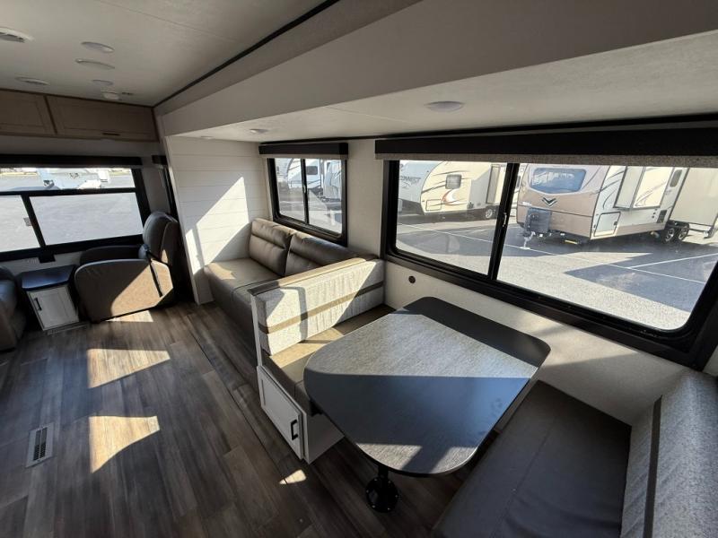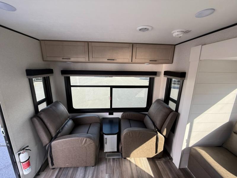 With dual entry doors in this unit, you can enter in through the front master bedroom or the rear living room! The dual lounge chairs in the back will let you relax with a book and your coffee, and there is a large slide out with a jack-knife sofa and booth dinette for additional seating spaces. The chef of your group can make meals on the three-burner cooktop or in the microwave oven, and there is a pantry for dry goods or snacks. The walk-thru bath is easily accessible for everyone to use, and the front master bedroom with a 60" x 74" RV queen bed will make you feel right at home!