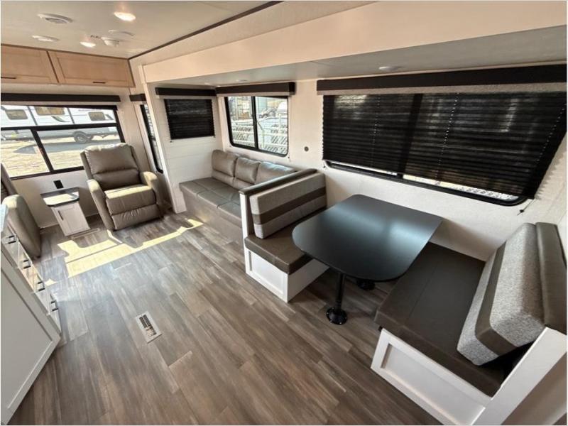 With dual entry doors in this unit, you can enter in through the front master bedroom or the rear living room! The dual lounge chairs in the back will let you relax with a book and your coffee, and there is a large slide out with a jack-knife sofa and booth dinette for additional seating spaces. The chef of your group can make meals on the three-burner cooktop or in the microwave oven, and there is a pantry for dry goods or snacks. The walk-thru bath is easily accessible for everyone to use, and the front master bedroom with a 60" x 74" RV queen bed will make you feel right at home!