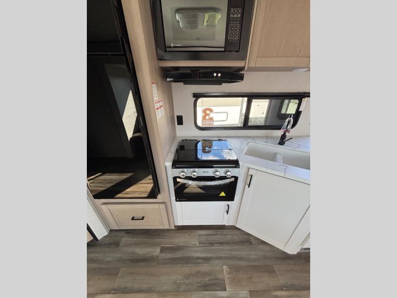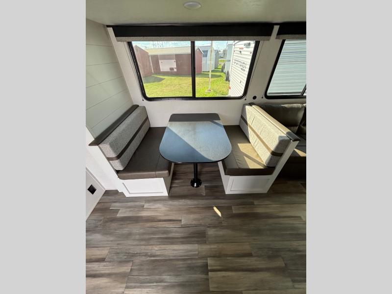 This travel trailer with double-size bunks is spacious and cozy! Once you've unloaded the exterior storage, your crew can put out the 20' power awning with LED lights, then start lunch on the outside kitchen. If the weather isn't cooperating, there is a three-burner cooktop and microwave oven inside, plus comfortable seating on the jack-knife sofa and booth dinette. You're sure to appreciate the front private bedroom with an RV queen bed, dual wardrobes, an overhead shelf, plus a bedroom closet for more shoes and clothes!