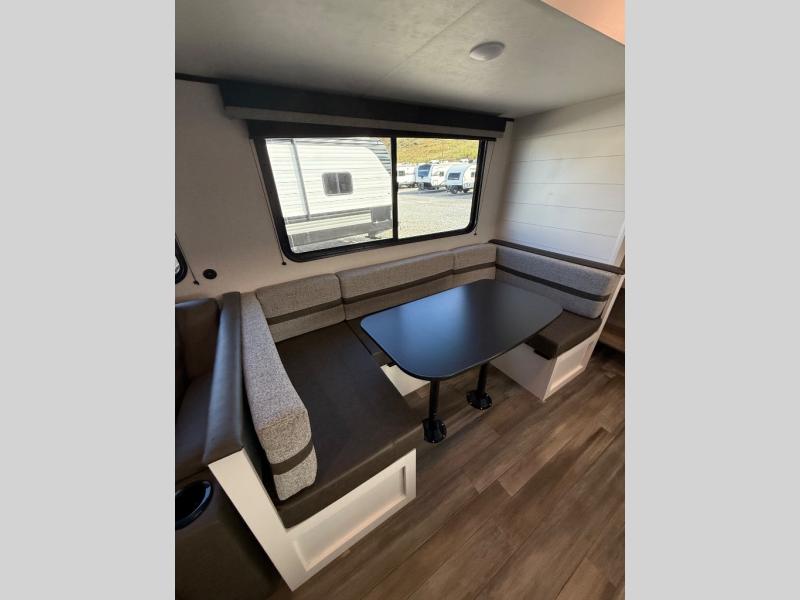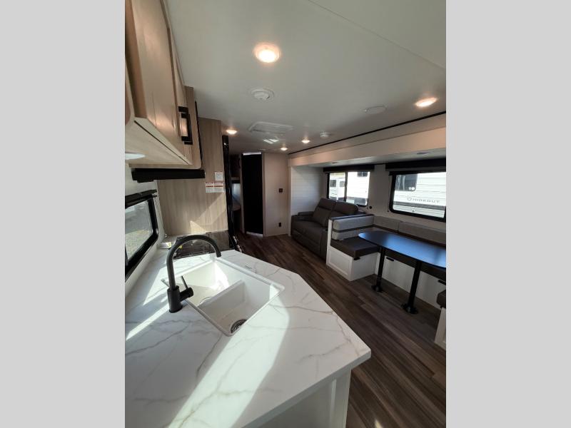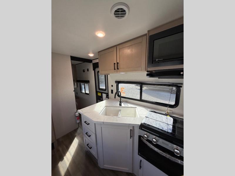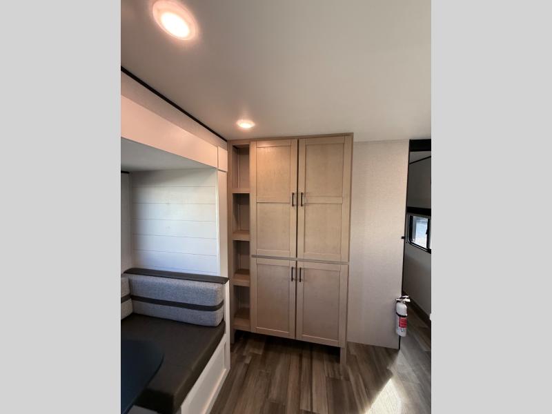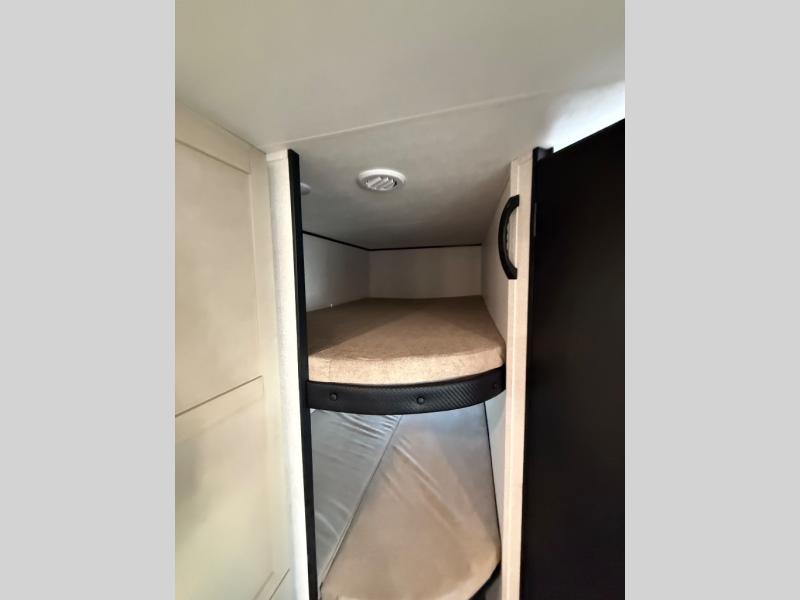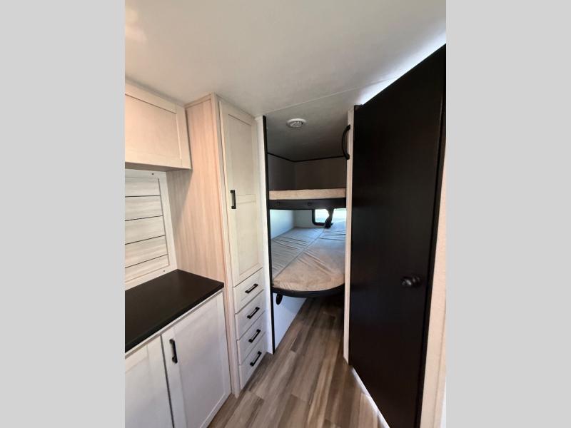 This travel trailer with double-size bunks is spacious and cozy! Once you've unloaded the exterior storage, your crew can put out the 18' power awning with LED lights, then relax in your camp chairs. There is also an outdoor camp kitchen here with an outside refrigerator and storage for snacks. When you're ready to make lunch, there is a three-burner cooktop and microwave oven inside, plus comfortable seating on the jack-knife sofa and U-shaped dinette. And an entertainment center with a fireplace will make this space feel more like home! You're sure to appreciate the front private bedroom with an RV queen bed, dual wardrobes, and overhead storage for books.