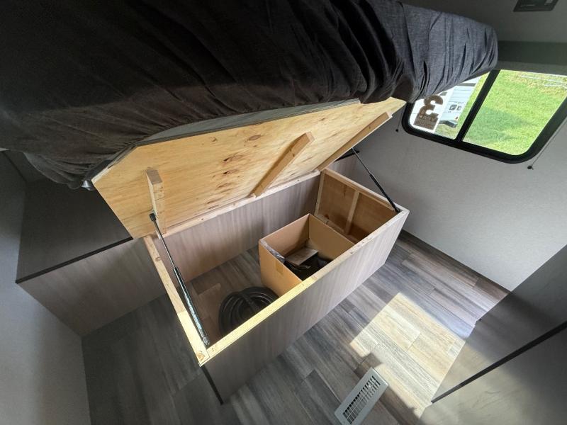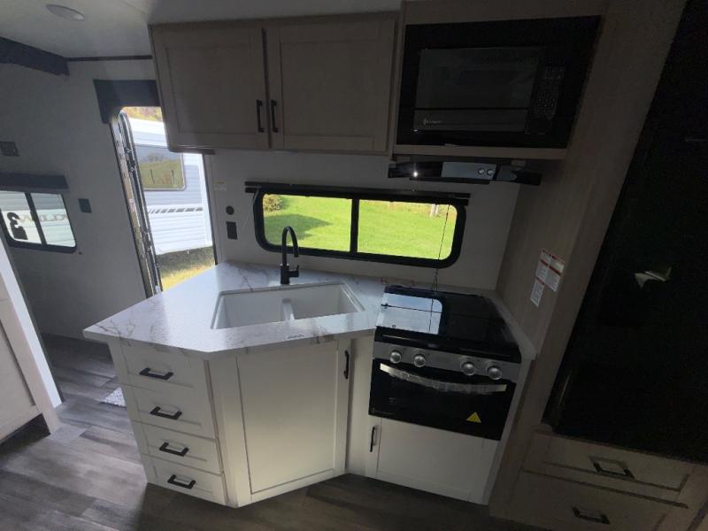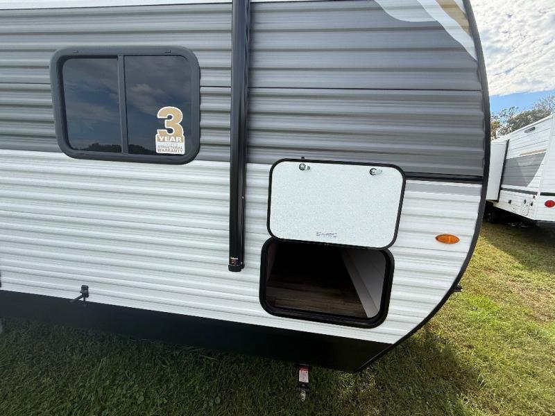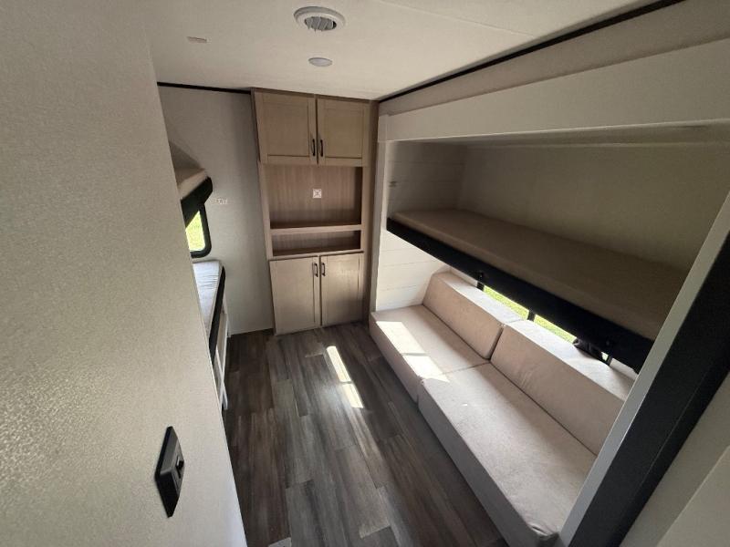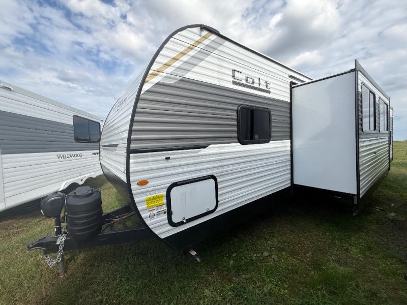 The perfect family-friendly travel trailer is found with this Colt! You will appreciate dual entry doors, with one leading into the full bath for convenience. The rear private bunkhouse features a slide out for more space, along with a bunk bed above a futon sofa plus a set of bunks across the room. The second slide out is found in the combined kitchen and living room, which houses the U-shaped dinette and jack-knife sofa. When your crew is getting hungry, the chef of your group will have their choice to cook indoors on the three-burner cooktop or at the outside kitchen. And each night you can retreat to the front private bedroom for a great night's rest on the RV queen bed!