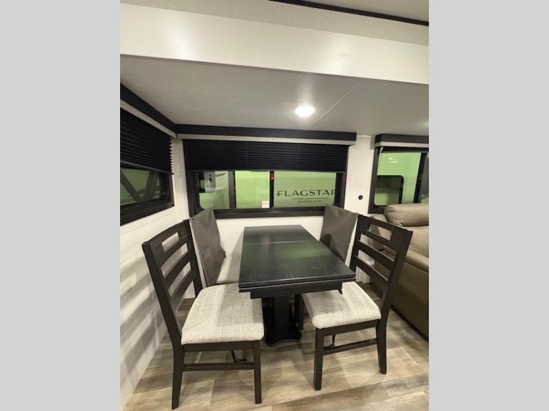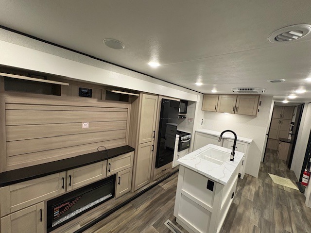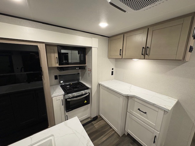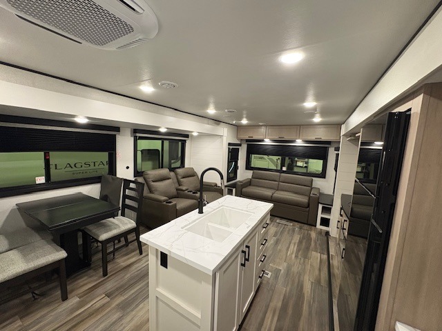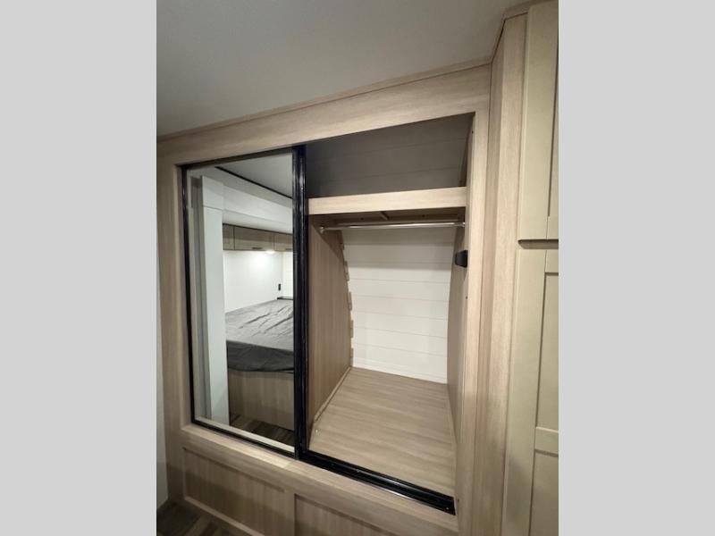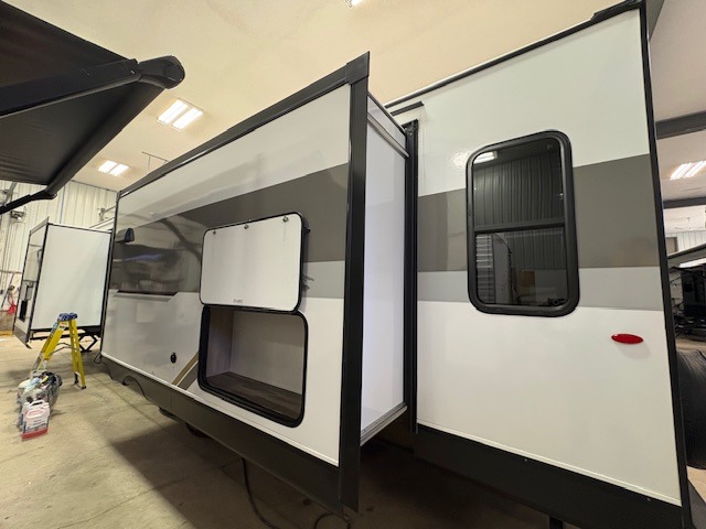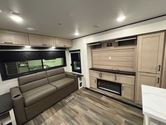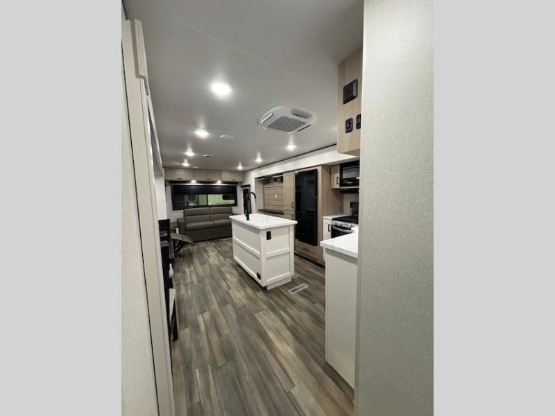 Expect to find comfort at every turn in this spacious travel trailer! Not only are there dual opposing slides in the combined kitchen and living room, but there is also a queen bed slide out in the front master bedroom. The front wardrobe here will let you keep your clothes wrinkle-free, and there is even washer/dryer prep if you plan to add these appliances. You'll find all the appliances needed to cook and store food, including a three-burner cooktop, a pantry, hutch, plus a kitchen island for more counter space! In the evenings, your crew can play games at the booth dinette, relax on the theater sofa across from the entertainment center and fireplace, and let guests sleep on the rear jack-knife sofa!
