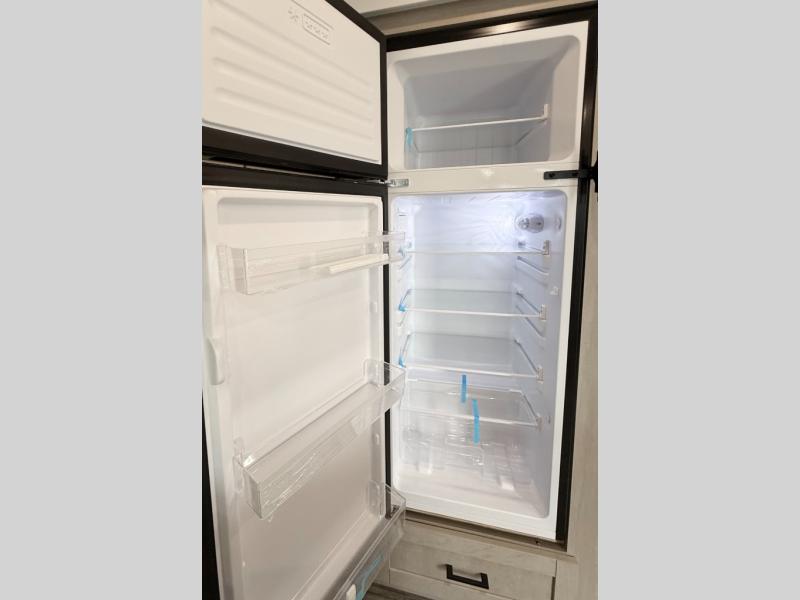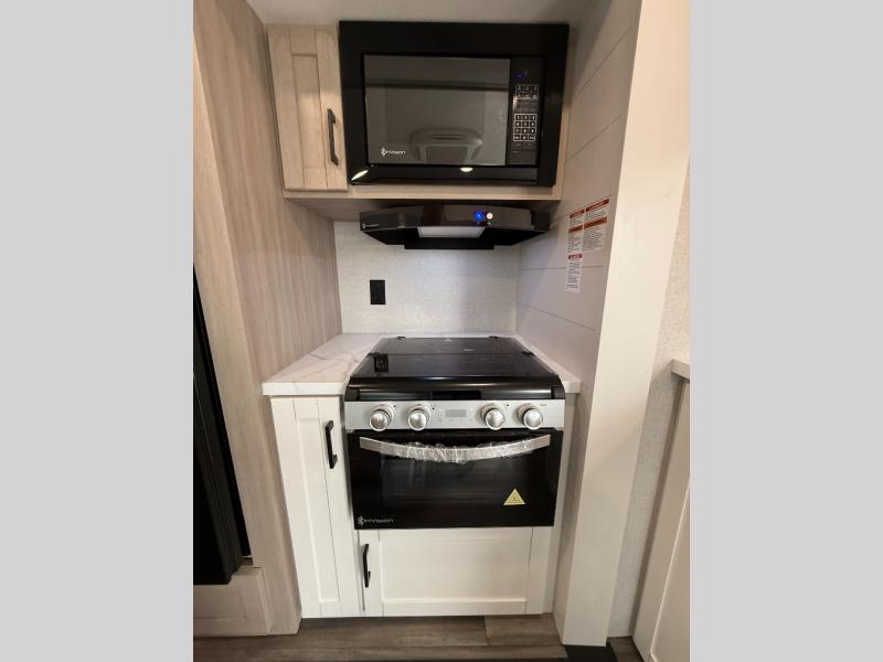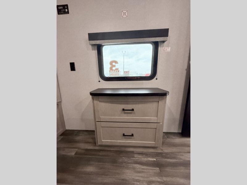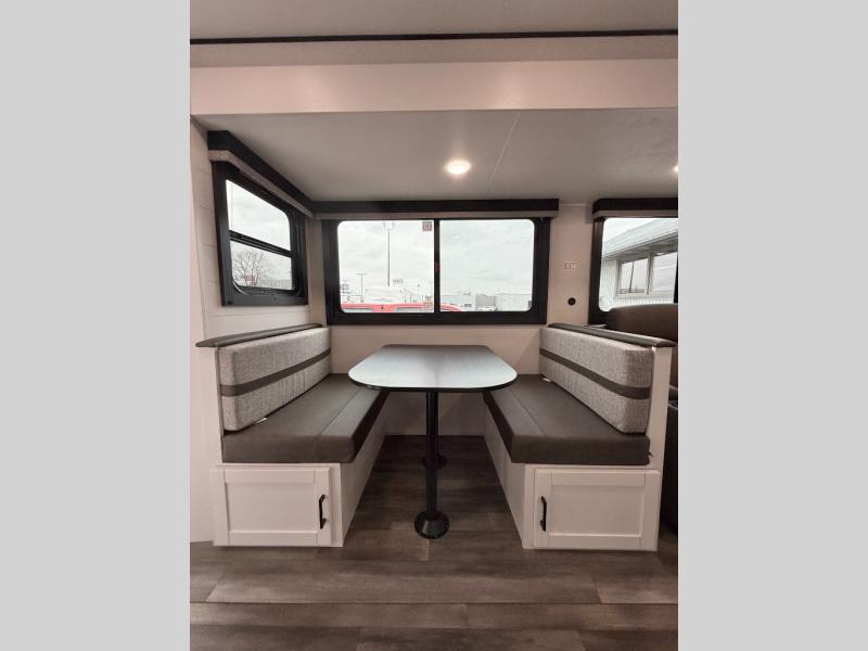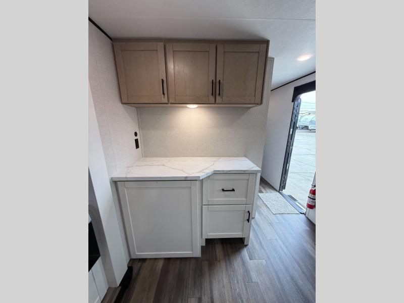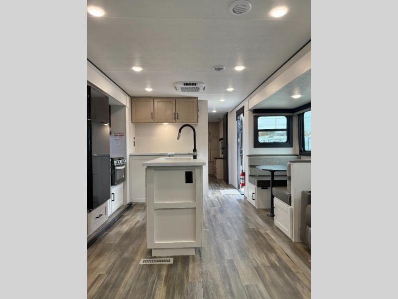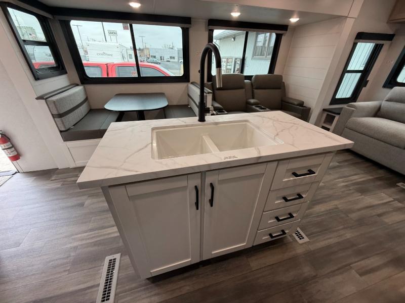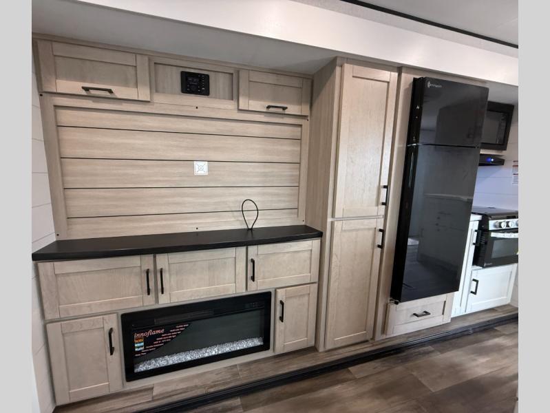 Expect to find comfort at every turn in this spacious travel trailer! Not only are there dual opposing slides in the combined kitchen and living room, but there is also a queen bed slide out in the front master bedroom. The front wardrobe here will let you keep your clothes wrinkle-free, and there is even washer/dryer prep if you plan to add these appliances. You'll find all the appliances needed to cook and store food, including a three-burner cooktop, a pantry, hutch, plus a kitchen island for more counter space! In the evenings, your crew can play games at the booth dinette, relax on the theater sofa across from the entertainment center and fireplace, and let guests sleep on the rear jack-knife sofa!