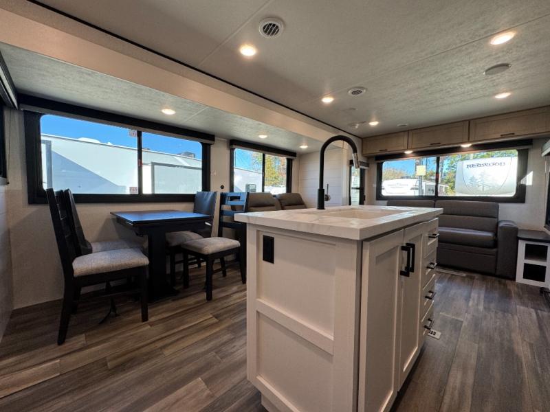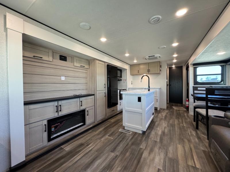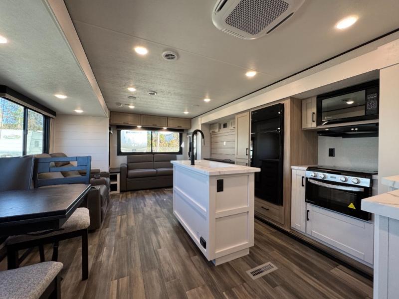 The 2026 Open Range Colt 33RLT at Recreation USA is designed for couples who want Fifth Wheel luxury in a travel trailer package. With dual opposing slides in the rear living area, it offers a massive entertaining space centered around a kitchen island and theater seating.