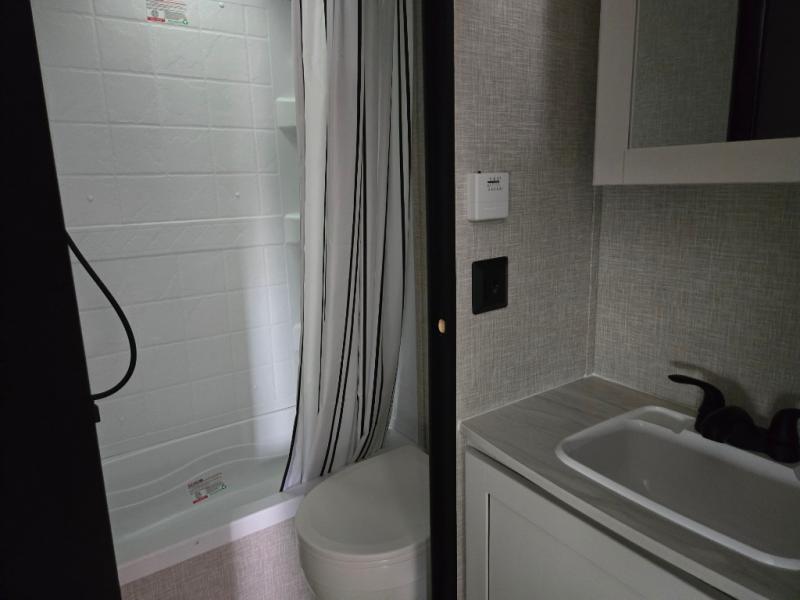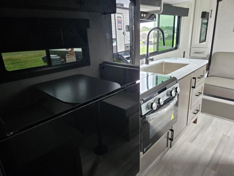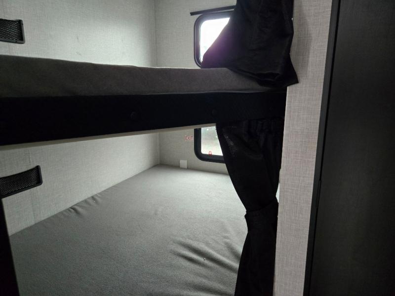 This versatile travel trailer is perfect for those wanting extra seating space during the day and extra sleeping space at night thanks to the Murphy bed. There are dual wardrobes on either side of the bed which will make it feel more like a bedroom at night, and double-size bunks can sleep four, so invite your friends along! Meals can be cooked on the three burner cooktop or in the microwave oven, and you'll appreciate an outdoor grill hookup with LP disconnect if you want to bring your own grill along.