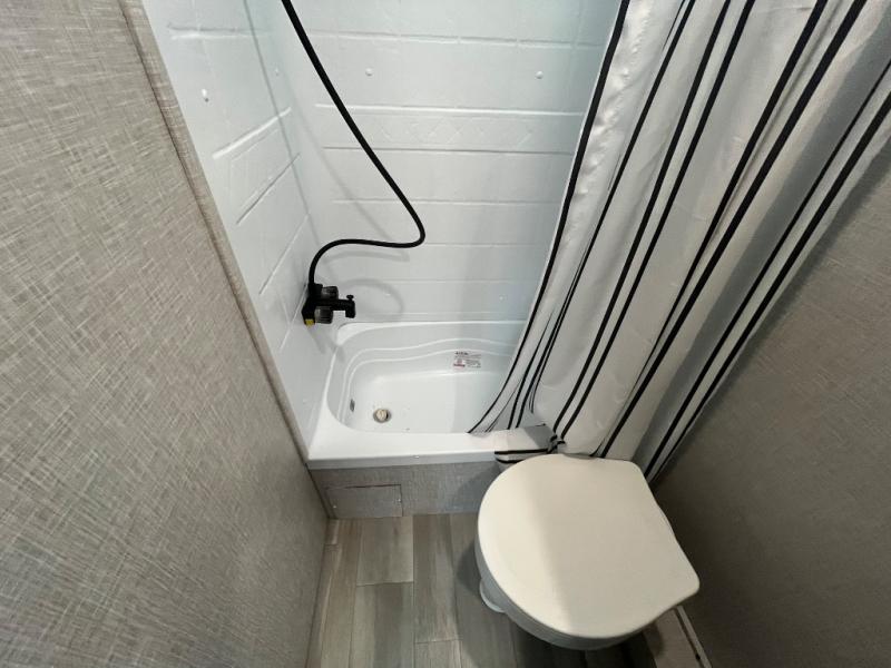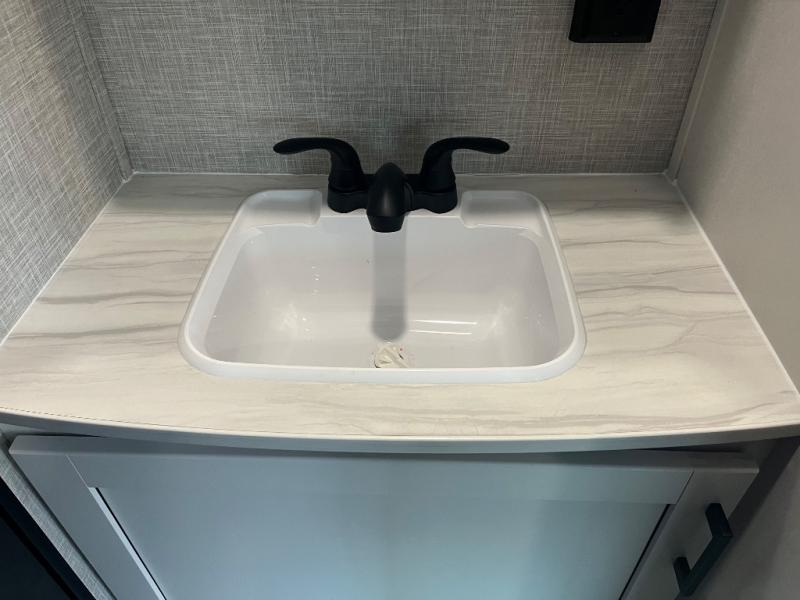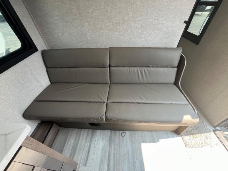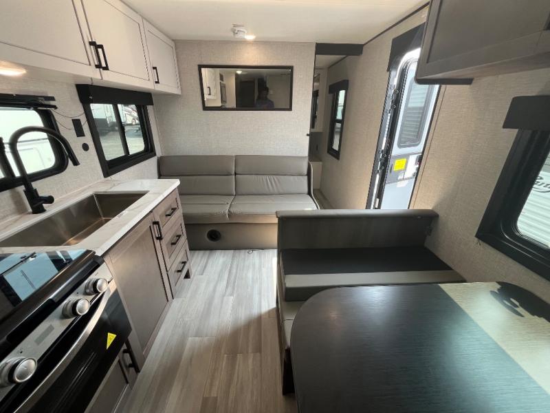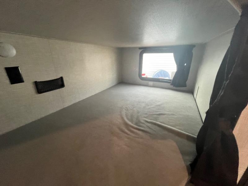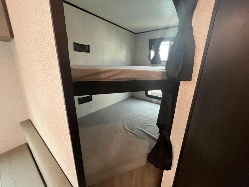This dual-axle travel trailer can sleep eight people each night, so invite your family or friends along. You will enjoy the private bedroom up front with dual wardrobes to keep your clothes tidy. While the chef of your group is preparing lunch on the three burner cooktop, everyone else can visit on the jack-knife sofa or play a game at the booth dinette. You will also find a large 18' power awning with LED lights outdoors which is where you may usually find everyone. The private bath is right next to the double-size bunks for convenience, and the sink is just outside of this room so two people can freshen up at once.