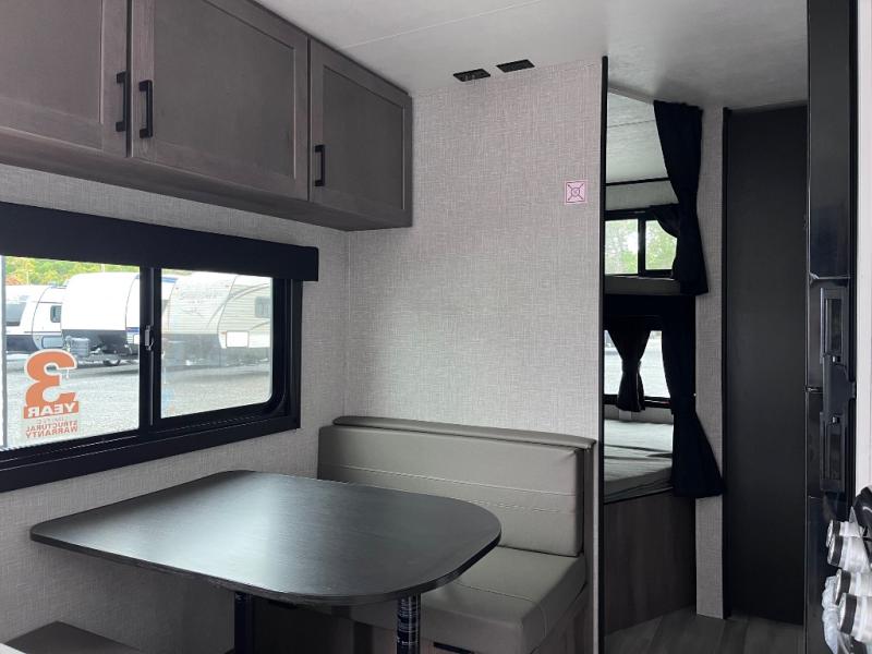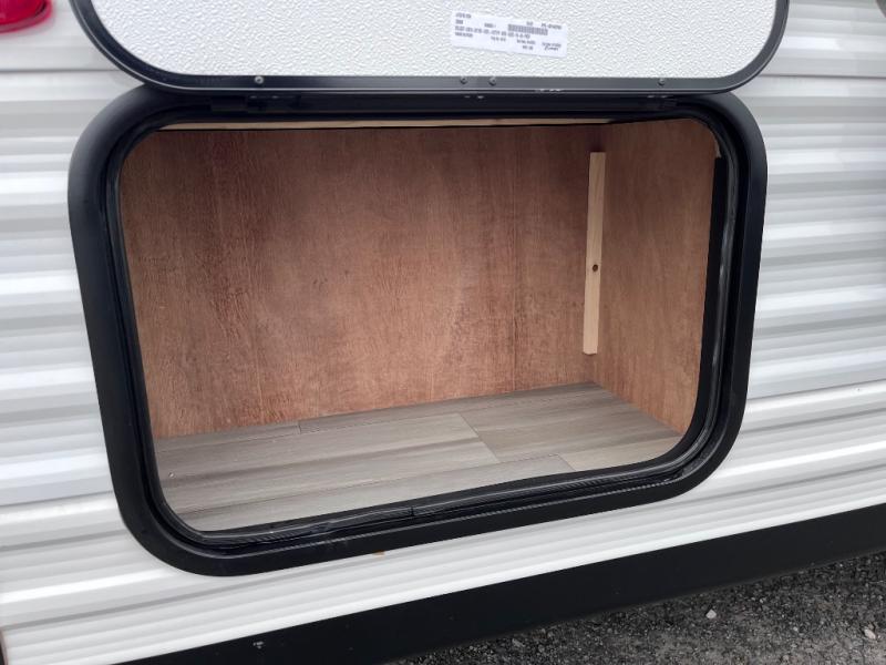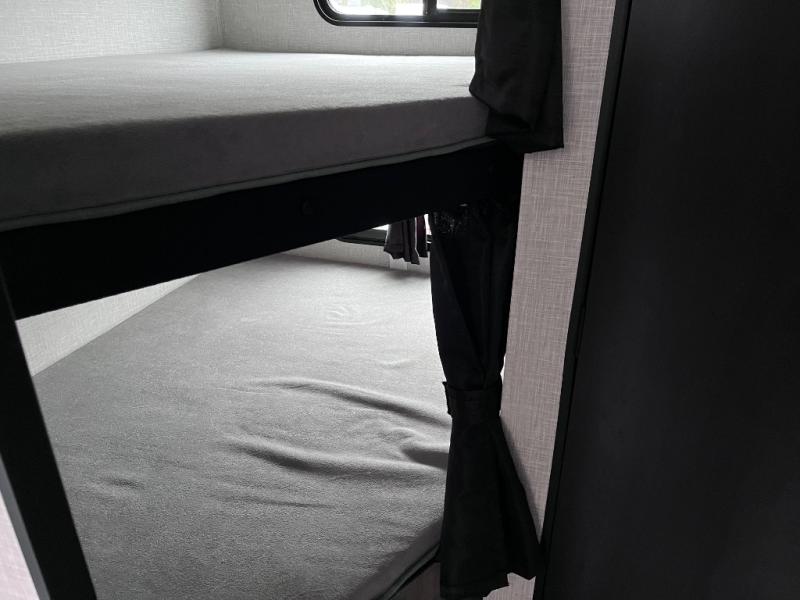 This dual-axle travel trailer can sleep eight people each night, so invite your family or friends along. You will enjoy the private bedroom up front with dual wardrobes to keep your clothes tidy. While the chef of your group is preparing lunch on the three burner cooktop, everyone else can visit on the jack-knife sofa or play a game at the booth dinette. You will also find a large 18' power awning with LED lights outdoors which is where you may usually find everyone. The private bath is right next to the double-size bunks for convenience, and the sink is just outside of this room so two people can freshen up at once.