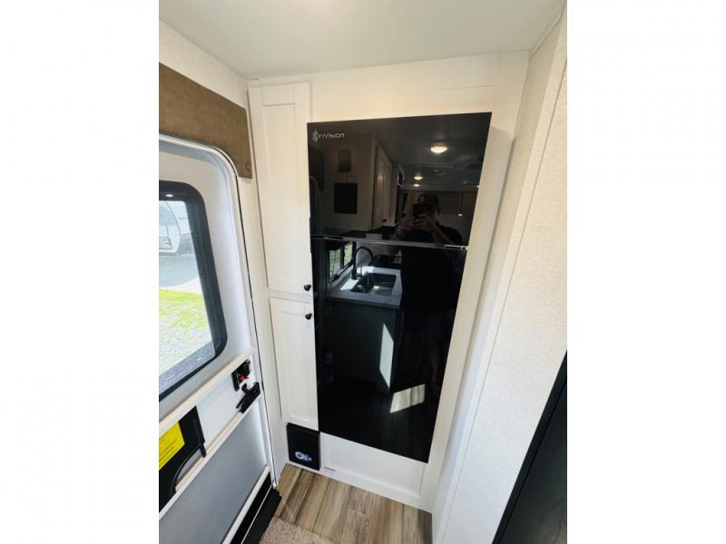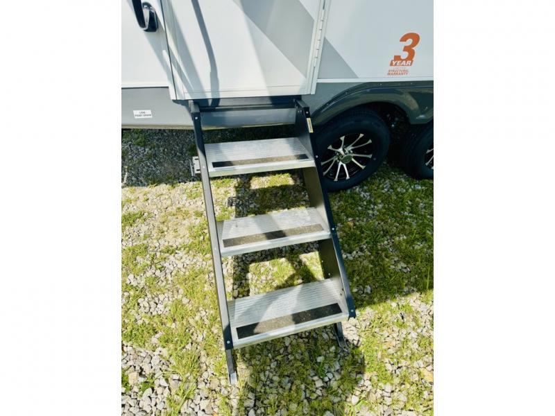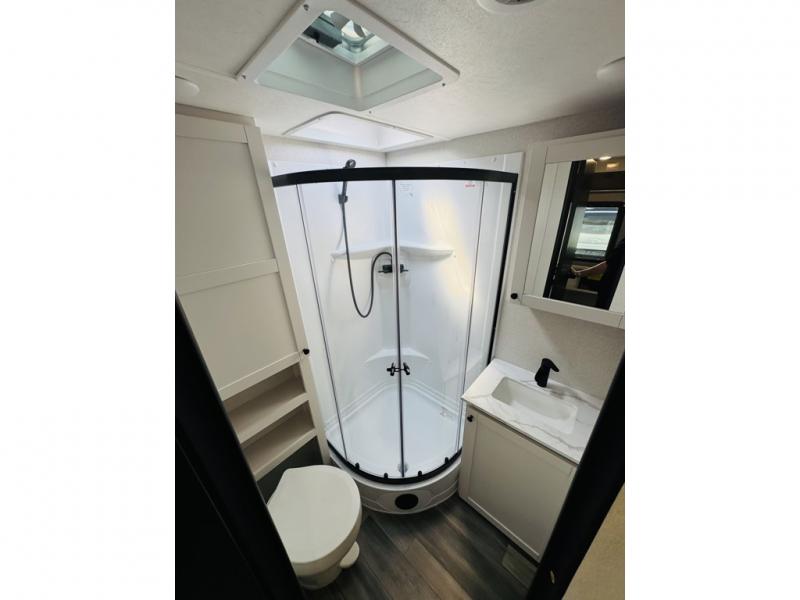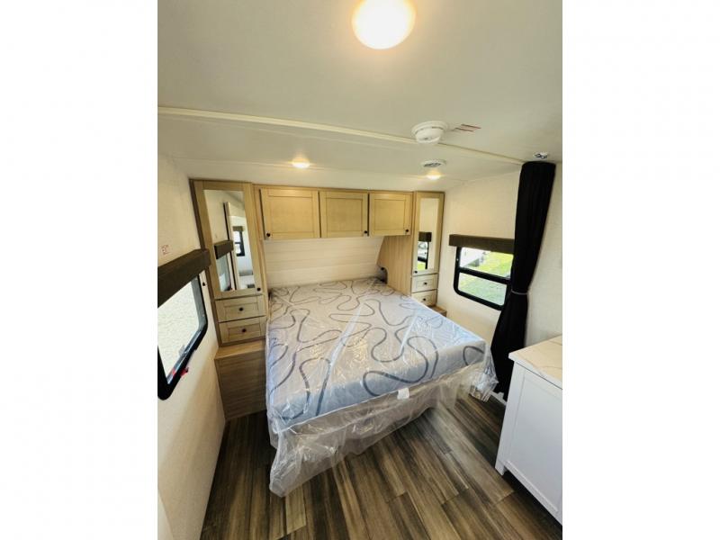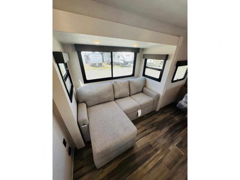 This travel trailer is the perfect couple's getaway! It features a front queen bed with wardrobes on either side for your clothes, overhead cabinets, and a privacy curtain to draw at night. You can prepare your best meals with the three burner cooktop with a 17" oven, enjoy them at the L-sofa with a table which is conveniently across from the entertainment center that has a smart HDTV, and store any leftovers in the 10 cu. ft. refrigerator. The rear corner bathroom has a radius shower to freshen up in each morning, a medicine cabinet to store your toiletries, and a linen closet to keep your towels close.