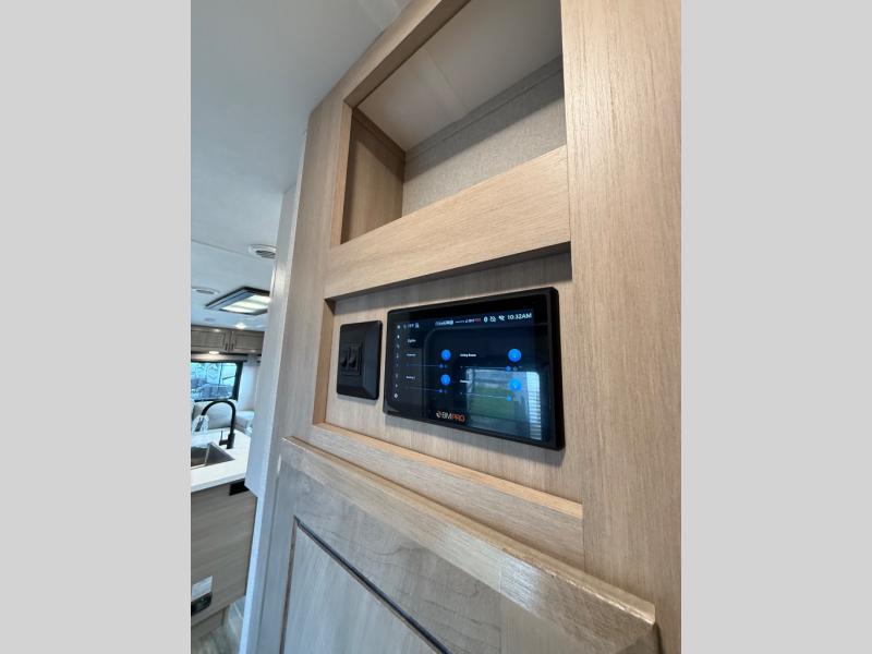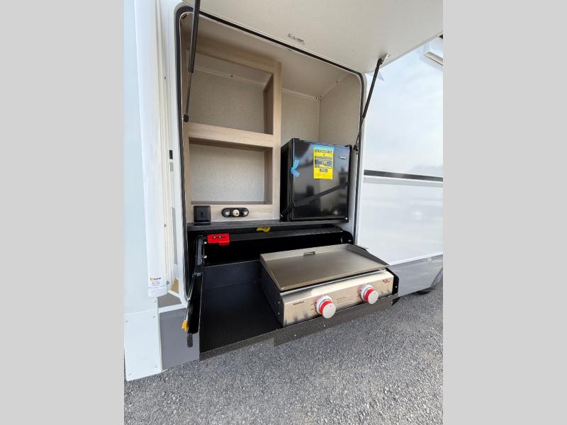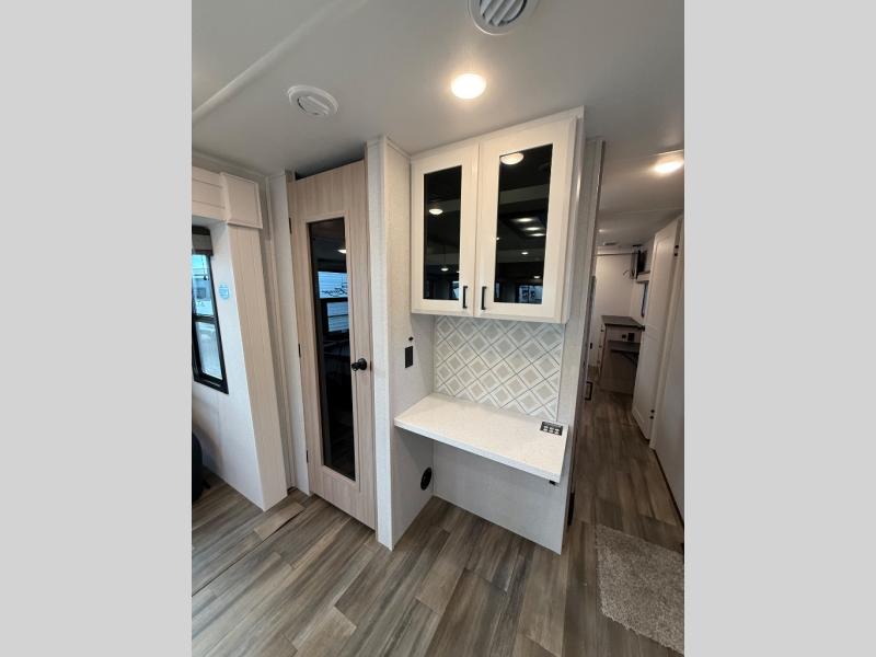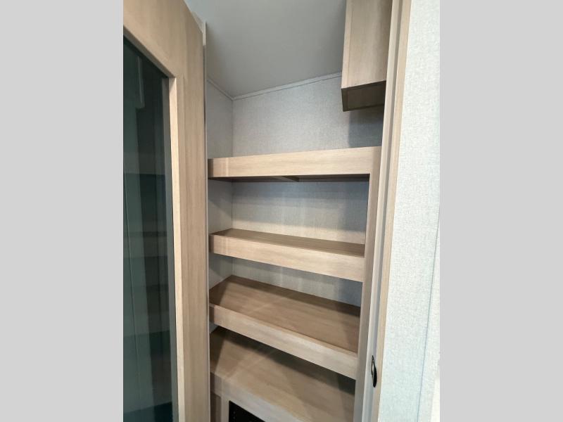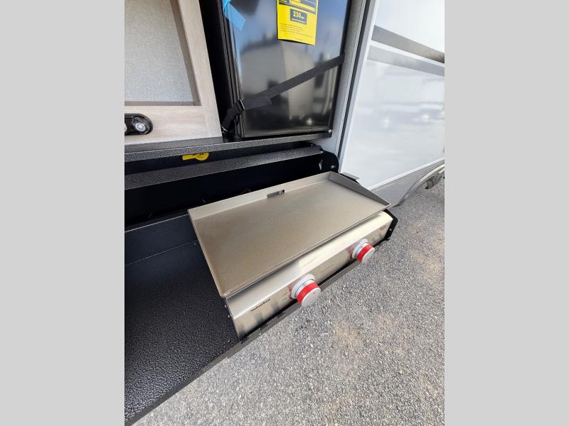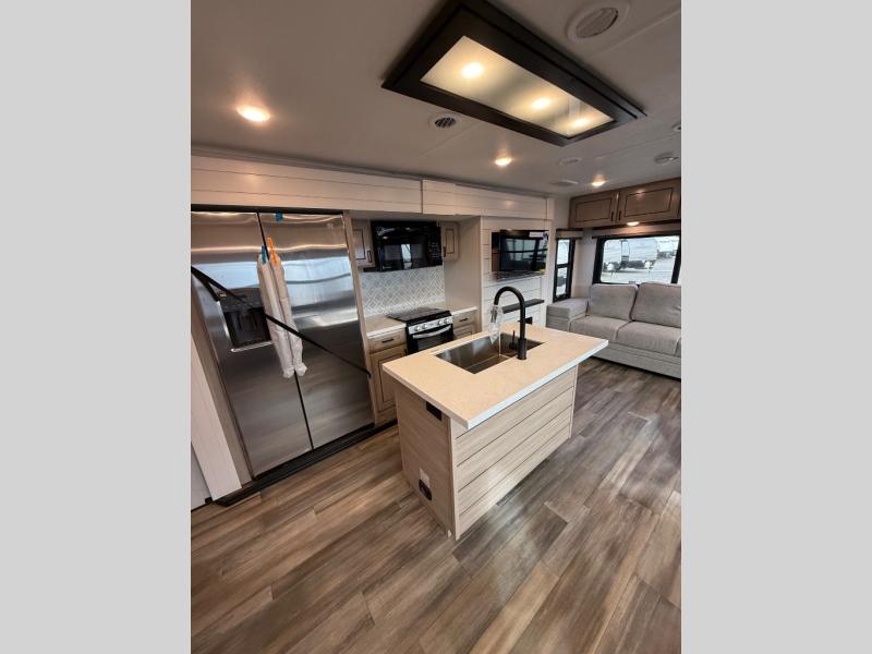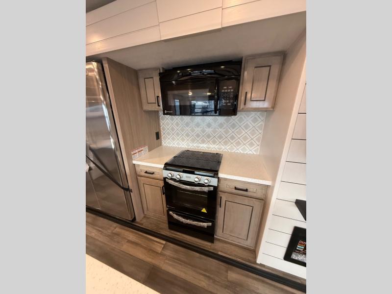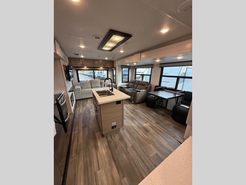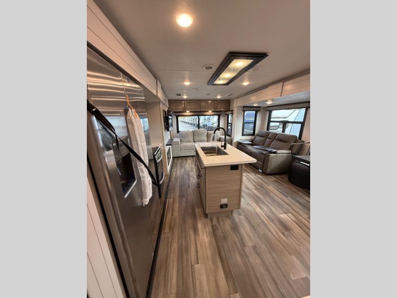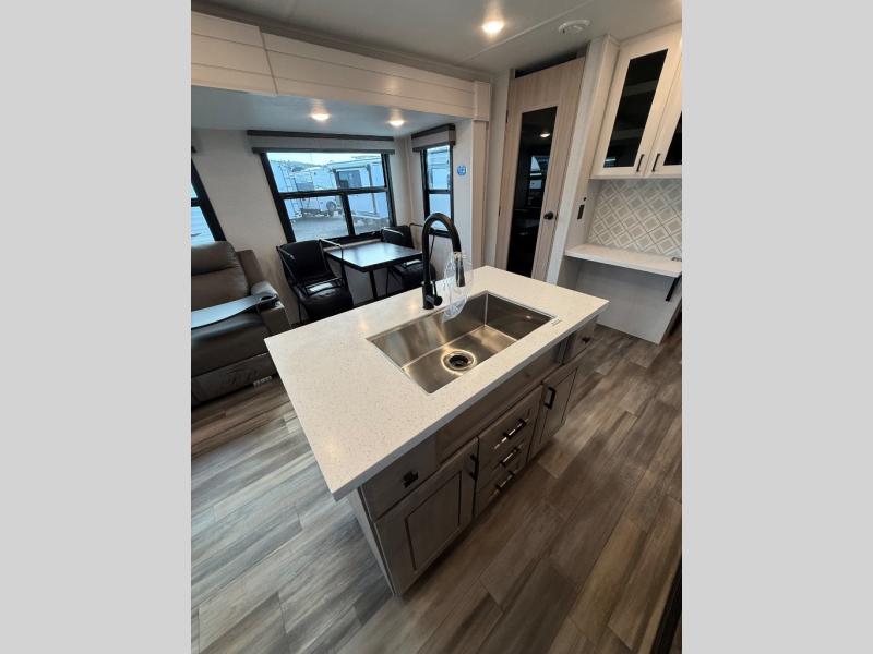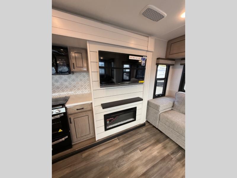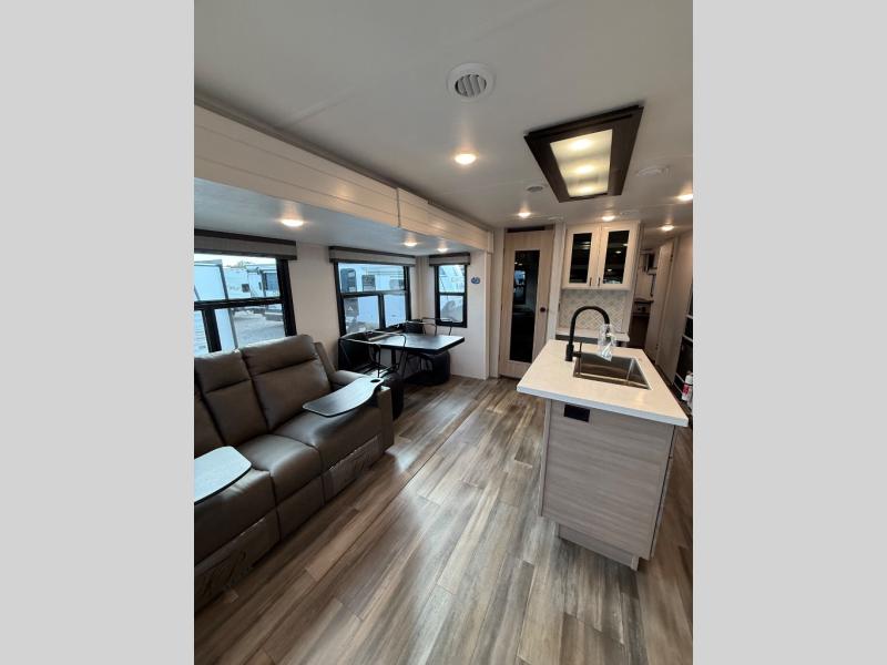 Living or camping in this trailer is made easy with all the conveniences and comforts found throughout! So, pick your destination, hitch up and head out! The private bedroom is up front and includes a mirrored wardrobe with washer and dryer prep, a king bed slide, a dresser plus access to the double entry full bath. The main living and kitchen area is spacious with dual opposing slides and offers the cook full amenities including a kitchen island and large pantry, plus you can dine at the free-standing table and chairs. The theater seats and tri-fold sofa with adjustable headrests allow you to relax while watching the Smart HDTV with a fireplace below. And don't forget about the outside kitchen when making meals and the two power awnings providing protection from the elements.