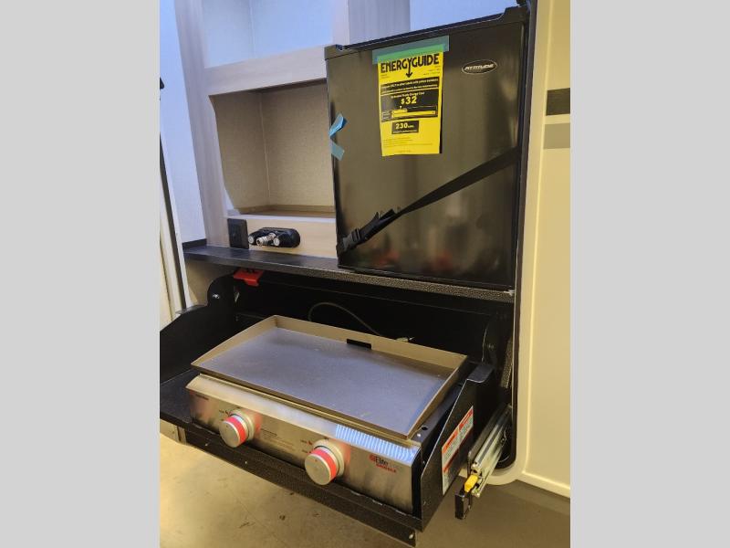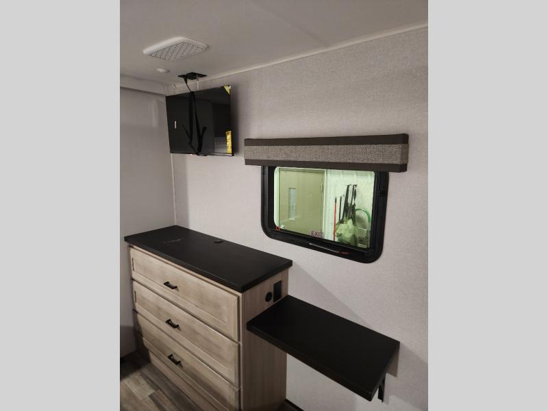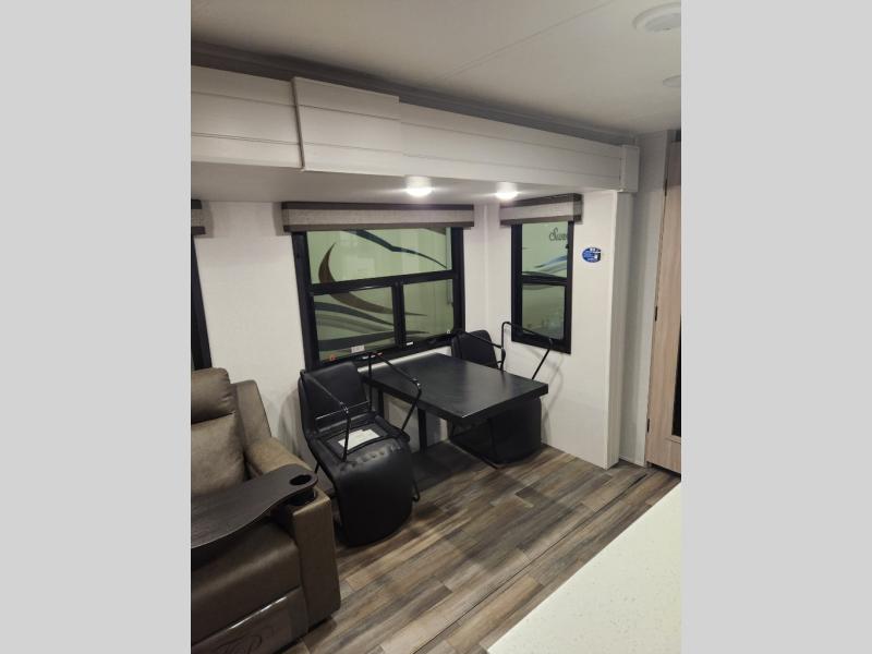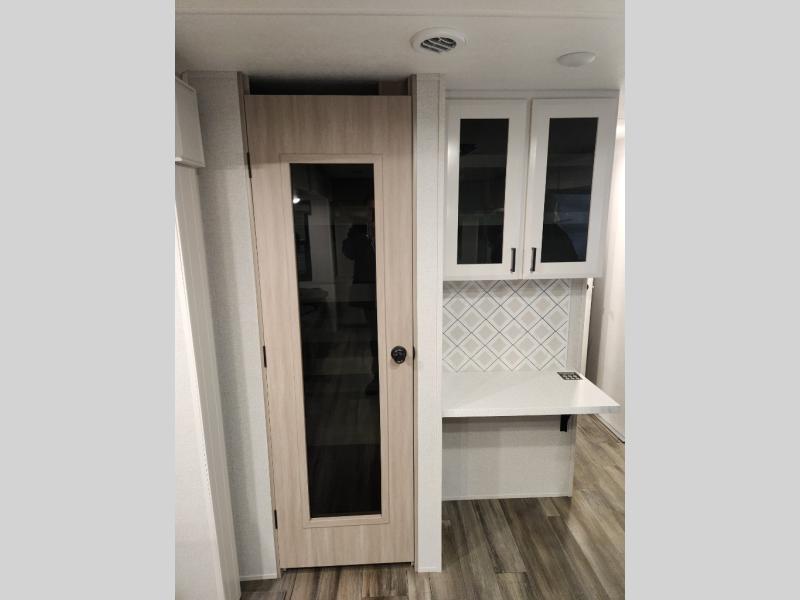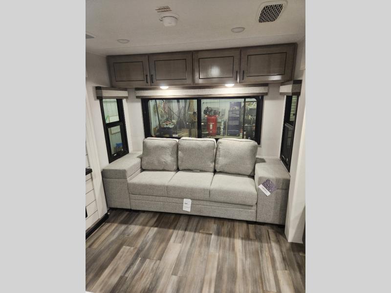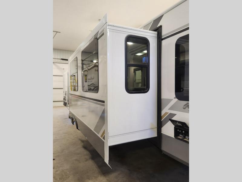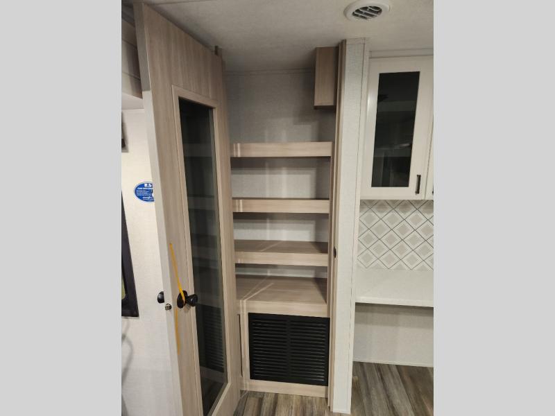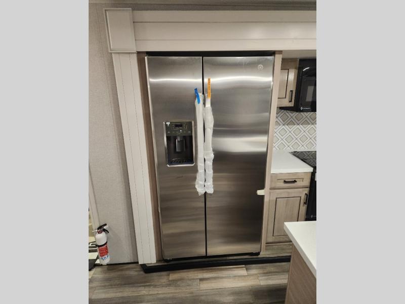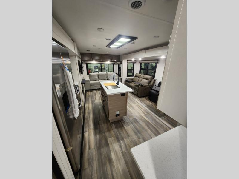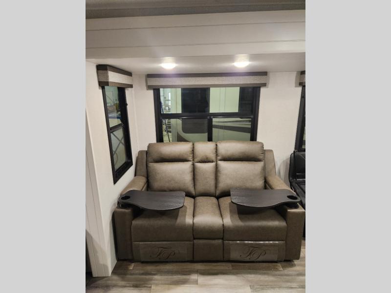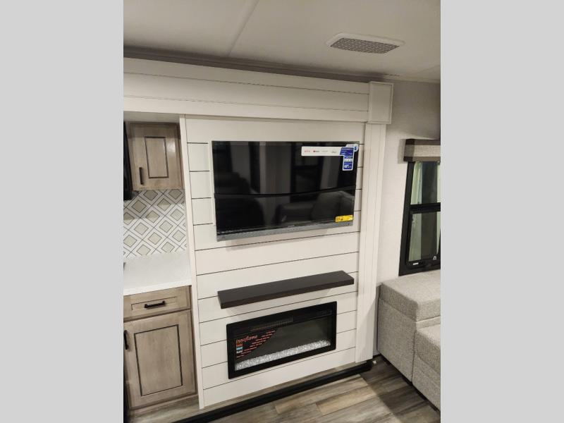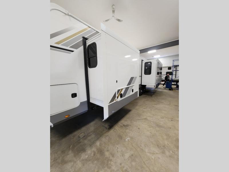 Living or camping in this trailer is made easy with all the conveniences and comforts found throughout! So, pick your destination, hitch up and head out! The private bedroom is up front and includes a mirrored wardrobe with washer and dryer prep, a king bed slide, a dresser plus access to the double entry full bath. The main living and kitchen area is spacious with dual opposing slides and offers the cook full amenities including a kitchen island and large pantry, plus you can dine at the free-standing table and chairs. The theater seats and tri-fold sofa with adjustable headrests allow you to relax while watching the Smart HDTV with a fireplace below. And don't forget about the outside kitchen when making meals and the two power awnings providing protection from the elements.