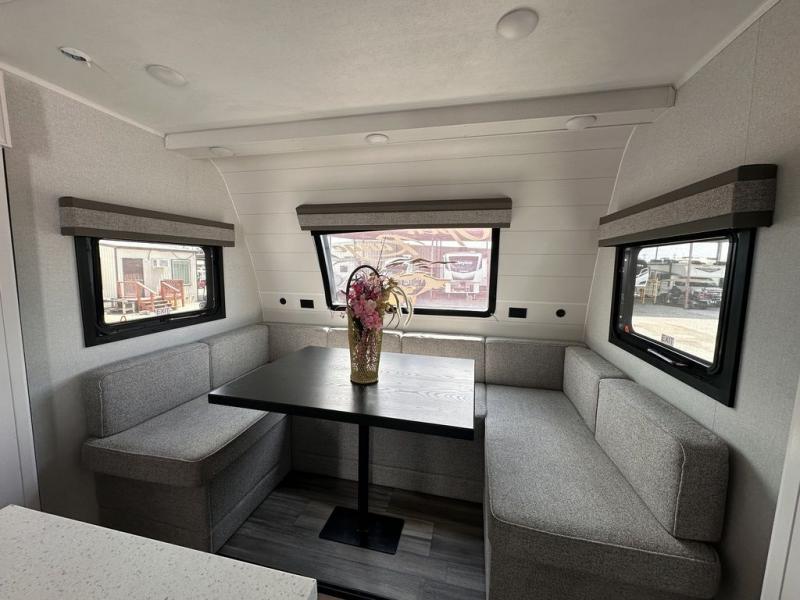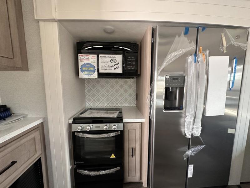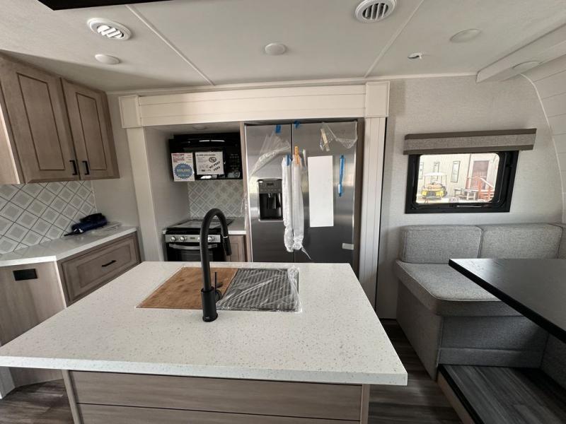 This Open Range travel trailer offers fantastic flexibility! The private rear bedroom with queen bed and king bed option is a lovely retreat, while your guests or children enjoy the middle room with a 28" x 74" bunk along with a desk. The common living area is an open space with a mega lounge with two pedestal tables, plus a U-dinette for even more seating! The frameless windows provide the perfect view! A full bath is easily accessible, and the kitchen offers a full suite of appliances plus an island for convenient work space. Outside is a second kitchen with fridge and pull-out griddle for even more fun!