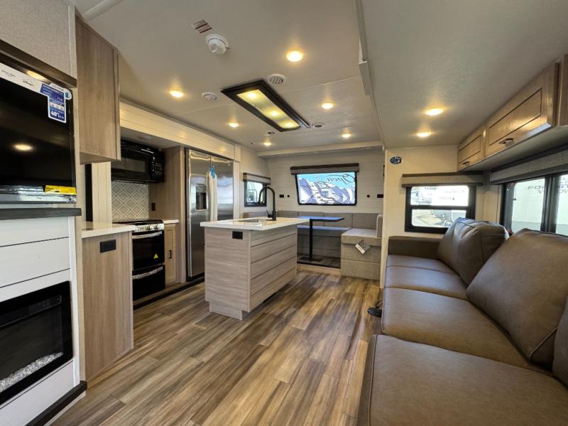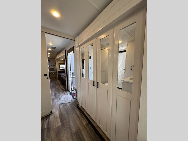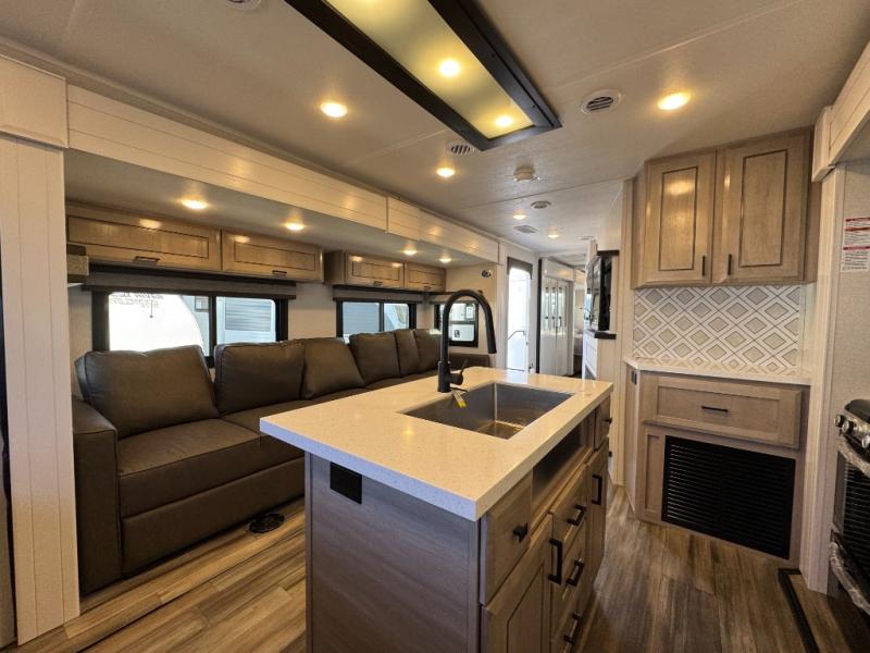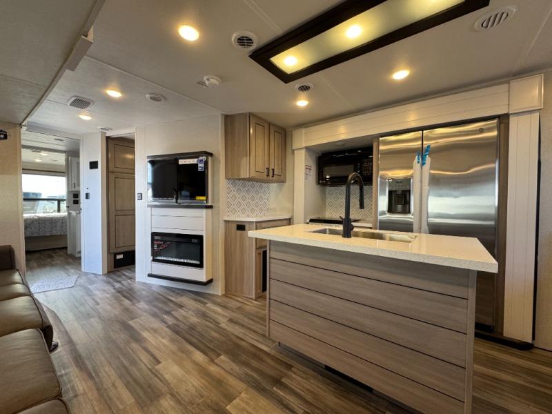 This massive 39' 6" luxury travel trailer is designed for extended stays and full-time living. With four slide-outs, the interior feels like a residential apartment. The chef-inspired kitchen features a kitchen island, solid surface countertops, and a massive 21 cu. ft. residential refrigerator. Relax in the spacious living area with theater seating and a smart HDTV, or retreat to the private front master bedroom featuring a King Bed and Washer/Dryer Prep.