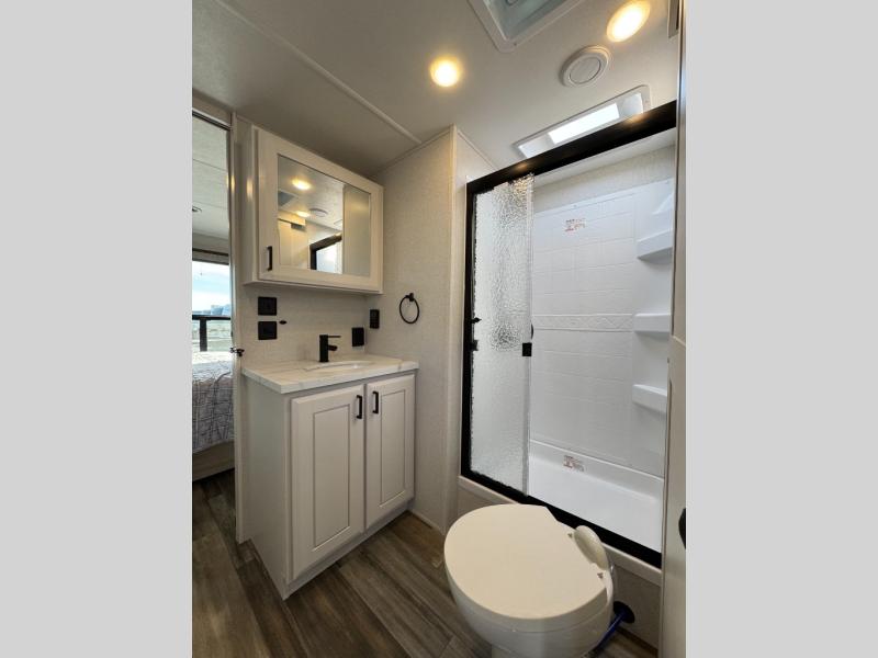 Equipped with the Executive & Four Season Packages, this RV includes a 60K BTU On-Demand Tankless Water Heater, dual 15,000 BTU A/Cs, and 7.3 Auto Leveling for easy setup. Plus, with the Xtend Solar I Package, you can stay powered up off the grid.