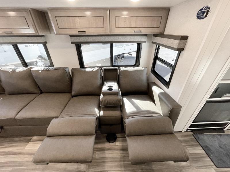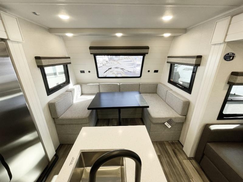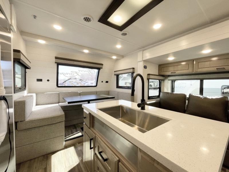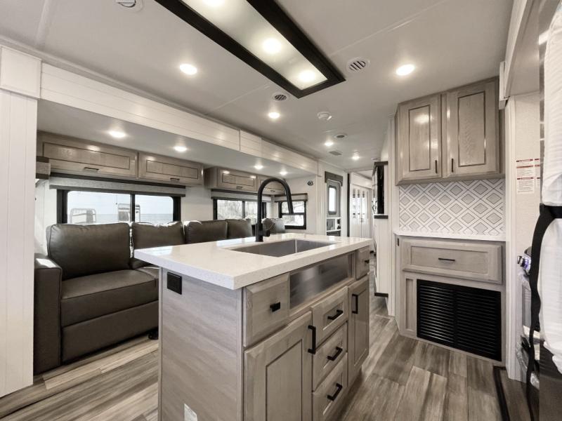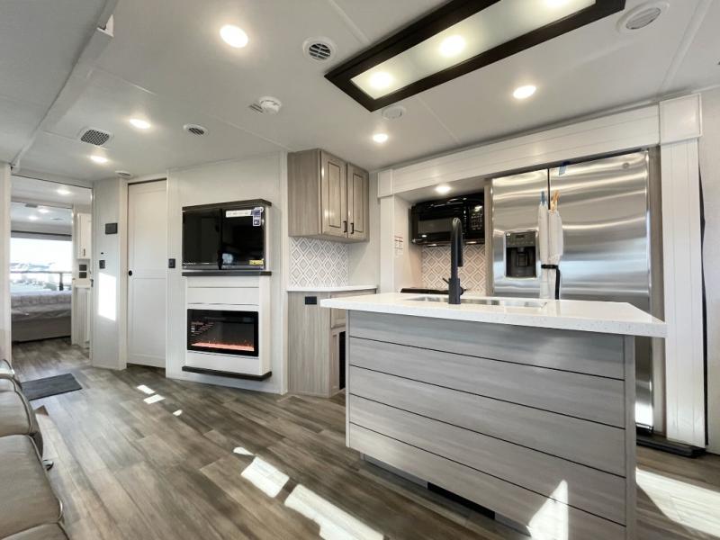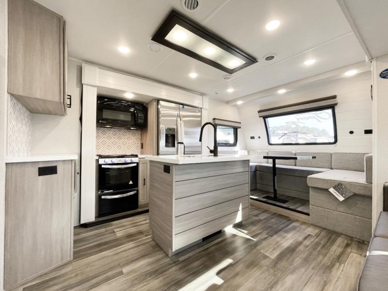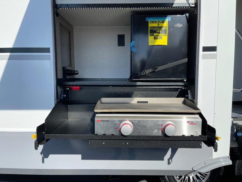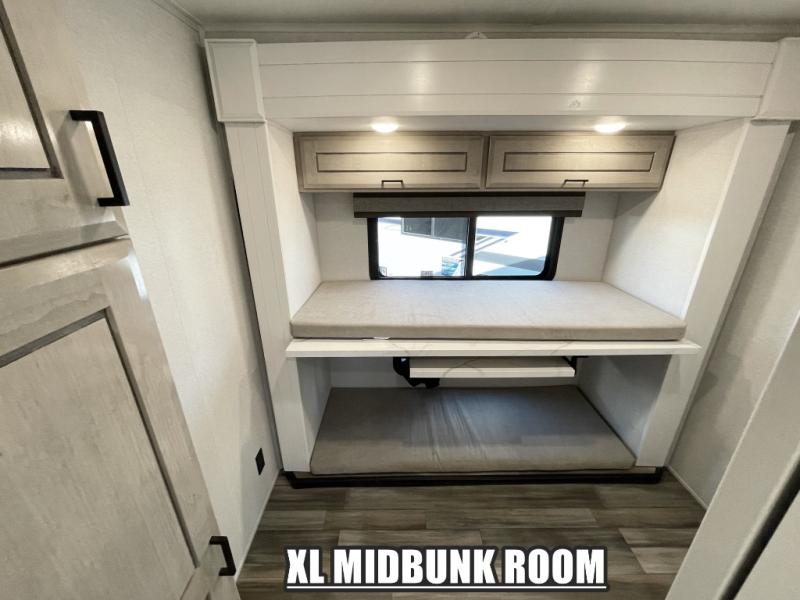 This Open Range travel trailer offers fantastic flexibility! The private rear bedroom with a king bed is a lovely retreat, while your guests or children enjoy the middle room with a bunk and desk below. The common living area is an open space with a mega lounge with two pedestal tables, plus a U-dinette for even more seating! The frameless windows provide the perfect view! A full bath is easily accessible, and the kitchen offers a full suite of appliances plus an island for convenient work space. Outside is a second kitchen with fridge and pull-out griddle for even more fun!