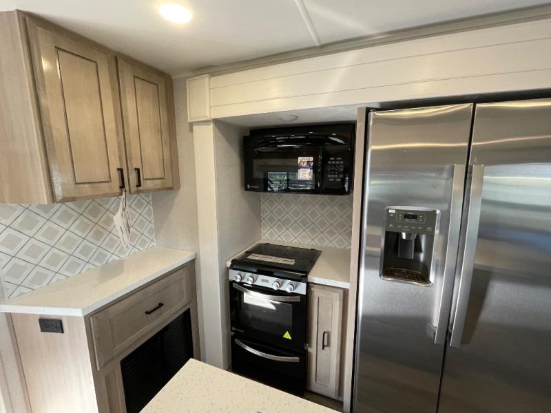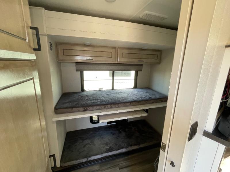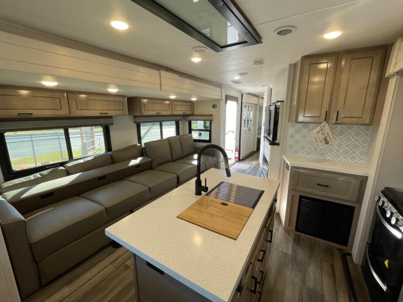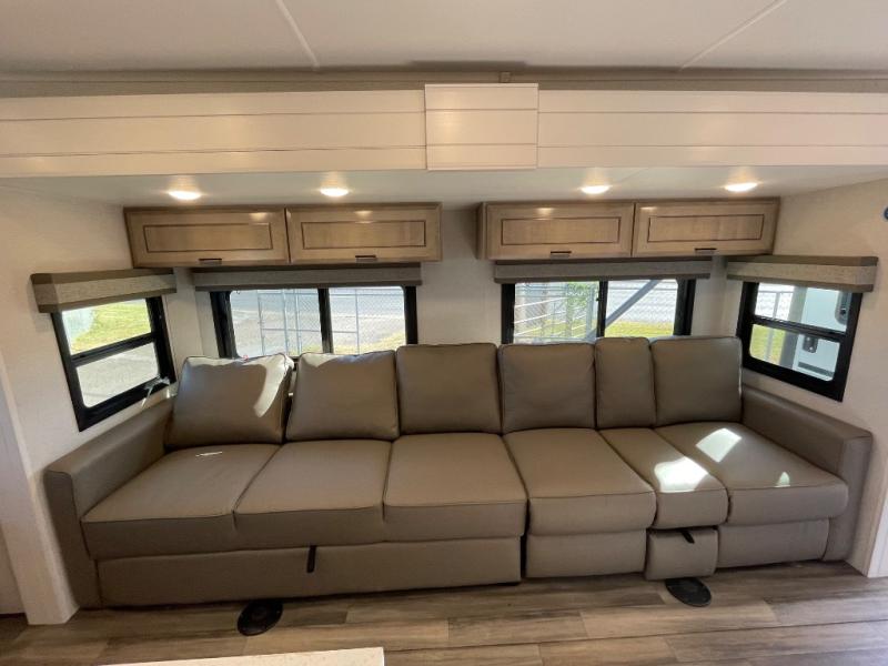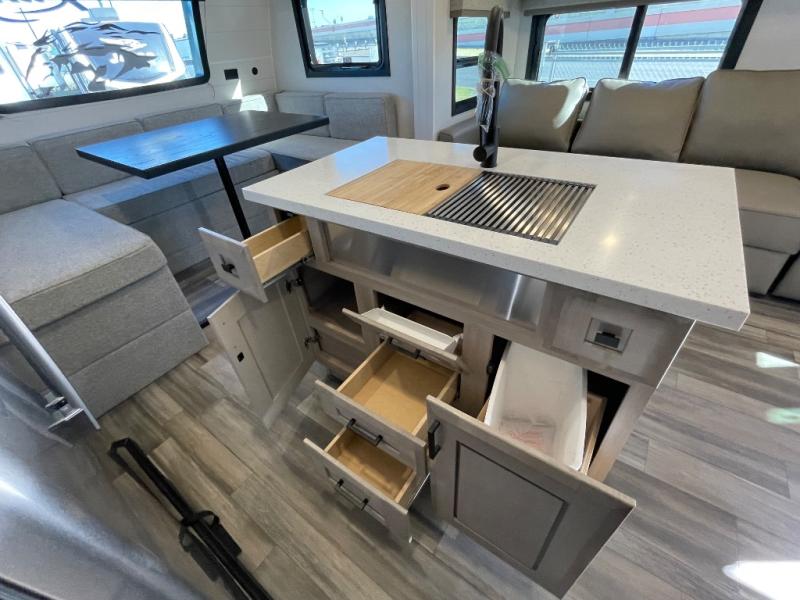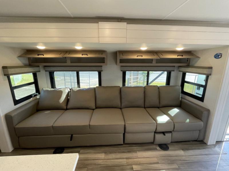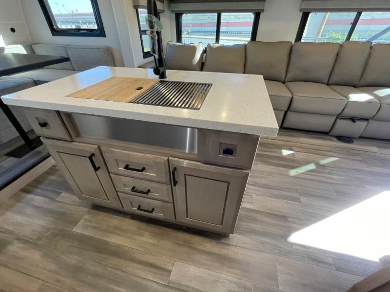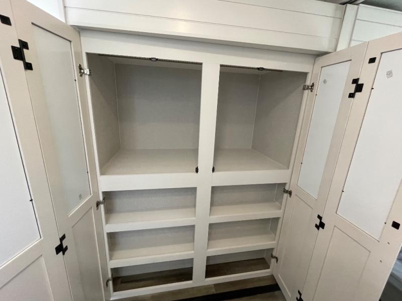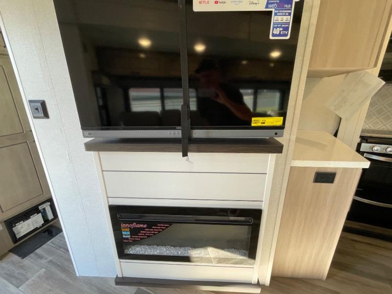 Spacious, comfortable and convenient are a few adjectives you might use when camping or even living in this trailer. The four slides throughout offer more floor space in each room from the master bedroom with a queen bed slide out, and the main living and kitchen area with dual opposing slides to the bunkhouse slide. The bedroom also offers a mirrored wardrobe, washer and dryer prep, a dresser with a window above and easy access to the double entry full bath. The rear bunkhouse gives you two bunks, a dinette, bench seating, plus a half bath for your kids or your friends. And the main area provides a mega lounge with two tables to watch the 50" Smart HDTV with a fireplace below. There are a few options offered on this model, such as a king bed in place of the queen, a larger refrigerator, and a free-standing table in place of the lounge!