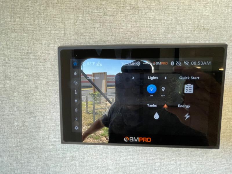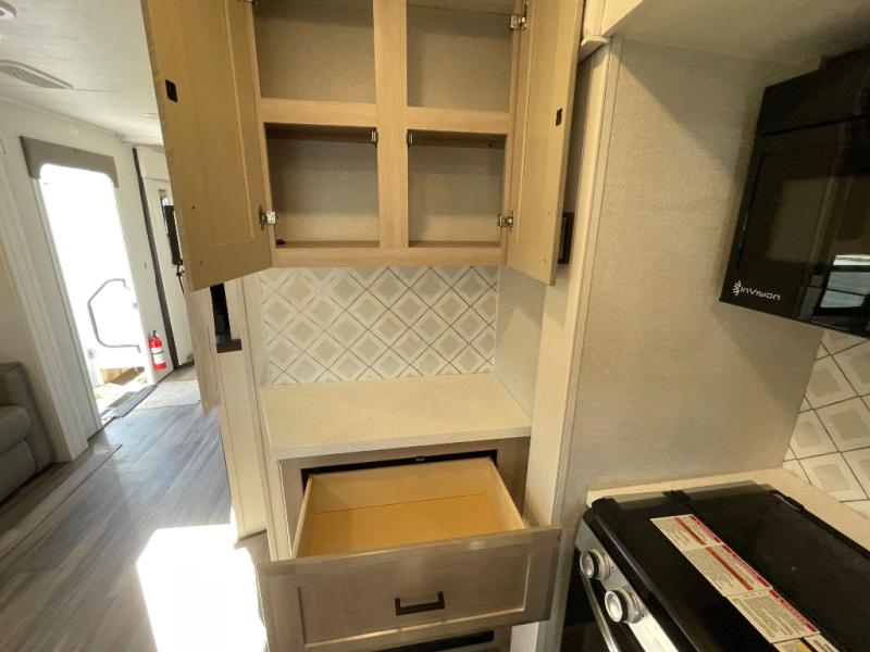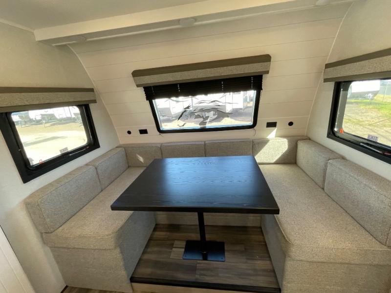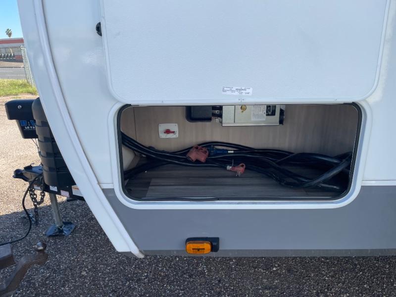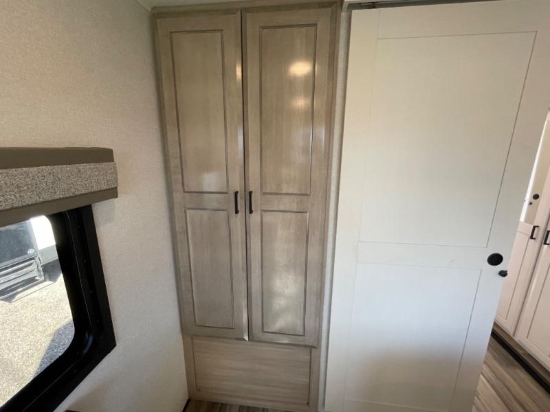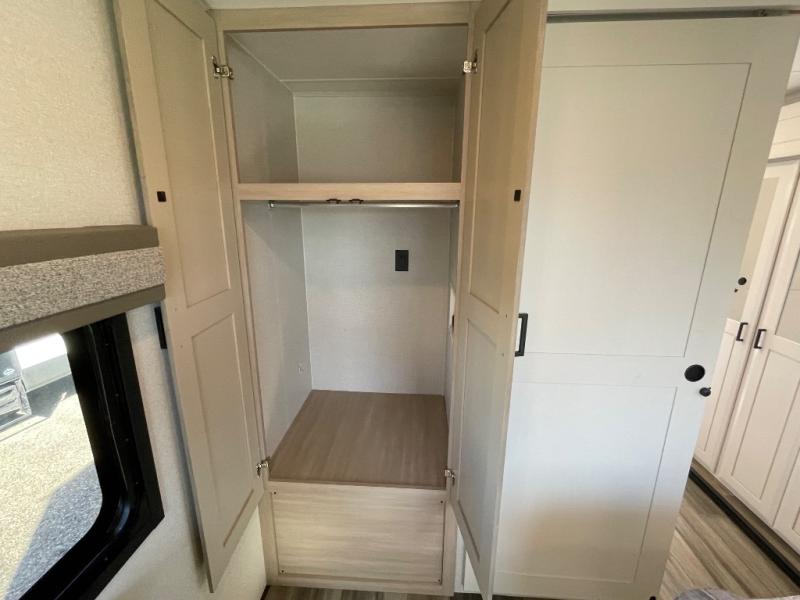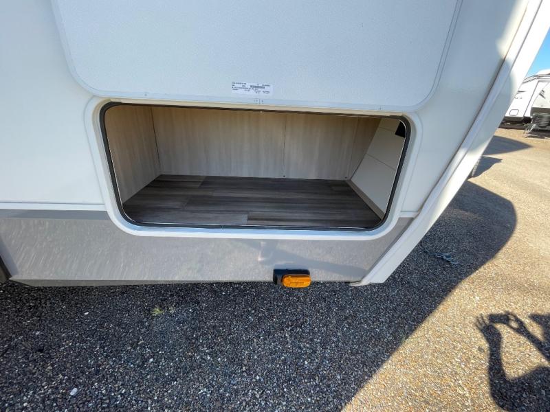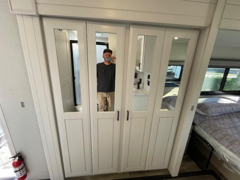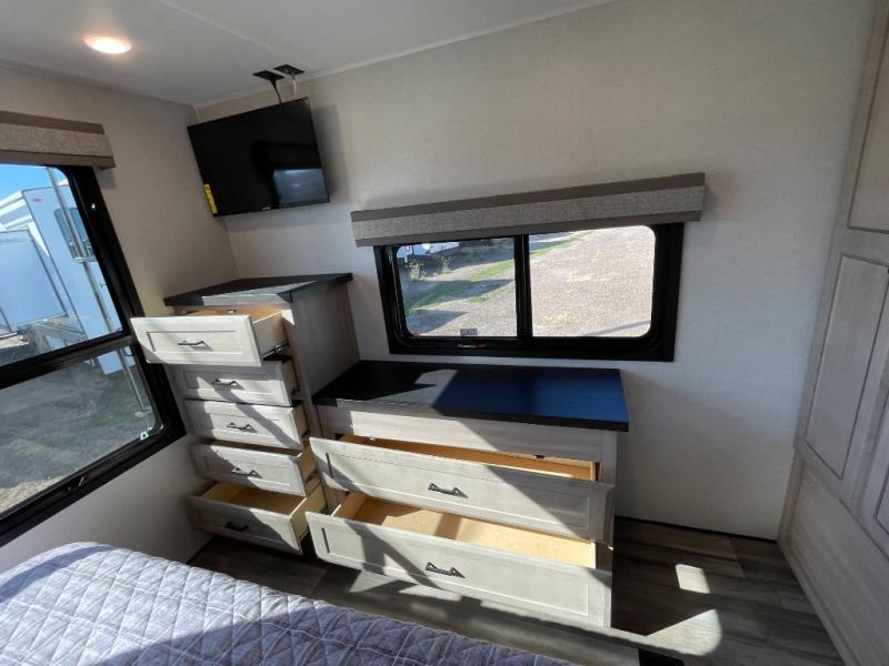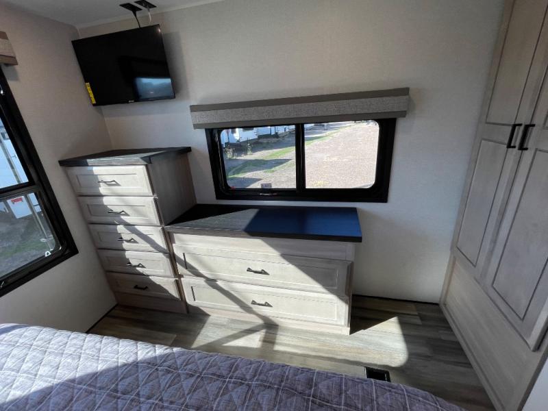 Spacious, comfortable and convenient are a few adjectives you might use when camping or even living in this trailer. The four slides throughout offer more floor space in each room from the master bedroom with a queen bed slide out, and the main living and kitchen area with dual opposing slides to the bunkhouse slide. The bedroom also offers a mirrored wardrobe, washer and dryer prep, a dresser with a window above and easy access to the double entry full bath. The rear bunkhouse gives you two bunks, a dinette, bench seating, plus a half bath for your kids or your friends. And the main area provides a mega lounge with two tables to watch the 50" Smart HDTV with a fireplace below. There are a few options offered on this model, such as a king bed in place of the queen, a larger refrigerator, and a free-standing table in place of the lounge!