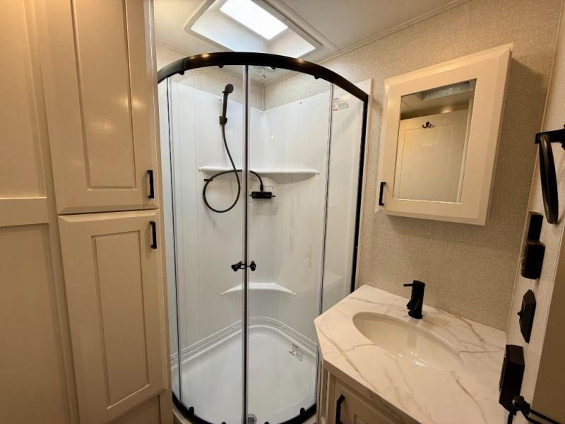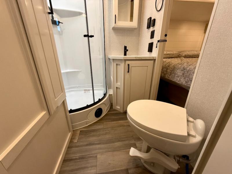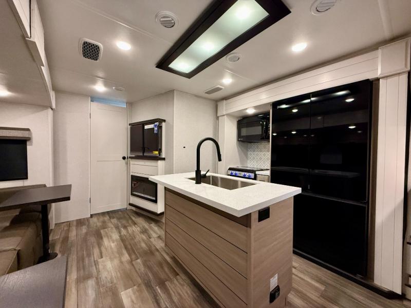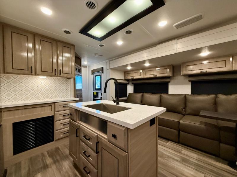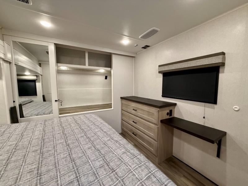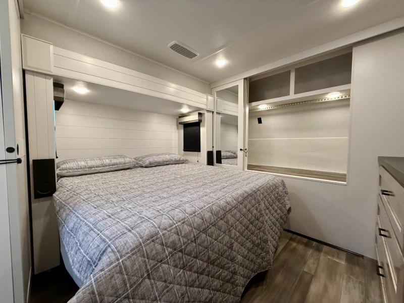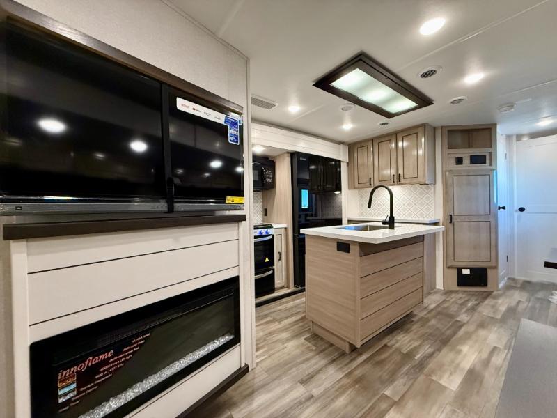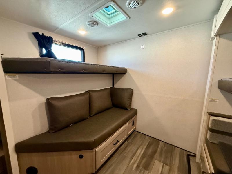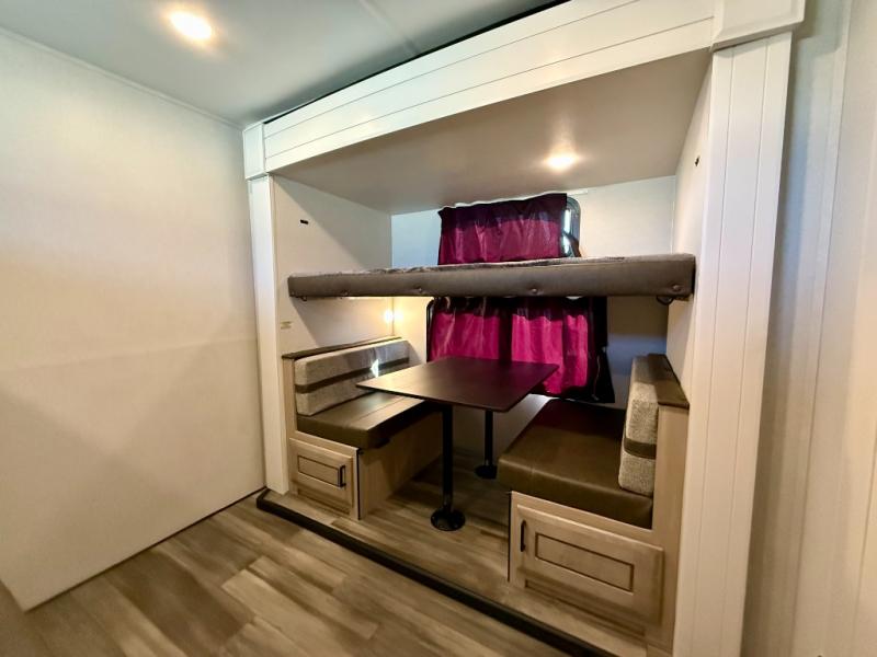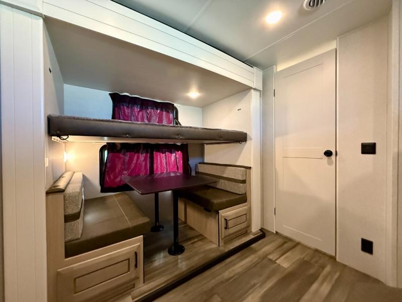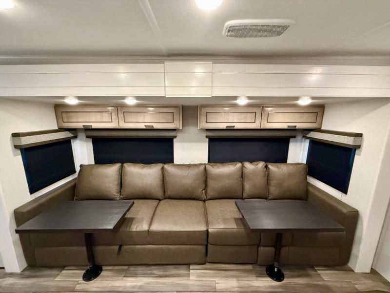 Spacious, comfortable and convenient are a few adjectives you might use when camping or even living in this trailer. The four slides throughout offer more floor space in each room from the master bedroom with a king bed slide out, and the main living and kitchen area with dual opposing slides to the bunkhouse slide. The bedroom also offers a mirrored wardrobe, washer and dryer prep, a dresser with a window above and easy access to the double entry full bath. The rear bunkhouse gives you two bunks, a dinette, bench seating, plus a half bath for your kids or your friends. And the main area provides a mega lounge with two tables to watch the Smart HDTV with a fireplace below.