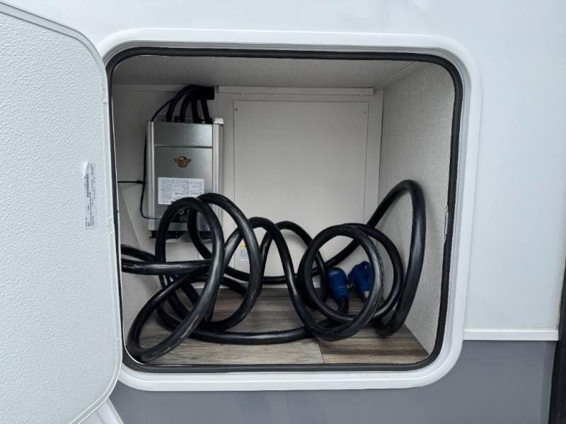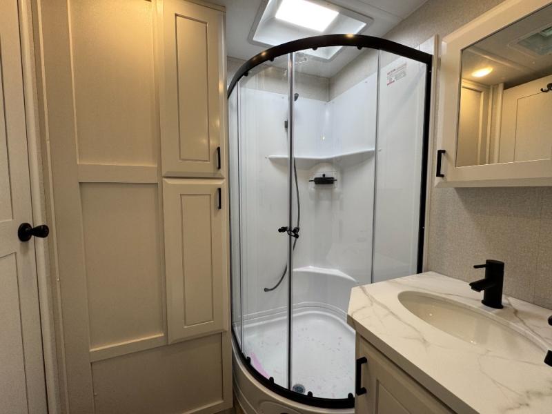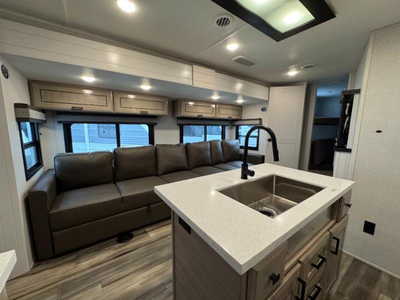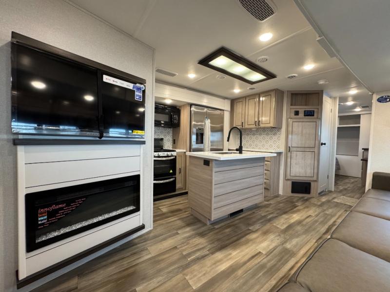 Top Tech: Includes 200W solar panels, a tankless water heater, and the TravelLINK® Smart RV system for Bluetooth control of slides and awnings.